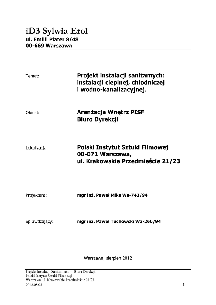 Projekt instalacji sanitarnych - Polski Instytut Sztuki Filmowej