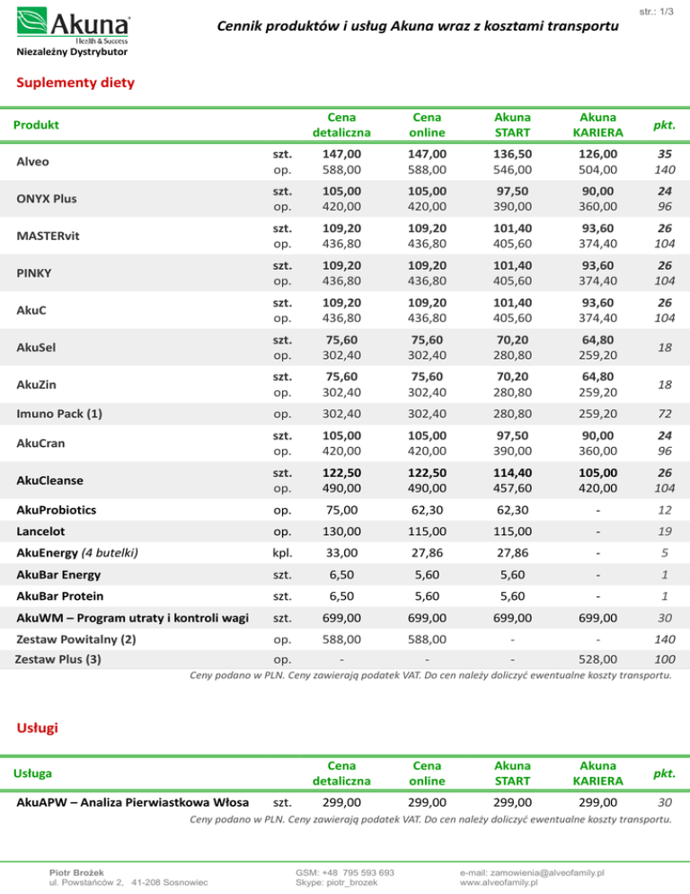 Cennik produktów i usług Akuna wraz z kosztami transportu str.: 1/3 Niezależny Dystrybutor Suplementy diety Produkt Cena detaliczna Cena online Akuna START Akuna KARIERA pkt. Alveo szt. op. 147,00 588,00 147,00 588,00 136,50 546,00 126,00 504,00 35 140 ONYX Plus szt. op. 105,00 420,00 105,00 420,00 97,50 390,00 90,00 360,00 24 96 MASTERvit szt. op. 109,20 436,80 109,20 436,80 101,40 405,60 93,60 374,40 26 104 PINKY szt. op. 109,20 436,80 109,20 436,80 101,40 405,60 93,60 374,40 26 104 AkuC szt. op. 109,20 436,80 109,20 436,80 101,40 405,60 93,60 374,40 26 104 AkuSel szt. op. 75,60 302,40 75,60 302,40 70,20 280,80 64,80 259,20 18 AkuZin szt. op. 75,60 302,40 75,60 302,40 70,20 280,80 64,80 259,20 18 Imuno Pack (1) op. 302,40 302,40 280,80 259,20 72 AkuCran szt. op. 105,00 420,00 105,00 420,00 97,50 390,00 90,00 360,00 24 96 AkuCleanse szt. op. 122,50 490,00 122,50 490,00 114,40 457,60 105,00 420,00 26 104 AkuProbiotics op. 75,00 62,30 62,30 - 12 Lancelot op. 130,00 115,00 115,00 - 19 AkuEnergy (4 butelki) kpl. 33,00 27,86 27,86 - 5 AkuBar Energy szt. 6,50 5,60 5,60 - 1 AkuBar Protein szt. 6,50 5,60 5,60 - 1 AkuWM – Program utraty i kontroli wagi szt. 699,00 699,00 699,00 699,00 30 Zestaw Powitalny (2) op. 588,00 588,00 - - 140 op. - - - 528,00 100 Zestaw Plus (3) Ceny podano w PLN. Ceny zawierają podatek VAT. Do cen należy doliczyć ewentualne koszty transportu. Usługi Usługa AkuAPW – Analiza Pierwiastkowa Włosa szt. Cena detaliczna Cena online Akuna START Akuna KARIERA pkt. 299,00 299,00 299,00 299,00 30 Ceny podano w PLN. Ceny zawierają podatek VAT. Do cen należy doliczyć ewentualne koszty transportu. Piotr Brożek ul. Powstańców 2, 41-208 Sosnowiec GSM: +48 795 593 693 Skype: piotr_brozek e-mail: [email protected] www.alveofamily.pl Cennik produktów i usług Akuna wraz z kosztami transportu str.: 2/3 Niezależny Dystrybutor BIO Kosmetyki Produkt Cena detaliczna Cena online Akuna START Akuna KARIERA pkt. BIO Szampon do włosów i ciała dla kobiet szt. 40,00 33,60 33,60 - 5 BIO Szampon do włosów i ciała dla mężczyzn szt. 40,00 33,60 33,60 - 5 BIO Szampon do włosów i ciała dla dzieci szt. 30,00 25,20 25,20 - 4 BIO Odżywka do włosów szt. 30,00 25,20 25,20 - 4 BIO Mydło w płynie do higieny intymnej szt. 30,00 25,20 25,20 - 4 BIO Mleczko do ciała dla kobiet szt. 30,00 25,20 25,20 - 4 BIO Mleczko do demakijażu szt. 30,00 25,20 25,20 - 4 BIO Tonik do demakijażu szt. 40,00 33,60 33,60 - 5 BIO Balsam do rąk szt. 30,00 25,20 25,20 - 4 BIO Balsam do ust (pomadka) szt. 29,00 24,50 24,50 - 4 BIO Balsam po goleniu szt. 50,00 42,00 42,00 - 7 BIO Krem do twarzy szt. 47,00 39,20 39,20 - 7 BIO Ziołowy krem relaksujący na skórę szt. 50,00 42,00 42,00 - 7 BIO Mydło antybakteryjne w piance szt. 40,00 33,60 33,60 - 5 HerbaCura 3 IN ONE szt. 40,00 33,60 33,60 - 5 HerbaCura WHITENING szt. 40,00 33,60 33,60 - 5 HerbaCura PINKY szt. 40,00 33,60 33,60 - 5 AkuGold - serum regenerujące ze złotem szt. 265,00 223,30 223,30 - 40 Take a Plaster op. 75,00 63,00 63,00 - 10 Zestaw START Standardowy (4) op. 370,00 370,00 - - 70 Ceny podano w PLN. Ceny zawierają podatek VAT. Do cen należy doliczyć ewentualne koszty transportu. (1) Imuno Pack – pakiet zawierający 2x AkuC, 1x AkuZin i 1x AkuSel, pozwalający zaoszczędzić do 67,20 zł w stosunku do zakupu tych produktów w pojedynczych ilościach. (2) Zestaw Powitalny – promocyjny pakiet przeznaczony dla osób nie posiadających Deklaracji Członkowskiej firmy Akuna. Pakiet zawiera 4 butelki ALVEO (smak do wyboru), rejestrację w programie konsumenckim Akuna START oraz bezpłatny transport kurierem. (3) Zestaw Plus – pakiet przeznaczony dla Menedżerów i Senior Dystrybutorów, który zawiera: 4 butelki Alveo (smak do wyboru), 1 butelkę dodatkowego produktu (do wyboru: ONYX Plus, MASTERvit, PINKY, AkuC, AkuSel lub AkuZin), transport kurierem oraz druk Deklaracji Członkowskiej – pakiet może być odsprzedany jako Zestaw Powitalny). W miesiącu można zamówić maksymalnie 7 Zestawów Plus. Zamawiając jednocześnie 7 Zestawów Plus, otrzymujesz ósmą butelkę dodatkowego produktu za 1 zł. (4) Zestaw START Standardowy – pakiet zawierający określone przez firmę produkty z programu Akuna STAR przeznaczony dla osób nie posiadających Deklaracji Członkowskiej firmy Akuna. Jego zakup upoważnia w danym miesiącu do otrzymania premii START. Pakiet zawiera: butelkę Alveo Grape, opakowanie AkuProbiotics, BIO Szamponu do włosów i ciała dla kobiet, BIO Szamponu do włosów i ciała dla mężczyzn, BIO Mleczka do ciała dla kobiet, BIO Balsamu do rąk i BIO Krem do twarzy. Piotr Brożek ul. Powstańców 2, 41-208 Sosnowiec GSM: +48 795 593 693 Skype: piotr_brozek e-mail: [email protected] www.alveofamily.pl Cennik produktów i usług Akuna wraz z kosztami transportu str.: 3/3 Niezależny Dystrybutor Transport Sklep internetowy Akuna (Cena online) Sklep internetowy Akuna (www.alveofamily.pl/sklep) – dostawa kurierem według cennika firmy Akuna. Przykładowe koszty wysyłki: 1-3 produkty butelkowe (szklane opakowania): 12 zł produkty niebutelkowe (np. BIO kosmetyki): 12 zł (bez względu na ilości zamówionych produktów) WAŻNE: Wysyłka realizowana jest po dokonaniu przedpłaty na konto firmy Akuna. Zamawiając łącznie produkty butelkowe i niebutelkowe, koszty dostawy sumują się. Zamówienia realizowane za moim pośrednictwem Zamówienia butelkowych suplementów diety (Cena detaliczna) bez względu na ilość zamawianych produktów – dostawa Pocztą Polską korzystając z usługi „PACZKA 48” (dostawa do 2 dni roboczych po dniu nadania): Przy zamówieniach poniżej 100 zł i przedpłatą na konto: 10 zł Przy zamówieniach powyżej 100 zł i przedpłatą na konto: 5 zł Przy zamówieniach poniżej 100 zł i płatności przy odbiorze: 15 zł Przy zamówieniach powyżej 100 zł i płatności przy odbiorze: 10 zł Zamówienia BIO Kosmetyków i pozostałych (niebutelkowych) suplementów diety (Cena online) –