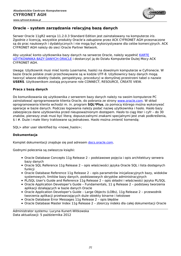 Oracle - system zarządzania relacyjną bazą danych Serwer Oracle 11gR2 wersja 11.2.0.3 Standard Edition jest zainstalowany na komputerze iris. Zgodnie z licencją, wszystkie produkty Oracle‘a zakupione przez ACK CYFRONET AGH przeznaczone są do prac naukowych i dydaktycznych i nie mogą być wykorzystywane dla celów komercyjnych. ACK CYFRONET AGH należy do sieci Oracle Partner Network. Aby uzyskać konto użytkownika bazy danych na serwerze Oracle, należy wypełnić KARTĘ UŻYTKOWNIKA BAZY DANYCH ORACLE i dostarczyć ją do Działu Komputerów Dużej Mocy ACK CYFRONET AGH. Uwaga: Użytkownik musi mieć konto (username, hasło) na dowolnym komputerze w Cyfronecie. W bazie Oracle polskie znaki przechowywane są w kodzie UTF-8. Użytkownicy bazy danych mogą tworzyć własne obiekty (tabele, perspektywy, procedury) w domyślnej przestrzeni tabel o nazwie USERS. Użytkownikom zostają przyznane role CONNECT, RESOURCE, CREATE VIEW. Praca z bazą danych Do komunikowania się użytkownika z serwerem bazy danych należy na swoim komputerze PC zainstalować oprogramowanie klienta Oracle, do pobrania ze strony www.oracle.com. W skład oprogramowania klienta wchodzi m. in. program SQL*Plus, za pomocą którego można wykonywać operacje w bazie danych. Podczas logowania należy podać nazwę użytkownika i hasło. Hasło bazy zabezpiecza dane użytkownika przed nieupoważnionym dostępem. Hasło to ciąg liter i cyfr – do 30 znaków, pierwszy znak musi być literą; dopuszczalnymi znakami specjalnymi jest znak podkreślenia, $ i #. Duże i małe litery traktowane są jednakowo. Hasło można zmienić komendą: SQL> alter user identified by <nowe_haslo>; Dokumentacja Komplet dokumentacji znajduje się pod adresem docs.oracle.com. Godnymi polecenia są zwłaszcza książki: Oracle Database Concepts 11g Release 2 – podstawowe pojęcia i opis architektury serwera bazy danych Oracle SQL Reference 11g Release 2 – opis właściwości języka Oracle SQL i lista dostępnych funkcji Oracle Database Reference 11g Release 2 – opis parametrów inicjalizacyjnych bazy, widoków systemowych, limitów bazy danych, podstawowych skryptów administracyjnych PL/SQL User‘s Guide and Reference 11g Release 2 – opis składni i właściwości języka PL/SQL Oracle Application Developer‘s Guide – Fundamentals, 11 g Release 2 – podstawy tworzenia aplikacji działających w bazie danych Oracle Oracle Application Developer‘s Guide – Large Objects (LOBs), 11g Release 2 – przewodnik tworzenia aplikacji przetwarzających duże obiekty binarne i tekstowe Oracle Database Error Messages 11g Release 2 – opis błędów Oracle Database Master Index 11g Release 2 – zbiorczy indeks dla całej dokumentacji Oracle Administrator systemu: Lucyna Kunert-Witkowska Data aktualizacji: 5 października 2012 [1] Powered by TCPDF (www.tcpdf.org)