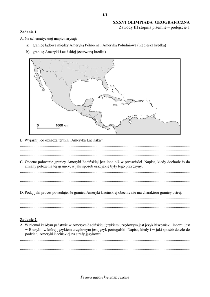 -1/1- XXXVI OLIMPIADA GEOGRAFICZNA Zawody III stopnia pisemne – podejście 1 Zadanie 1. A. Na schematycznej mapie narysuj: a) granicę lądową między Ameryką Północną i Ameryką Południową (niebieską kredką) b) granicę Ameryki Łacińskiej (czerwoną kredką) B. Wyjaśnij, co oznacza termin „Ameryka Łacińska”. ............................................................................................................................................................................... ............................................................................................................................................................................... ............................................................................................................................................................................... C. Obecne położenie granicy Ameryki Łacińskiej jest inne niż w przeszłości. Napisz, kiedy dochodziło do zmiany położenia tej granicy, w jaki sposób oraz jakie były tego przyczyny. ............................................................................................................................................................................... ............................................................................................................................................................................... ............................................................................................................................................................................... ............................................................................................................................................................................... D. Podaj jaki proces powoduje, że granica Ameryki Łacińskiej obecnie nie ma charakteru granicy ostrej. ............................................................................................................................................................................... ............................................................................................................................................................................... ............................................................................................................................................................................... Zadanie 2. A. W niemal każdym państwie w Ameryce Łacińskiej językiem urzędowym jest język hiszpański. Inaczej jest w Brazylii, w której językiem urzędowym jest język portugalski. Napisz, kiedy i w jaki sposób doszło do podziału Ameryki Łacińskiej na strefy językowe. ............................................................................................................................................................................... ............................................................................................................................................................................... ............................................................................................................................................................................... ............................................................................................................................................................................... Prawa autorskie zastrzeżone -1/2- B. Podaj nazwę państwa (nie terytorium zależnego) w Ameryce Łacińskiej, w którym językiem urzędowym jest: a) język francuski: ....................................................................................................................................... b) język holenderski: ................................................................................................................................... c) język angielski (państwo kontynentalne, nie wyspiarskie): .................................................................... Zadanie 3. Rozpoznaj ujścia rzek Ameryki Łacińskiej przedstawione na schematycznych mapach. Wpisz w odpowiednie miejsce w tabeli nazwy rzek oraz nazwy miast leżących w pobliżu ich ujścia (miasta na mapie oznaczono czarnymi kropkami). Uwaga! Wszystkie mapy wykonano w jednakowej skali. Orientacja map została zmieniona. Mapa A B C D E Rzeka Miasto Zadanie 4. A. Wśród wymienionych niżej roślin podkreśl te, które pochodzą wyłącznie z Ameryki Łacińskiej. Uwaga! Za udzielenie złych odpowiedzi będą przyznawane punkty ujemne. ananas, banan, dynia, juta, kakaowiec, kauczukowiec, kawa, kukurydza, maniok, papryka, pomidor, ryż, trzcina cukrowa, wanilia, ziemniak B. Wśród wymienionych niżej zwierząt podkreśl te, które występują w warunkach naturalnych jedynie w Ameryce Południowej (endemity). Uwaga! Za udzielenie złych odpowiedzi będą przyznawane punkty ujemne. anakonda, alpaka, boa, dingo, dromader, emu, grizzly, guanaco (gwanako), jak, kapibara kapucynka, kojot, kondor, lampart, mamba, mrówkojad, pirania, świnka morska, tukan, wyjec Prawa autorskie zastrzeżone -1/3- Zadanie 5. Na schematycznej mapie narysuj równik (niebieską kredką) i Zwrotnik Koziorożca (czerwoną kredką). Uwaga! Ponieważ mapa została wykonana w odwzorowaniu azymutalnym ukośnym, żaden z równoleżników nie będzie na niej linią prostą. Zadanie 6. Poniżej każdego opisu formacji roślinnej w Ameryce Południowej wpisz jej nazwę oraz cyfrę, którą na mapie oznaczono obszar jej występowania. Nazwy formacji wybierz spośród następujących: chaco, catinga, dżungla, llanos, makia, pampa, pantanal, paramo, puna, selva A. Na równinie akumulacyjnej, często zalewanej przez powodzie, rośnie wilgotna sawanna. Duży udział na tym obszarze ma też roślinność bagienna i wodna. W nieco suchszych siedliskach występują zagajniki z potężnymi drzewami. nazwa formacji roślinnej: ............ pantanal ............ obszar występowania: .................. 5 .................. B. Na wilgotnej