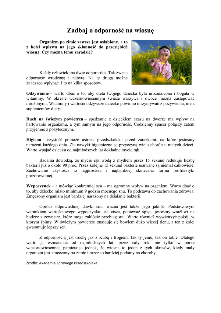Zadbaj o odporność na wiosnę Organizm po zimie zawsze jest osłabiony, a to z kolei wpływa na jego skłonność do przeziębień wiosną. Czy można temu zaradzić? Każdy człowiek ma dwie odporności. Tak zwaną odporność wrodzoną i nabytą. Na tę drugą można znacząco wpłynąć. I to na kilka sposobów. Odżywianie – warto dbać o to, aby dieta twojego dziecka była urozmaicona i bogata w witaminy. W okresie wczesnowiosennym świeże warzywa i owoce można zastępować mrożonymi. Witaminy i wartości odżywcze dziecko powinno otrzymywać z pożywienia, nie z suplementów diety. Ruch na świeżym powietrzu – spędzanie z dzieckiem czasu na dworze ma wpływ na hartowanie organizmu, a tym samym na jego odporność. Codzienny spacer połączy zatem przyjemne z pożytecznym. Higiena – czystość pomoże ustrzec przedszkolaka przed zarazkami, na które jesteśmy narażeni każdego dnia. Złe nawyki higieniczne są przyczyną wielu chorób u małych dzieci. Warto wpajać dziecku od najmłodszych lat dokładne mycie rąk. Badania dowodzą, że mycie rąk wodą z mydłem przez 15 sekund redukuje liczbę bakterii już o około 90 proc. Przez kolejne 15 sekund bakterie usuwane są niemal całkowicie. Zachowanie czystości to najprostsza i najbardziej skuteczna forma profilaktyki prozdrowotnej. Wypoczynek – a mówiąc konkretniej sen – ma ogromny wpływ na organizm. Warto dbać o to, aby dziecko miało minimum 9 godzin mocnego snu. To podstawa do zachowania zdrowia. Zmęczony organizm jest bardziej narażony na działanie bakterii. Oprócz odpowiedniej dawki snu, ważna jest także jego jakość. Podstawowym warunkiem wartościowego wypoczynku jest cisza, ponieważ śpiąc, jesteśmy wrażliwi na bodźce z zewnątrz, które mogą zakłócić przebieg snu. Warto również wywietrzyć pokój, w którym śpimy. W świeżym powietrzu znajduje się bowiem dużo więcej tlenu, a ten z kolei gwarantuje lepszy sen. Z odpornością jest trochę jak z Kubą i Bogiem. Jak ty jemu, tak on tobie. Dlatego warto ją wzmacniać od najmłodszych lat, przez cały rok, nie tylko w porze wczesnowiosennej, pamiętając jednak, że wiosna to jeden z tych okresów, kiedy mały organizm jest zmęczony po zimie i przez to bardziej podatny na choroby. Źródło: Akademia Zdrowego Przedszkolaka