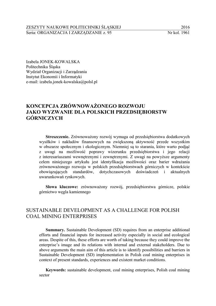 ZESZYTY NAUKOWE POLITECHNIKI ŚLĄSKIEJ Seria: ORGANIZACJA I ZARZĄDZANIE z. 95 2016 Nr kol. 1961 Izabela JONEK-KOWALSKA Politechnika Śląska Wydział Organizacji i Zarządzania Instytut Ekonomii i Informatyki e-mail: [email protected] KONCEPCJA ZRÓWNOWAŻONEGO ROZWOJU JAKO WYZWANIE DLA POLSKICH PRZEDSIĘBIORSTW GÓRNICZYCH Streszczenie. Zrównoważony rozwój wymaga od przedsiębiorstwa dodatkowych wysiłków i nakładów finansowych na zwiększoną aktywność przede wszystkim w obszarze społecznym i ekologicznym. Niemniej są to starania, które warto podjąć z uwagi na możliwość poprawy wizerunku przedsiębiorstwa i jego relacji z interesariuszami wewnętrznymi i zewnętrznymi. Z uwagi na powyższe argumenty celem niniejszego artykułu jest identyfikacja możliwości oraz barier wdrażania zrównoważonego rozwoju w polskich przedsiębiorstwach górniczych w kontekście obowiązujących standardów, dotychczasowych doświadczeń i aktualnych uwarunkowań rynkowych. Słowa kluczowe: zrównoważony rozwój, przedsiębiorstwa górnicze, polskie górnictwo węgla kamiennego SUSTAINABLE DEVELOPMENT AS A CHALLENGE FOR POLISH COAL MINING ENTERPRISES Summary. Sustainable Development (SD) requires from an enterprise additional efforts and financial inputs for increased activity especially in social and ecological areas. Despite of this, these efforts are worth of taking because they could improve the enterprise’s image and its relations with internal and external stakeholders. Due to above arguments the main aim of this article is to identify possibilities and barriers in Sustainable Development (SD) implementation in Polish coal mining enterprises in context of present standards, experiences and existent market conditions. Keywords: sustainable development, coal mining enterprises, Polish coal mining sector 132 I. Jonek-Kowalska 1. Wprowadzenie W koncepcji zrównoważonego rozwoju do priorytetów ekonomicznych dodaje się cele etyczne, społeczne i ekologiczne, zakładając, że jedynie ich współrealizacja może zapewnić społeczeństwom i ludzkości przetrwanie w długim horyzoncie czasowym 1. Takie podejście jest logiczne i racjonalne również z ekonomicznego punktu widzenia, ponieważ wyłącznie rozsądne gospodarowanie zasobami może zapewnić odpowiednie warunki życiowe przyszłym pokoleniom. Niemniej jednak przedsiębiorstwa i instytucje życia gospodarczego funkcjonujące w gospodarce rynkowej od lat są przyzwyczajone do prymatu efektywności ekonomicznej nad efektywnością społeczną czy ekologiczną2. Dlatego też skuteczne, a nie tylko wizerunkowe wdrażanie koncepcji zrównoważonego rozwoju w przedsiębiorstwach i instytucjach komercyjnych jest zadaniem niezwykle skomplikowanym i czasochłonnym. W niektórych branżach dodatkowo komplikuje je szereg specyficznych uwarunkowań sektorowych. Do takich branż niewątpliwie można zaliczyć te, które ponadprzeciętnie degradują środowisko naturalne, czy też ponadprzeciętnie narażają zdrowie i życie zatrudnionych w nich pracowników oraz społeczności lokalnych i regionalnych. Mając na uwadze powyższe okoliczności, w niniejszym artykule rozpatruje się koncepcję zrównoważonego rozwoju jako wyzwanie dla polskich przedsiębiorstw górniczych. Głównym celem prowadzonych w tym zakresie rozważań jest identyfikacja możliwości oraz barier wdrażania zrównoważonego rozwoju w polskich przedsiębiorstwach górniczych w kontekście obowiązujących standardów, dotychczasowych doświadczeń i aktualnych uwarunkowań rynkowych. By tak postawiony cel zrealizować, w pierwszej części artykułu przedstawiono krótki przegląd literatury z zakresu problematyki zrównoważonego rozwoju. Następnie przedstawiono standardy obowiązujące w zakresie wdrażania tej koncepcji w przedsiębiorstwach górniczych. Na kanwie ogólnych rozważań przeprowadzono analizę możliwości i barier wdrożenia zrównoważonego rozwoju w polskich przedsiębiorstwach górniczych. W artykule wykorzystano krajowe i zagraniczne studia literaturowe z zakresu wdrażania koncepcji zrównoważonego rozwoju w przedsiębiorstwach górniczych. Posłużono się analizą międzynarodowych standardów wdrażania SD oraz danymi statystycznymi dotyczącymi funkcjonowania polskich przedsiębiorstw górniczych. W podsumowaniu zawarto wskazówki pod adresem uskutecznienia procesu wdrażania koncepcji zrównoważonego rozwoju w polskim górnictwie węgla kamiennego. 1 2 Szerzej: Kuzior A., Kiepas A., Leks-Bujak E.: Zrównoważony rozwój. M-Studio, Katowice 2001; Kuzior A.: Zrównoważony rozwój w edukacji ekologicznej, [w:] Papuziński A.: Zrównoważony rozwój. Od utopii do praw człowieka. Oficyna Wydawnicza Branta, Bydgoszcz 2005, s. 279-293. Por. Zieliński M.: Efektywność – ujęcie ekonomiczne i społeczne. Zeszyty Naukowe, s. Organizacja i Zarządzanie, z. 66. Politechnika Śląska, Gliwice 2013, s. 15-25; Zieliński M.: Korzyści z wdrożenia koncepcji CSR w zarządzaniu zasobami ludzkimi. Zeszyty Naukowe, s. Organizacja i Zarządzanie, z. 74. Politechnika Śląska, Gliwice 2014, s. 653-663. Koncepcja zrównoważonego rozwoju… 133 2. Koncepcja zrównoważonego rozwoju w świetle literatury przedmiotu Koncepcja zrównoważonego rozwoju powstała na przełomie lat sześćdziesiątych i siedemdziesiątych XX wieku i została rozwinięta w 1992 roku na Szczycie Ziemi w Rio de Janeiro, gdzie w Agendzie 21 ustalono podstawy jej kluczowych założeń. W XXI wieku koncepcja ta była systematycznie rozwijana i propagowana, między innymi na forum Organizacji Narodów Zjednoczonych oraz UNESCO. Propagatorzy idei zrównoważonego rozwoju stawiali sobie za cel wzrost poziomu życia ludności, zahamowanie degradacji środowiska naturalnego oraz powstrzymanie rozprzestrzeniania się chorób zakaźnych, w tym przede wszystkim AIDS3. U podstaw tej koncepcji niewątpliwie znalazła się idea równości społecznej, konieczność ochrony ekosystemów