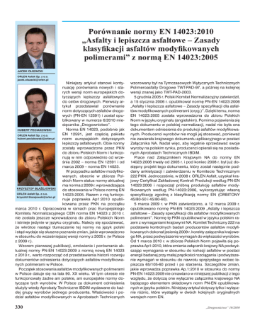 Porównanie normy EN 14023:2010 „Asfalty i lepiszcza asfaltowe – Zasady klasyfikacji asfaltów modyfikowanych polimerami” z normą EN 14023:2005 JACEK OLSZACKI ORLEN Asfalt Sp. z o.o. [email protected] Niniejszy artykuł stanowi kontynuację porównania nowych i starych wersji norm europejskich dotyczących lepiszczy asfaltowych do celów drogowych. Pierwszy artykuł przedstawiał porównanie norm dotyczących asfaltów drogowych (PN-EN 12591) i został opublikowany w numerze 6/2010 miesięcznika „Drogownictwo”. Norma EN 14023, podobnie jak HUBERT PECIAKOWSKI EN 12591, jest częścią pakietu ORLEN Asfalt Sp. z o.o. [email protected] norm europejskich dotyczących lepiszczy asfaltowych. Obie normy zostały wprowadzone przez PKN do zbioru Polskich Norm i funkcjonują w nim odpowiednio od września 2002 – norma EN 12591 i od marca 2009 – norma EN 14023. W przypadku asfaltów modyfikowanych, obecnie w zbiorze Polskich Norm status normy aktualnej ma norma z 2009 r. wprowadzająca KRZYSZTOF BŁAŻEJOWSKI do stosowania w Polsce normę EN ORLEN Asfalt Sp. z o.o. 14023:2005. Razem z nią [email protected] nuje poprawka Ap1:2010 opublikowana przez PKN na początku marca 2010 r. Opracowana w ramach prac Europejskiego Komitetu Normalizacyjnego CEN norma EN 14023 z 2010 r. nie została jeszcze wprowadzona do zbioru Polskich Norm i istnieje jedynie w języku oryginału. Należy się spodziewać, że wkrótce nastąpi tłumaczenie tej normy na język polski i stąd wydaje się słuszne poznanie zmian, jakie wprowadzono w stosunku do wcześniejszej wersji normy z 2005 r. (w Polsce z 2009 r.). Wzorem pierwszej publikacji, omówienie i porównanie aktualnej normy PN-EN 14023:2009 z normą nową EN 14023 z 2010 r., warto rozpocząć od przedstawienia historii rozwoju dokumentów odniesienia dotyczących asfaltów modyfikowanych polimerami w Polsce. Początek stosowania asfaltów modyfikowanych polimerami w Polsce datuje się na lata 90. XX wieku. W tym okresie nie funkcjonowały żadne ani polskie, ani europejskie normy dotyczące tych wyrobów. W Polsce za dokument odniesienia służyły wtedy Aprobaty Techniczne IBDiM wydawane do każdej grupy wyrobów jednego producenta. Właściwości i podział asfaltów modyfikowanych w Aprobatach Technicznych 330 wzorowany był na Tymczasowych Wytycznych Technicznych Polimeroasfalty Drogowe TWT-PAD-97, a później na kolejnej wersji znanej jako TWT-PAD-2003. 5 grudnia 2005 r. Polski Komitet Normalizacyjny zatwierdził, a 15 stycznia 2006 r. opublikował normę PN-EN 14023:2006 „Asfalty i lepiszcza asfaltowe – Zasady specyfikacji dla asfaltów modyfikowanych polimerami (oryg.)”. Dzięki temu, norma EN 14023:2005 została wprowadzona do zbioru Polskich Norm w języku oryginału (angielskim). Pomimo pojawienia się tego dokumentu w polskiej normalizacji, nadal nie była ona dokumentem odniesienia do produkcji asfaltów modyfikowanych. Producenci wyrobów nie mogli jej stosować, ponieważ nie zawierała krajowego dokumentu aplikacyjnego w postaci Załącznika NA. Nadal więc, aby legalnie sprzedawać swoje wyroby na polskim rynku, producenci opierali się na posiadanych Aprobatach Technicznych IBDiM. Prace nad Załącznikiem Krajowym NA do normy EN 14023:2006 trwały od 2005 r. i pod koniec 2008 r. był już dostępny projekt tego dokumentu, który został następnie poddany ankietyzacji i zatwierdzeniu w Komitecie Technicznym 222 PKN. Jednocześnie, w 2008 r. ORLEN Asfalt, uzyskał krajowy Certyfikat Zakładowej Kontroli Produkcji według PN-EN 14023:2006 i rozpoczął próbną produkcję asfaltów modyfikowanych według PN-14023:2006, wykorzystując własną specyfikację zgodną z klasyfikacją normy EN (ORBITONY 45/80-50 i 45/80-60). 5 marca 2009 r. w PKN zatwierdzono, a 12 marca 2009 r. opublikowano normę PN-EN 14023:2009 „Asfalty i lepiszcza asfaltowe – Zasady specyfikacji dla asfaltów modyfikowanych polimerami”. Normę tę PKN opublikował w języku polskim razem z wymaganiami krajowymi NA. Komitet Techniczny 222 na podstawie kontrolnych badań producentów asfaltów modyfikowanych dokonał jesienią 2009 r. korekty załącznika krajowego NA, przez podwyższenie wymagań do większości wyrobów. Od 1 marca 2010 r. w zbiorze Polskich Norm pojawiła się poprawka Ap1:2010, która zmienia załącznik krajowy NA podwyższając wymagania w stosunku do kohezji asfaltów w postaci energii badanej przy małej prędkości rozciągania i podwyższenie wymagań w stosunku do nawrotu sprężystego wobec lepiszcza 65/105-60 przed i po starzeniu. Szczegółów zmian, jakie wprowadza poprawka Ap.1:2010 w stosunku do normy PN-EN 14023:2009 nie omawiano w niniejszej publikacji z tego względu, że dotyczą one wyłącznie załącznika krajowego NA będącego elementem składowym norm PN-EN opublikowanych w języku polskim. Niniejszy artykuł dotyczy tylko i wyłącznie różnic, które wystąpiły w dwóch kolejnych oryginalnych wersjach norm EN. „Drogownictwo” 10/2010 Zgodnie z praktyką CEN, po pięciu latach funkcjonowania normy dokonywany jest jej przegląd i ewentualna nowelizacja. W ten sposób EN 14023:2005, która została wprowadzona do zbioru PN jako PN-EN 14023:2009, została zmieniona i opublikowana jako EN 14023:2010. Norma ta zawiera zmiany w stosunku do wersji poprzedniej, będące efektem pięciu lat doświadczeń krajów członkowskich stosujących asfalty modyfikowane na swoich obszarach w oparciu o tą normę. Norma EN z 2010 r. nie jest jeszcze wprowadzona przez Polski Komitet Normalizacyjny do zbioru Polskich Norm ani w języku polskim, ani w języku oryginału. Uczynienie tego w środku sezonu produkcyjnego spowodowałoby anulowanie posiadanych przez producentów certyfikatów ZKP i faktyczne okresowe zatrzymanie produkcji. Zgodnie z zasadami CEN Polska ma 6 miesięcy na wprowadzenie normy EN 14023:2010 do zbioru Polskich Norm i wycofanie PN-EN 14023:2009. Dlatego do jesieni 2010 r. musi zostać opracowana polska wersja PN-