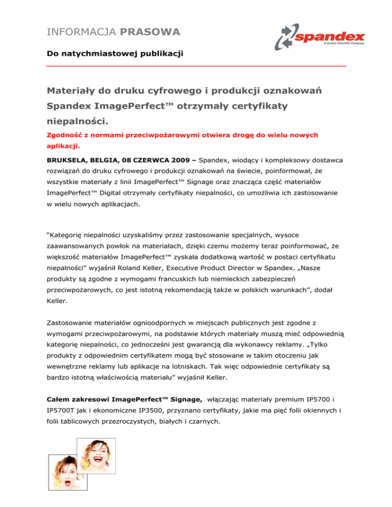 INFORMACJA PRASOWA Do natychmiastowej publikacji Materiały do druku cyfrowego i produkcji oznakowań Spandex ImagePerfect™ otrzymały certyfikaty niepalności. Zgodność z normami przeciwpożarowymi otwiera drogę do wielu nowych aplikacji. BRUKSELA, BELGIA, 08 CZERWCA 2009 – Spandex, wiodący i kompleksowy dostawca rozwiązań do druku cyfrowego i produkcji oznakowań na świecie, poinformował, że wszystkie materiały z linii ImagePerfect™ Signage oraz znacząca część materiałów ImagePerfect™ Digital otrzymały certyfikaty niepalności, co umożliwia ich zastosowanie w wielu nowych aplikacjach. “Kategorię niepalności uzyskaliśmy przez zastosowanie specjalnych, wysoce zaawansowanych powłok na materiałach, dzięki czemu możemy teraz poinformować, że większość materiałów ImagePerfect™ zyskała dodatkową wartość w postaci certyfikatu niepalności” wyjaśnił Roland Keller, Executive Product Director w Spandex. „Nasze produkty są zgodne z wymogami francuskich lub niemieckich zabezpieczeń przeciwpożarowych, co jest istotną rekomendacją także w polskich warunkach”, dodał Keller. Zastosowanie materiałów ognioodpornych w miejscach publicznych jest zgodne z wymogami przeciwpożarowymi, na podstawie których materiały muszą mieć odpowiednią kategorię niepalności, co jednocześni jest gwarancją dla wykonawcy reklamy. „Tylko produkty z odpowiednim certyfikatem mogą być stosowane w takim otoczeniu jak wewnętrzne reklamy lub aplikacje na lotniskach. Tak więc odpowiednie certyfikaty są bardzo istotną właściwością materiału” wyjaśnił Keller. Całem zakresowi ImagePerfect™ Signage, włączając materiały premium IP5700 i IP5700T jak i ekonomiczne IP3500, przyznano certyfikaty, jakie ma pięć folii okiennych i folii tablicowych przezroczystych, białych i czarnych. Your partner in digital print. SPANDEX GROUP Excelsiorlaan 55 B-1930 Zaventem, Belgium Tel: +32 27 25 73 70 Fax: +32 27 16 76 40 www.spandex.com INFORMACJA PRASOWA Do natychmiastowej publikacji Pośród materiałów ImagePerfect™ Digital, część z najpopularniejszych folii, w tym IP2503, IP2515 i IP2516 oraz tekstylny baner IP2309, także otrzymało certyfikat niepalności. „ImagePerfect™ oferuje teraz materiały z kategorią niepalności we wszystkich grupach produktów, włączając winyle, materiały specjalne, banery, tekstylia, siatki, papiery i backlit. Dzięki temu ImagePerfect™ jest idealnym wyborem by sprostać oczekiwaniom drukarzy i producentów oznakowań” powiedział Keller. Materiały ImagePerfect™ Signage i Digital są dystrybuowane w Europie wyłącznie przez Spandex. Więcej informacji można uzyskać na stronie www.spandex.com Koniec O Spandex – Spandex jest spółką zależną Gerber Scientific Inc., globalnego lidera w dostarczaniu kompleksowych rozwiązań dla signmakingu, druku cyfrowego oraz firm tworzących specjalistyczne grafiki. Reprezentując wiodących producentów i marki, Spandex obsługuje ponad 31,000 klientów w ponad 17 krajach, zapewniając najszerszą ofertę produktów i usług na rynku. Celem Spandex, firmy specjalizującej się w marketingu, sprzedaży, dystrybucji i wsparciu dla firmy z branży druku cyfrowego oraz wycinania, jest dostarczanie klientom najwyższej jakości produktów każdego dnia w roku. Więcej informacji o Spandex oraz proponowanych przez firmę rozwiązaniach dostępnych jest na stronie www.spandex.com. GERBER SCIENTIFIC jest wiodącym światowym dostawcą zaawansowanych systemów produkcyjnych do signmakingu i specjalistycznych grafik, materiałów, obróbki szkieł optycznych oraz dla przemysłu produkcji materiałów elastycznych i odzieżowych. Siedziba firmy mieści się w South Windsor w Connecticut. Firma notowana jest na Nowojorskiej Giełdzie Papierów Wartościowych (NYSE: GRB). W skład firmy wchodzą: Gerber Scientific Products, Spandex Ltd., Gerber Technology, and Gerber Coburn. Wszystkie wymienione znaki towarowe są własnością ich właścicieli. Więcej informacji można uzyskać od: Jonathan Wake AD Communications T: +33 4 79 34 87 71 [email protected] Tomasz Kopacz Grappaart T: +48 601 709 101 [email protected] Your partner in digital print. Jan Murin Spandex, s.r.o. Tel.: +421 2 3333 55 65 [email protected] SPANDEX GROUP Excelsiorlaan 55 B-1930 Zaventem, Belgium Tel: +32 27 25 73 70 Fax: +32 27 16 76 40 www.spandex.com