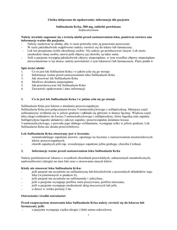 Ulotka dołączona do opakowania: informacja dla pacjenta Sulfasalazin Krka, 500 mg, tabletki powlekane Sulfasalazinum Należy uważnie zapoznać się z treścią ulotki przed zastosowaniem leku, ponieważ zawiera ona informacje ważne dla pacjenta. Należy zachować tę ulotkę, aby w razie potrzeby móc ją ponownie przeczytać. W razie jakichkolwiek wątpliwości należy zwrócić się do lekarz lub farmaceuty. - Lek ten przepisano ściśle określonej osobie. Nie należy go przekazywać innym. Lek może zaszkodzić innej osobie, nawet jeśli objawy jej choroby są takie same. Jeśli u pacjenta wystąpią jakiekolwiek objawy niepożądane, w tym wszelkie objawy niepożądane niewymienione w tej ulotce, należy powiedzieć o tym lekarzowi lub farmaceucie. Patrz punkt 4. Spis treści ulotki 1. Co to jest lek Sulfasalzin Krka i w jakim celu się go stosuje 2. Informacje ważne przed zastosowaniem leku Sulfasalazin Krka 3. Jak stosować lek Sulfasalazin Krka 4. Możliwe działania niepożądane 5. Jak przechowywać lek Sulfasalazin Krka 6. Zawartość opakowania i inne informacje 1. Co to jest lek Sulfasalazin Krka i w jakim celu się go stosuje Sulfasalazin Krka jest lekiem o działaniu przeciwzapalnym. Sulfasalazin Krka jest połączeniem kwasu 5-aminosalicylowego z sulfapirydyną. Mniejsza część sulfasalazyny wchłania się w jelicie grubym i odkłada się głównie w tkance łącznej. Większa część leku ulega rozkładowi do kwasu 5-aminosalicylowego i sulfapirydyny, które łagodzą stan zapalny. Sulfapirydyna łagodzi układowy odczyn zapalny; przeciwzapalne działanie kwasu 5-aminosalicylowego, z powodu jego słabego wchłaniania, występuje tylko w jelicie grubym. Lek Sulfasalazin Krka nie działa przeciwbólowo. Lek Sulfasalazin Krka stosowany jest w leczeniu: reumatoidalnego zapalenia stawów, opornego na leczenie z zastosowaniem niesteroidowych leków przeciwzapalnych, chorób zapalnych jelit (np. wrzodziejące zapalenie jelita grubego, choroba Crohna). 2. Informacje ważne przed zastosowaniem leku Sulfasalazin Krka Należy poinformować lekarza o wszelkich chorobach przewlekłych, zaburzeniach metabolicznych, nadwrażliwości (alergii) na inne leki oraz o stosowaniu innych leków. Kiedy nie stosować leku Sulfasalazin Krka: jeśli pacjent ma uczulenie na sulfasalazynę lub którykolwiek z pozostałych składników tego leku (wymienionych w punkcie 6), jeśli pacjent ma uczulenie na sulfonamidy i salicylany, jeśli u pacjenta występuje porfiria ostra przerywana, porfiria mieszana, jeśli u pacjenta występuje niedrożność dróg moczowych lub jelit, u dzieci w wieku poniżej 2 lat. Ostrzeżenia i środki ostrożności Przed rozpoczęciem stosowania leku Sulfasalazin Krka należy zwrócić się do lekarza lub farmaceuty jeśli: u pacjenta występuje ciężka alergia i (lub) astma oskrzelowa; 1 - u pacjenta występuje niedobór dehydrogenazy glukozo-6-fosforanowej, ponieważ może ona powodować niedokrwistość hemolityczną; u pacjenta występują zaburzenia czynności nerek lub wątroby, lub nieprawidłowy skład krwi. Podczas stosowania należy pić dużo płynów ze względu na możliwość tworzenia się kamieni nerkowych. Przed rozpoczęciem leczenia lekarz może zalecić kontrolne badanie krwi, w tym rozmaz krwinek białych i badania czynności wątroby, a następnie powtarzać te badania co 2 tygodnie w czasie pierwszych 3 miesięcy leczenia. Przez okres kolejnych 3 miesięcy należy przeprowadzać badania kontrolne co 4 tygodnie, a następnie co 3 miesiące oraz w sytuacjach, gdy jest to wskazane ze względów klinicznych. Ocena czynności nerek (w tym analiza moczu) powinna być przeprowadzana u wszystkich pacjentów na początku leczenia, jak również przynajmniej raz w miesiącu przez pierwsze 3 miesiące leczenia. Następnie kontrola powinna być przeprowadzona, gdy jest to wskazane ze względów klinicznych. Wystąpienie objawów klinicznych takich, jak: ból gardła, gorączka, bladość, plamica oraz żółtaczka podczas leczenia sulfasalazyną może wskazywać na zahamowanie czynności szpiku, hemolizę oraz hepatotoksyczność. Leczenie sulfasalazyną należy przerwać w czasie oczekiwania na wyniki badań krwi. Podczas stosowania leku Sulfasalazin Krka obserwowano wysypki skórne potencjalnie zagrażające życiu (złuszczające zapalenie skóry, zespół Stevensa-Johnsona, martwica toksyczno-rozpływna naskórka), które początkowo mają kształt zaczerwienionych zmian o typie tarczy strzelniczej lub okrągłych plam, często z centralnie położonymi pęcherzami. Mogą wystąpić objawy dodatkowe, np. owrzodzenie jamy ustnej, gardła, nosa, narządów płciowych oraz zapalenie spojówek (zaczerwienione i opuchnięte oczy). Tym groźnym dla życia wysypkom skórnym często towarzyszą objawy grypopodobne. W dalszym rozwoju wysypki mogą pojawiać się rozległe pęcherze lub złuszczanie dużych powierzchni naskórka. Największe ryzyko wystąpienia poważnych reakcji skórnych istnieje w pierwszych tygodniach leczenia. Jeśli u pacjenta wystąpi zespół Stevensa-Johnsona lub martwica toksyczno-rozpływna naskórka podczas stosowania leku Sulfasalazin Krka, nie wolno już nigdy ponownie podejmować leczenia tym lekiem. Jeśli u pacjenta wystąpi wysypka, zaburzenia śluzówkowe, inne objawy nadwrażliwości, lub wymienione objawy skórne, należy niezwłocznie skonsultować się z lekarzem i powiedzieć mu o stosowaniu tego leku. Podczas stosowania leku Sulfasalazin Krka odnotowano ciężkie, zagrażające życiu reakcje nadwrażliwości ogólnej, takie jak osutka polekowa z eozynofilią (zwiększenie liczby pewnego rodzaju krwinek białych - granulocytów kwasochłonnych we krwi) i objawami ogólnymi (ang. DRESS). Należy mieć na uwadze, że wczesne objawy nadwrażliwości mogą się pojawić, nawet jeśli wysypka nie jest obecna. Sulfasalazin Krka a inne leki Należy powiedzieć lekarzowi lub farmaceucie o wszystkich lekach przyjmowanych przez p