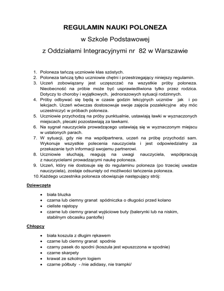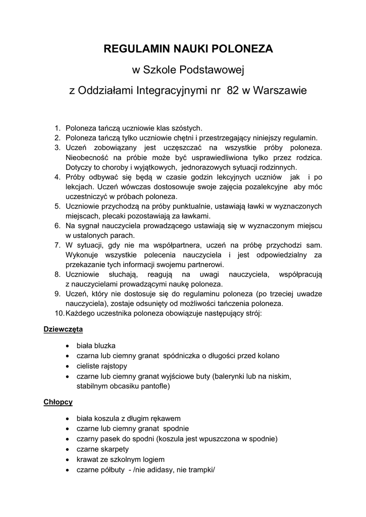 REGULAMIN NAUKI POLONEZA w Szkole Podstawowej z Oddziałami Integracyjnymi nr 82 w Warszawie 1. Poloneza tańczą uczniowie klas szóstych. 2. Poloneza tańczą tylko uczniowie chętni i przestrzegający niniejszy regulamin. 3. Uczeń zobowiązany jest uczęszczać na wszystkie próby poloneza. Nieobecność na próbie może być usprawiedliwiona tylko przez rodzica. Dotyczy to choroby i wyjątkowych, jednorazowych sytuacji rodzinnych. 4. Próby odbywać się będą w czasie godzin lekcyjnych uczniów jak i po lekcjach. Uczeń wówczas dostosowuje swoje zajęcia pozalekcyjne aby móc uczestniczyć w próbach poloneza. 5. Uczniowie przychodzą na próby punktualnie, ustawiają ławki w wyznaczonych miejscach, plecaki pozostawiają za ławkami. 6. Na sygnał nauczyciela prowadzącego ustawiają się w wyznaczonym miejscu w ustalonych parach. 7. W sytuacji, gdy nie ma współpartnera, uczeń na próbę przychodzi sam. Wykonuje wszystkie polecenia nauczyciela i jest odpowiedzialny za przekazanie tych informacji swojemu partnerowi. 8. Uczniowie słuchają, reagują na uwagi nauczyciela, współpracują z nauczycielami prowadzącymi naukę poloneza. 9. Uczeń, który nie dostosuje się do regulaminu poloneza (po trzeciej uwadze nauczyciela), zostaje odsunięty od możliwości tańczenia poloneza. 10. Każdego uczestnika poloneza obowiązuje następujący strój: Dziewczęta biała bluzka czarna lub ciemny granat spódniczka o długości przed kolano cieliste rajstopy czarne lub ciemny granat wyjściowe buty (balerynki lub na niskim, stabilnym obcasiku pantofle) Chłopcy biała koszula z długim rękawem czarne lub ciemny granat spodnie czarny pasek do spodni (koszula jest wpuszczona w spodnie) czarne skarpety krawat ze szkolnym logiem czarne półbuty - /nie adidasy, nie trampki/