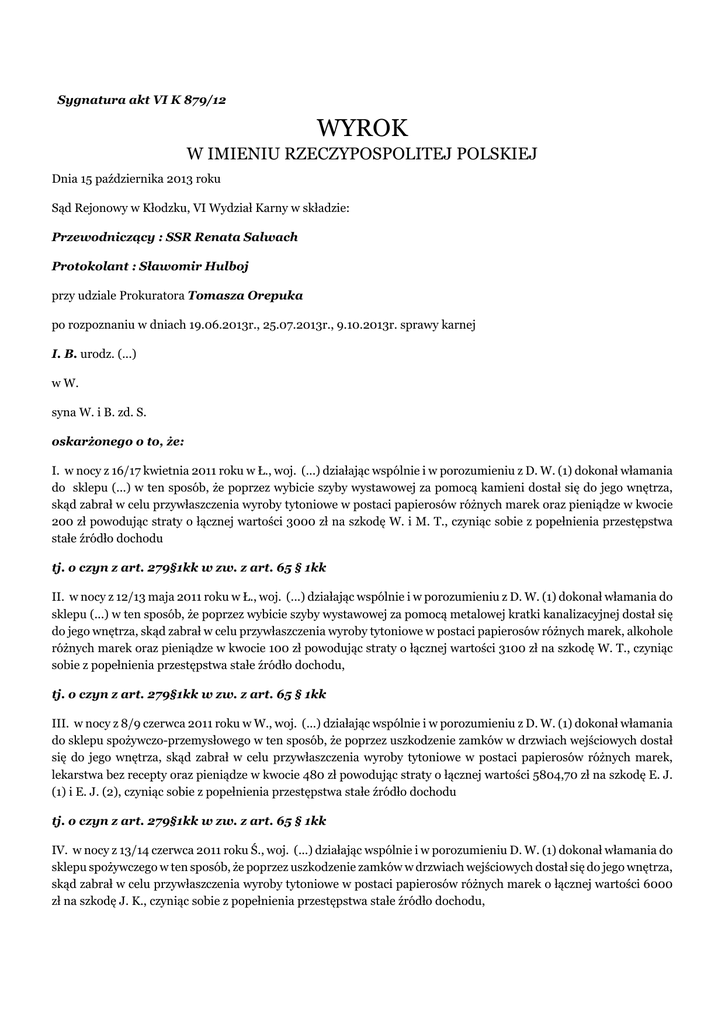 Sygnatura akt VI K 879/12 WYROK W IMIENIU RZECZYPOSPOLITEJ POLSKIEJ Dnia 15 października 2013 roku Sąd Rejonowy w Kłodzku, VI Wydział Karny w składzie: Przewodniczący : SSR Renata Salwach Protokolant : Sławomir Hulboj przy udziale Prokuratora Tomasza Orepuka po rozpoznaniu w dniach 19.06.2013r., 25.07.2013r., 9.10.2013r. sprawy karnej I. B. urodz. (...) w W. syna W. i B. zd. S. oskarżonego o to, że: I. w nocy z 16/17 kwietnia 2011 roku w Ł., woj. (...) działając wspólnie i w porozumieniu z D. W. (1) dokonał włamania do sklepu (...) w ten sposób, że poprzez wybicie szyby wystawowej za pomocą kamieni dostał się do jego wnętrza, skąd zabrał w celu przywłaszczenia wyroby tytoniowe w postaci papierosów różnych marek oraz pieniądze w kwocie 200 zł powodując straty o łącznej wartości 3000 zł na szkodę W. i M. T., czyniąc sobie z popełnienia przestępstwa stałe źródło dochodu tj. o czyn z art. 279§1kk w zw. z art. 65 § 1kk II. w nocy z 12/13 maja 2011 roku w Ł., woj. (...) działając wspólnie i w porozumieniu z D. W. (1) dokonał włamania do sklepu (...) w ten sposób, że poprzez wybicie szyby wystawowej za pomocą metalowej kratki kanalizacyjnej dostał się do jego wnętrza, skąd zabrał w celu przywłaszczenia wyroby tytoniowe w postaci papierosów różnych marek, alkohole różnych marek oraz pieniądze w kwocie 100 zł powodując straty o łącznej wartości 3100 zł na szkodę W. T., czyniąc sobie z popełnienia przestępstwa stałe źródło dochodu, tj. o czyn z art. 279§1kk w zw. z art. 65 § 1kk III. w nocy z 8/9 czerwca 2011 roku w W., woj. (...) działając wspólnie i w porozumieniu z D. W. (1) dokonał włamania do sklepu spożywczo-przemysłowego w ten sposób, że poprzez uszkodzenie zamków w drzwiach wejściowych dostał się do jego wnętrza, skąd zabrał w celu przywłaszczenia wyroby tytoniowe w postaci papierosów różnych marek, lekarstwa bez recepty oraz pieniądze w kwocie 480 zł powodując straty o łącznej wartości 5804,70 zł na szkodę E. J. (1) i E. J. (2), czyniąc sobie z popełnienia przestępstwa stałe źródło dochodu tj. o czyn z art. 279§1kk w zw. z art. 65 § 1kk IV. w nocy z 13/14 czerwca 2011 roku Ś., woj. (...) działając wspólnie i w porozumieniu D. W. (1) dokonał włamania do sklepu spożywczego w ten sposób, że poprzez uszkodzenie zamków w drzwiach wejściowych dostał się do jego wnętrza, skąd zabrał w celu przywłaszczenia wyroby tytoniowe w postaci papierosów różnych marek o łącznej wartości 6000 zł na szkodę J. K., czyniąc sobie z popełnienia przestępstwa stałe źródło dochodu, tj. o czyn z art. 279§1kk w zw. z art. 65§1kk V. w nocy z 7/8 lipca 2011 roku w Ś., woj. (...) udzielił pomocy D. W. (1) i S. M. (1) w dokonaniu włamania do sklepu (...) poprzez wybicie szyby wystawowej za pomocą metalowej kratki kanalizacyjnej dostali się do jego wnętrza, skąd zabrał w celu przywłaszczenia sprzęt RTV w postaci: 14 telefonów komórkowych różnych marek, 46 aparatów fotograficznych różnych marek, l obiektyw o łącznej wartości 47 010 zł na szkodę sklepu (...) w Ś., w ten sposób, że przywiózł im paliwo do używanego przez nich podczas włamania samochodu tj. o czyn z 18 § 3 kk w zw. z art. 279§1kk VI. w nocy z 20/21 lipca 2011 roku w W., woj. (...) działając wspólnie i w porozumieniu z D. W. (1) i S. M. (1) dokonał włamania do sklepu (...), w ten sposób, że poprzez wybicie szyby wystawowej za pomocą metalowej kratki kanalizacyjnej dostał się do jego wnętrza, skąd zabrał w celu przywłaszczenia sprzęt RTV w postaci: 17 telefonów komórkowych różnych marek, 13 aparatów fotograficznych różnych marek, 3 kamer marki S. o łącznej wartości 41 169 zł na szkodę Euro (...) Sp z o.o., czyniąc sobie z popełnienia przestępstwa stałe źródło dochodu, tj. o czyn z art. 279§1kk w zw. z art. 65§1kk VII. w nocy z 26/27 lipca 2011 roku Ś., woj. (...) działając wspólnie i w porozumieniu z D. W. (1) i S. M. (1) dokonał włamania do sklepu spożywczego w ten sposób, że poprzez uszkodzenie zamków w drzwiach wejściowych dostał się do jego wnętrza, skąd zabrał w celu przywłaszczenia wyroby tytoniowe w postaci papierosów różnych marek oraz pieniądze w kwocie 600 zł powodując straty o łącznej wartości 3000 zł na szkodę J. K., czyniąc sobie z popełnienia przestępstwa stałe źródło dochodu, tj. o czyn z art. 279§1kk w zw. z art. 65§1kk VIII. w nocy z 2/3 sierpnia 2011 roku w K., woj. (...) działając wspólnie i w porozumieniu z D. W. (1) i S. M. (1) dokonał włamania do sklepu (...) w Galerii (...), w ten sposób, że poprzez wybicie szyby w drzwiach wejściowych sklepu za pomocą metalowej kratki kanalizacyjnej dostał się do jego wnętrza, skąd zabrał w celu przywłaszczenia sprzęt RTV w postaci: 9 kamer, 11 obiektywów, 4 aparatów/obiektywów, l aparatu, 6 body/obiektywów, 2 lamp błyskowych, l karty SD, 2 filtrów o łącznej wartości 66 834 złotych, czym działa na szkodę firmy (...) Sp. z o.o. (...) z siedzibą w K., czyniąc sobie z popełnienia przestępstwa stałe źródło dochodu, tj. o czyn z art. 279§1kk w zw. z art. 65§1kk IX. w nocy z 10/11 sierpnia 2011 roku w G., woj. (...) działając wspólnie i w porozumieniu z D. W. (1) i S. M. (1) dokonał włamania do sklepu (...) w ten sposób, że uszkodzenie zamków w drzwiach wejściowych za pomocą łamaka do zamków dostał się do jego wnętrza, skąd zabrał w celu przywłaszczenia wyroby tytoniowe w postaci papierosów różnych marek o łącznej wartości 6114,27 zł oraz wyroby alkoholowe o łącznej wartości 145,47 na szkodę Grupy (...) sp. z o.o. w G., czyniąc sobie z popełnienia przestępstwa stałe źródło dochodu, tj. o czyn z art. 279§1kk w zw. z art. 65§1kk X. w nocy z 18/19 sierpnia 2011 roku M., woj. (...) działając wspólnie i w porozumieniu z D. W. (1) i S. M. (1) dokonał włamania do sklepu (...) w ten sposó