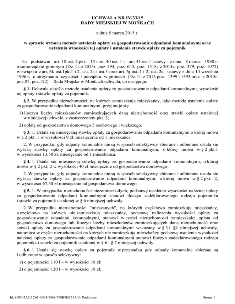 UCHWAŁA NR IV/33/15 RADY MIEJSKIEJ W MOŃKACH z dnia 5 marca 2015 r. w sprawie wyboru metody ustalenia opłaty za gospodarowanie odpadami komunalnymi oraz ustalenia wysokości tej opłaty i ustalenia stawek opłaty za pojemnik Na podstawie art. 18 ust. 2 pkt. 15 i art. 40 ust. 1 i art. 41 ust.1 ustawy z dnia 8 marca 1990 r. o samorządzie gminnym (Dz. U. z 2013r. poz 594, poz. 645, poz. 1318; z 2014r. poz. 379, poz. 1072) w związku z art. 6k ust.1pkt1 i 2, ust. 2a i ust.3 oraz art. 6j ust. 1 i 2, ust. 2a, ustawy z dnia 13 września 1996 r. o utrzymaniu czystości i porządku w gminach (Dz. U. z 2013 poz. 1399 i 1593 oraz z 2015r. poz.87, poz.122) – Rada Miejska w Mońkach uchwala, co następuje: § 1. Uchwała określa metodę ustalenia opłaty za gospodarowanie odpadami komunalnymi, wysokość tej opłaty i stawki opłaty za pojemnik. § 2. W przypadku nieruchomości, na których zamieszkują mieszkańcy, jako metodę ustalenia opłaty za gospodarowanie odpadami komunalnymi, przyjmuje się: 1) iloczyn liczby mieszkańców zamieszkujących daną nieruchomość oraz stawki opłaty ustalonej w niniejszej uchwale, z zastrzeżeniem pkt. 2; 2) opłatę od gospodarstwa domowego 5 osobowego i większego. § 3. 1. Ustala się miesięczną stawkę opłaty za gospodarowanie odpadami komunalnymi o której mowa w § 2 pkt. 1 w wysokości 9 zł. miesięcznie od 1 mieszkańca. 2. W przypadku, gdy odpady komunalne nie są w sposób selektywny zbierane i odbierane ustala się wyższą stawkę opłaty za gospodarowanie odpadami komunalnymi, o której mowa w § 2 pkt.1 w wysokości 13,50 zł. miesięcznie od 1 mieszkańca. § 4. 1. Ustala się miesięczną stawkę opłaty za gospodarowanie odpadami komunalnymi, o której mowa w § 2 pkt. 2 w wysokości 40 zł miesięcznie od gospodarstwa domowego . 2. W przypadku, gdy odpady komunalne nie są w sposób selektywny zbierane i odbierane ustala się wyższą stawkę opłaty za gospodarowanie odpadami komunalnymi, o której mowa w § 2 pkt. 2, w wysokości 67,50 zł miesięcznie od gospodarstwa domowego. § 5. 1. W przypadku nieruchomości niezamieszkałych, podstawę ustalenia wysokości należnej opłaty za gospodarowanie odpadami komunalnymi stanowi iloczyn zadeklarowanego rodzaju pojemnika i stawki za pojemnik ustalonej w § 6 niniejszej uchwały. 2. W przypadku nieruchomości "mieszanych", na których częściowo zamieszkują mieszkańcy, a częściowo na których nie zamieszkują mieszkańcy, podstawę naliczenia wysokości opłaty za gospodarowanie odpadami komunalnymi, stanowi w części nieruchomości zamieszkałej opłata od gospodarstwa domowego lub iloczyn liczby mieszkańców zamieszkujących daną nieruchomość oraz stawki opłaty za gospodarowanie odpadami komunalnymi wskazany w § 3 i §4 niniejszej uchwały, natomiast w części nieruchomości na których nie zamieszkują mieszkańcy podstawę ustalenia wysokości należnej opłaty za gospodarowanie odpadami komunalnymi stanowi iloczyn zadeklarowanego rodzaju pojemnika i stawki za pojemnik ustalonej w § 6 i § 7 niniejszej uchwały. § 6. 1. Ustala się stawkę opłaty za pojemnik w przypadku gdy odpady komunalne zbierane są i odbierane w sposób selektywny: 1) o pojemności 110 l – w wysokości 18 zł; 2) o pojemności 120 l – w wysokości 18 zł; Id: 819345A3-2C61-40E4-9366-790B9EB71A40. Podpisany Strona 1 3) o pojemności 240 l – w wysokości 36 zł; 4) o pojemności 1100 l – w wysokości 100 zł; 5) o pojemności 5 m3 – w wysokości 180 zł; 6) o pojemności 7 m3 – w wysokości 250 zł; 7) o pojemności 10 m3 – w wysokości 360 zł. 2. Liczba odbieranych pojemników oraz wysokość ustalonej stawki opłaty za pojemnik określa kwotę opłaty, którą zobowiązany właściciel winien uiszczać miesięcznie na rzecz Gminy w terminach określonych odrębną uchwałą. § 7. Jeżeli odpady komunalne zbierane i odbierane są w sposób nieselektywny ustala się wyższą stawkę opłaty za pojemnik: 1) o pojemności 110 l – w wysokości 36 zł; 2) o pojemności 120 l – w wysokości 36 zł; 3) o pojemności 240 l – w wysokości 72 zł; 4) o pojemności 1100 l – w wysokości 200 zł; 5) o pojemności 5 m3 – w wysokości 360 zł; 6) o pojemności 7 m3 – w wysokości 500 zł; 7) o pojemności 10 m3 – w wysokości 720 zł. § 8. Wykonanie uchwały powierza się Burmistrzowi Moniek. § 9. Traci moc uchwała Nr XLV/351/14 Rady Miejskiej w Mońkach z dnia 16 lipca 2014r. w sprawie wyboru metody ustalenia opłaty za gospodarowanie odpadami komunalnymi oraz ustalenia wysokości tej opłaty i ustalenia stawek opłaty za pojemnik (Dz. Urz. Woj. Podl. z 2014r. poz. 2677). § 10. Uchwała wchodzi w życie po upływie 14 dni od dnia jej ogłoszenia w Dzienniku Urzędowym Województwa Podlaskiego. Przewodniczący Rady Miejskiej Edward Stanisław Klepacki Id: 819345A3-2C61-40E4-9366-790B9EB71A40. Podpisany Strona 2