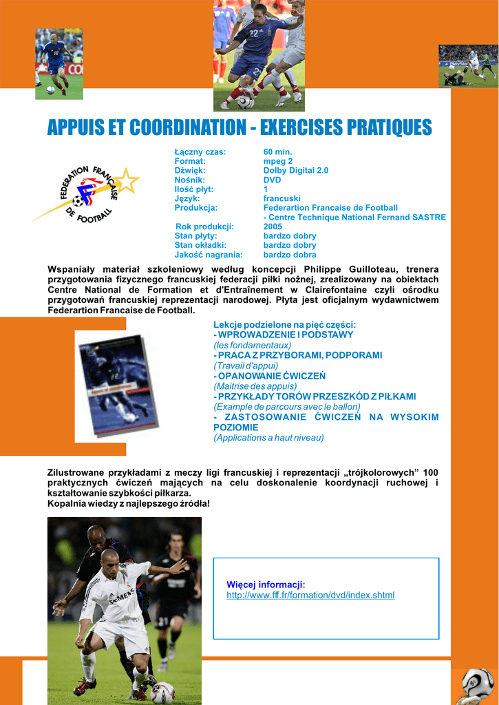 APPUIS ET COORDINATION - EXERCISES PRATIQUES £¹czny czas: Format: DŸwiêk: Noœnik: Iloœæ p³yt: Jêzyk: Produkcja: Rok produkcji: Stan p³yty: Stan ok³adki: Jakoœæ nagrania: 60 min. mpeg 2 Dolby Digital 2.0 DVD 1 francuski Federartion Francaise de Football - Centre Technique National Fernand SASTRE 2005 bardzo dobry bardzo dobry bardzo dobra Wspania³y materia³ szkoleniowy wed³ug koncepcji Philippe Guilloteau, trenera przygotowania fizycznego francuskiej federacji pi³ki no¿nej, zrealizowany na obiektach Centre National de Formation et d'Entraînement w Clairefontaine czyli oœrodku przygotowañ francuskiej reprezentacji narodowej. P³yta jest oficjalnym wydawnictwem Federartion Francaise de Football. Lekcje podzielone na piêæ czêœci: - WPROWADZENIE I PODSTAWY (les fondamentaux) - PRACA Z PRZYBORAMI, PODPORAMI (Travail d'appui) - OPANOWANIE ÆWICZEÑ (Maitrise des appuis) - PRZYK£ADY TORÓW PRZESZKÓD Z PI£KAMI (Example de parcours avec le ballon) - ZASTOSOWANIE ÆWICZEÑ NA WYSOKIM POZIOMIE (Applications a haut niveau) Zilustrowane przyk³adami z meczy ligi francuskiej i reprezentacji „trójkolorowych” 100 praktycznych æwiczeñ maj¹cych na celu doskonalenie koordynacji ruchowej i kszta³towanie szybkoœci pi³karza. Kopalnia wiedzy z najlepszego Ÿród³a! Wiêcej informacji: http://www.fff.fr/formation/dvd/index.shtml