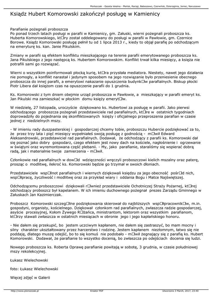 Płońszczak - Gazeta lokalna - Płońsk, Raciąż, Baboszewo, Czerwińsk, Dzierzążnia, Joniec, Naruszewo Ksiądz Hubert Komorowski zakończył posługę w Kamienicy Parafianie pożegnali proboszcza Po ponad trzech latach posługi w parafii w Kamienicy, gm. Załuski, wierni pożegnali proboszcza ks. Huberta Komorowskiego, ktÃłry został oddelegowany do posługi w parafii w Pawłowie, gm. Czernice Borowe. Ksiądz Komorowski posługę pełnił tu od 1 lipca 2013 r., kiedy to objął parafię po odchodzącym na emeryturę ks. kan. Janie Pikulskim. Zmiany w parafii są efektem konfliktu mieszkającego na terenie parafii emerytowanego proboszcza ks. Jana Pikulskiego z jego następcą ks. Hubertem Komorowskim. Konflikt trwał kilka miesięcy, a księża nie potrafili sami go rozwiązać. Wierni o wszystkim poinformowali płocką kurię, ktÃłra przysłała mediatora. Niestety, nawet jego działania nie pomogły, a konflikt narastał i jedynym sposobem na jego rozwiązanie było przeniesienie obecnego proboszcza do innej parafii, a emerytowi nakazanie opuszczenia budynkÃłw parafialnych. Biskup płocki Piotr Libera dał księżom czas na opuszczenie parafii do 1 grudnia. Ks. Komorowski z tym dniem obejmie urząd proboszcza w Pawłowie, a mieszkający w parafii emeryt ks. Jan Pikulski ma zamieszkać w płockim domu księży emerytÃłw. W niedzielę, 27 listopada, uroczyście dziękowano ks. Hubertowi za posługę w parafii. Jako pierwsi odchodzącego proboszcza pożegnali przedstawiciele rad parafialnych, ktÃłre w ostatnich tygodniach doprowadziły do pojednania się skonfliktowanych księży i oficjalnego przeproszenia parafian w czasie jednej z niedzielnych mszy. - W imieniu rady duszpasterskiej i gospodarczej chcemy tobie, proboszczu Hubercie podziękować za to, że przez trzy lata i pięć miesięcy wypełniałeś swoją posługę z godnością - mÃłwił Edward Aleksandrowski, przedstawiciel rad parafialnych. Dodawał, że odchodzący z parafii ks. Komorowski dał się poznać jako dobry gospodarz, czego efektem jest nowy dach na kościele, nagłośnienie i ogrzewanie w świątyni oraz wyremontowana część plebanii. - My, jako parafianie, staraliśmy się wspierać dobrą radą, jak i materialnie twoje zamierzenia - mÃłwił. Członkowie rad parafialnych w dowÃłd wdzięczności wręczyli proboszczowi kielich mszalny oraz paterę, prosząc o modlitwę, ilekroć ks. Komorowski będzie go trzymał w swoich dłoniach. Przedstawiciele wspÃłlnot parafialnych i wiernych dziękowali księdzu za jego obecność pośrÃłd nich, wspÃłłpracę, życzliwość i modlitwę oraz za przykład wiary i oddania Bogu i Matce Najświętszej. Odchodzącemu proboszczowi dziękowali rÃłwnież przedstawiciele Ochotniczej Straży Pożarnej, ktÃłrej odchodzący proboszcz był kapelanem. W ich imieniu duchownego pożegnał prezes Zarządu Gminnego w Załuskach Jan Kazimierczak. Proboszcz Komorowski szczegÃłlne podziękowania skierował do najbliższych wspÃłłpracownikÃłw, m.in. gospodyni, organisty, kościelnego. Dziękował członkom rad parafialnych, zwłaszcza radzie gospodarczej, asyście procesyjnej, Kołom Żywego RÃłżańca, ministrantom, lektorom oraz wszystkim parafianom, ktÃłrzy stawali zwłaszcza w ostatnich miesiącach w obronie jego i jego kapłańskiego honoru. - Nie dałem się przekupić, bo jestem uczciwym kapłanem, nie dałem się zastraszyć, bo mam mocny i silny charakter ukształtowany przez harcerstwo i rodzinę. Jestem kapłanem niezłomnym, łatwo się nie poddaję, dlatego muszę odejść, bo to się komuś nie podobało - mÃłwił żegnający się z parafią ks. Hubert Komorowski. Dodawał, że parafianie to wszystko docenią, bo zwłaszcza po odejściach docenia się ludzi. Nowego proboszcza ks. Roberta Oprawę parafianie powitają w sobotę, 3 grudnia, w czasie południowej mszy rekolekcyjnej. Łukasz Wielechowski foto: Łukasz Wielechowski Więcej zdjęć w Galerii http://www.plonszczak.pl Kreator PDF Utworzono 3 March, 2017, 23:40