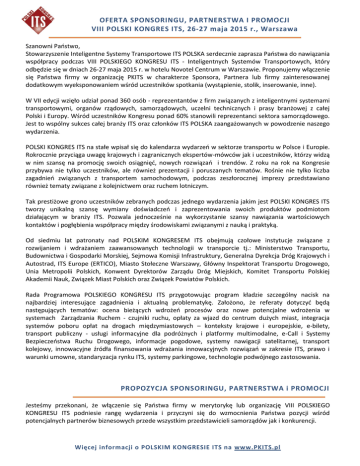 OFERTA SPONSORINGU, PARTNERSTWA I PROMOCJI VIII POLSKI KONGRES ITS, 26-27 maja 2015 r., Warszawa Szanowni Państwo, Stowarzyszenie Inteligentne Systemy Transportowe ITS POLSKA serdecznie zaprasza Państwa do nawiązania współpracy podczas VIII POLSKIEGO KONGRESU ITS - Inteligentnych Systemów Transportowych, który odbędzie się w dniach 26-27 maja 2015 r. w hotelu Novotel Centrum w Warszawie. Proponujemy włączenie się Państwa firmy w organizację PKITS w charakterze Sponsora, Partnera lub firmy zainteresowanej dodatkowym wyeksponowaniem wśród uczestników spotkania (wystąpienie, stolik, inserowanie, inne). W VII edycji wzięło udział ponad 360 osób - reprezentantów z firm związanych z inteligentnymi systemami transportowymi, organów rządowych, samorządowych, uczelni technicznych i prasy branżowej z całej Polski i Europy. Wśród uczestników Kongresu ponad 60% stanowili reprezentanci sektora samorządowego. Jest to wspólny sukces całej branży ITS oraz członków ITS POLSKA zaangażowanych w powodzenie naszego wydarzenia. POLSKI KONGRES ITS na stałe wpisał się do kalendarza wydarzeń w sektorze transportu w Polsce i Europie. Rokrocznie przyciąga uwagę krajowych i zagranicznych ekspertów-mówców jak i uczestników, którzy widzą w nim szansę na promocję swoich osiągnięć, nowych rozwiązań i trendów. Z roku na rok na Kongresie przybywa nie tylko uczestników, ale również prezentacji i poruszanych tematów. Rośnie nie tylko liczba zagadnień związanych z transportem samochodowym, podczas zeszłorocznej imprezy przedstawiano również tematy związane z kolejnictwem oraz ruchem lotniczym. Tak prestiżowe grono uczestników zebranych podczas jednego wydarzenia jakim jest POLSKI KONGRES ITS tworzy unikalną szansę wymiany doświadczeń i zaprezentowania swoich produktów podmiotom działającym w branży ITS. Pozwala jednocześnie na wykorzystanie szansy nawiązania wartościowych kontaktów i pogłębienia współpracy między środowiskami związanymi z nauką i praktyką. Od siedmiu lat patronaty nad POLSKIM KONGRESEM ITS obejmują czołowe instytucje związane z rozwijaniem i wdrażaniem zaawansowanych technologii w transporcie tj.: Ministerstwo Transportu, Budownictwa i Gospodarki Morskiej, Sejmowa Komisji Infrastruktury, Generalna Dyrekcja Dróg Krajowych i Autostrad, ITS Europe (ERTICO), Miasto Stołeczne Warszawy, Główny Inspektorat Transportu Drogowego, Unia Metropolii Polskich, Konwent Dyrektorów Zarządu Dróg Miejskich, Komitet Transportu Polskiej Akademii Nauk, Związek Miast Polskich oraz Związek Powiatów Polskich. Rada Programowa POLSKIEGO KONGRESU ITS przygotowując program kładzie szczególny nacisk na najbardziej interesujące zagadnienia i aktualną problematykę. Założono, że referaty dotyczyć będą następujących tematów: ocena bieżących wdrożeń procesów oraz nowe potencjalne wdrożenia w systemach Zarządzania Ruchem - czujniki ruchu, opłaty za wjazd do centrum dużych miast, integracja systemów poboru opłat na drogach międzymiastowych – konteksty krajowe i europejskie, e-bilety, transport publiczny - usługi informacyjne dla podróżnych i platformy multimodalne, e-Call i Systemy Bezpieczeństwa Ruchu Drogowego, informacje pogodowe, systemy nawigacji satelitarnej, transport kolejowy, innowacyjne źródła finansowania wdrażania innowacyjnych rozwiązań w zakresie ITS, prawo i warunki umowne, standaryzacja rynku ITS, systemy parkingowe, technologie podwójnego zastosowania. PROPOZYCJA SPONSORINGU, PARTNERSTWA i PROMOCJI Jesteśmy przekonani, że włączenie się Państwa firmy w merytorykę lub organizację VIII POLSKIEGO KONGRESU ITS podniesie rangę wydarzenia i przyczyni się do wzmocnienia Państwa pozycji wśród potencjalnych partnerów biznesowych przede wszystkim przedstawicieli samorządów jak i konkurencji. Więcej informacji o POLSKIM KONGRESIE ITS na www.PKITS.pl ŚWIADCZENIA W RAMACH UMOWY SPONSORSKIEJ Najwyższą gwarancją prestiżu oraz zapewnienia maksymalnego wyeksponowanie firmy jest rozważenie przyjęcie statusie „Sponsora” w ramach następujących limitowanych i precyzyjne dopasowanych do Państwa potrzeb świadczeń uwzględnionych poniżej: Świadczenia w ramach umowy sponsorskiej Gospodarz (wybrany dzień) Sponsor Platynowy Diamentow y Sponsoring Złoty Srebrny Sesji Uroczyste przyjęcie Lunch Serwis kawowy - 1 blok tematyczny Wystąpienie (15 min) po wcześniejszym zgłoszeniu abstraktu do Rady Programowej 2 wystąpienia 1 wystąpienie 1 wystąpieni e 1 wystąpienie do uzgodnienia Uczestnictwo bezpłatne reprezentantów Firmy w kongresie 5 osoby 4 osoby 3 osoby 2 osoby do uzgodnienia Dodatkowe uczestnictwo reprezentantów Firmy w kongresie z 50% zniżką 5 osób 4 osoby 3 osoby 2 osoby do uzgodnienia Odczytanie nazwy Firmy na rozpoczęciu kongresu Tak Tak Tak Tak Tak Możliwość zaproszenia / krótka przemowa *na świadczenie przez Sponsora (*dot. uroczystego przyjęcia) Tak Tak Tak - - Dołączenie materiału reklamowego Firmy do pakietów uczestników kongresu Tak Tak Tak - Tak 3 szt. 2 szt. 1 szt. 1 szt. Tak Tak Tak - - Tak - - Tak Tak - Umieszczenie logo Firmy na głównej stronie stronie internetowej www.pkits.pl Tak Tak Tak Tak Tak Zamieszczenie logo Firmy w drukowanych materiałach kongresowych Tak Tak Tak Tak Tak Zamieszczenie logo Firmy na ekranach promocyjnych (banner, slajd kongresowy, tablice informacyjne) Tak Tak Tak Tak Tak Zamieszczenie logo Firmy w wybranych reklamach prasowych promujących kongres Tak Tak - - Tak Powierzchnia pod stolik / stand promocyjny (zabudowa lub ścianka wymaga odrębnych uzgodnień z biurem organizacyjnym) Tak Tak Tak - Tak 1 firma 2 firmy 4 firmy - 1 organizacja /instytucja 28.000 zł 22.000 zł 16.000 zł 10.000 zł 27.000 zł Umieszczenie bannerów reklamowych Firmy w miejscu organizacji kongresu Osadzenie prezentacji Firmy na specjalnie utworzonej podstronie na www.pkits.pl (tekst, logo, pliki graficzne, plik video lub prezenta