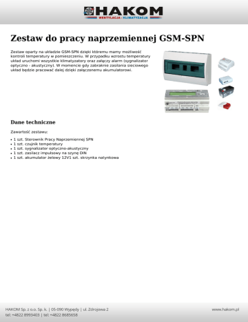Zestaw do pracy naprzemiennej GSM-SPN Zestaw oparty na układzie GSM-SPN dzięki któremu mamy możliwość kontroli temperatury w pomieszczeniu. W przypadku wzrostu temperatury układ uruchomi wszystkie klimatyzatory oraz załączy alarm (sygnalizator optyczno - akustyczny). W momencie gdy zabraknie zasilania sieciowego układ będzie pracować dalej dzięki załączonemu akumulatorowi. Dane techniczne Zawartość zestawu: ● ● ● ● ● 1 1 1 1 1 szt. szt. szt. szt. szt. Sterownik Pracy Naprzemiennej SPN czujnik temperatury sygnalizator optyczno-akustyczny zasilacz impulsowy na szynę DIN akumulator żelowy 12V1 szt. skrzynka natynkowa