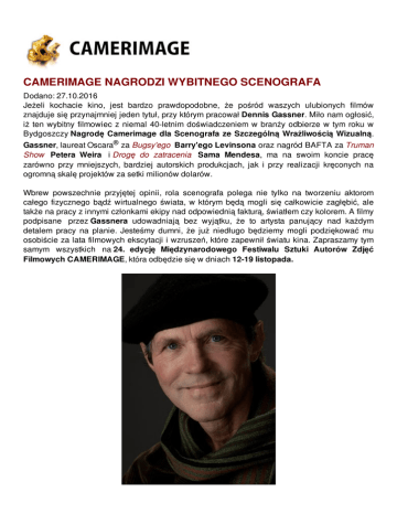 CAMERIMAGE NAGRODZI WYBITNEGO SCENOGRAFA Dodano: 27.10.2016 Jeżeli kochacie kino, jest bardzo prawdopodobne, że pośród waszych ulubionych filmów znajduje się przynajmniej jeden tytuł, przy którym pracował Dennis Gassner. Miło nam ogłosić, iż ten wybitny filmowiec z niemal 40-letnim doświadczeniem w branży odbierze w tym roku w Bydgoszczy Nagrodę Camerimage dla Scenografa ze Szczególną Wrażliwością Wizualną. Gassner, laureat Oscara® za Bugsy'ego Barry'ego Levinsona oraz nagród BAFTA za Truman Show Petera Weira i Drogę do zatracenia Sama Mendesa, ma na swoim koncie pracę zarówno przy mniejszych, bardziej autorskich produkcjach, jak i przy realizacji kręconych na ogromną skalę projektów za setki milionów dolarów. Wbrew powszechnie przyjętej opinii, rola scenografa polega nie tylko na tworzeniu aktorom całego fizycznego bądź wirtualnego świata, w którym będą mogli się całkowicie zagłębić, ale także na pracy z innymi członkami ekipy nad odpowiednią fakturą, światłem czy kolorem. A filmy podpisane przez Gassnera udowadniają bez wyjątku, że to artysta panujący nad każdym detalem pracy na planie. Jesteśmy dumni, że już niedługo będziemy mogli podziękować mu osobiście za lata filmowych ekscytacji i wzruszeń, które zapewnił światu kina. Zapraszamy tym samym wszystkich na 24. edycję Międzynarodowego Festiwalu Sztuki Autorów Zdjęć Filmowych CAMERIMAGE, która odbędzie się w dniach 12-19 listopada. Dennis Gassner, archiwum Dennisa Gassnera Począwszy od połowy lat 80. XX wieku, gdy debiutował samodzielnie jako scenograf przy kultowym Autostopowiczu Roberta Harmona, Gassner zadziwia dyscypliną, kreatywnością, przygotowaniem oraz perfekcyjnym wczuwaniem się w wizję reżyserów, z którymi podejmuje współpracę. Nic dziwnego, skoro miłość Gassnera do kina narodziła się wraz z podziwem dla Lawrence'a z Arabii Davida Leana, a młodego chłopaka od początku ciągnęło do szeroko pojmowanej sztuki. Mając do wyboru intratną karierę zawodnika futbolu amerykańskiego, Gassner wolał kontynuować studia architektoniczne. Pomogło mu to po przeprowadzce do Los Angeles, gdzie miał szczęście poznać przygotowującego się do Czasu Apokalipsy Francisa Forda Coppolę, który wyznaczył ambitnemu chłopakowi funkcję asystenta scenografa Deana Tavoularisa. Coppola zatrudnił także Gassnera w swoim studiu American Zoetrope, gdzie ten pracował jako grafik przy kampaniach promocyjnych filmów oraz plakatach (między innymi do zrekonstruowanej wersji Napoleona Abla Gance'a, arcydzieła kina niemego). Gassner wspominał później pięć lat współpracy z Tavoularisem jako najlepszą możliwą praktykę (...) dowiedziałem się, jak filmów nie należy kręcić. Wspomagał scenografa między innymi na planach Opowieści Hammetta Wima Wendersa oraz Rumble Fish Coppoli. Ten ostatni, nakręcony w 1983 roku, okazał się dla Gassnera projektem przełomowym. Od tamtego czasu pracował z najciekawszymi reżyserami w branży, między innymi ze Stephenem Frearsem przy Naciągaczach oraz Timem Burtonem na planie osobistej dla reżysera Dużej ryby. W pierwszym przypadku wspomógł reżysera w kreowaniu atrakcyjnego i zwodniczego światka drobnych oszustów, w drugim uwiarygodnił opowiadaną na granicy rzeczywistości i fikcji historię baśniowego romansu dwójki życiowych romantyków. Kadr z filmu "Bugsy" Kadr z filmu "Barton Fink" Wieloletnie współprace okazały się szczególnie owocne dla Gassnera. Na ponad dekadę związał się z braćmi Coen, projektując na potrzeby ich Ścieżki strachu ociekający moralną dwuznacznością świat gangsterów walczących o władzę w czasach prohibicji. Za kolejny wspólny film, Bartona Finka, którego „piekielny hotel umysłu” zapadł w pamięci większości widzów, Gassner uzyskał pierwszą w karierze nominację do Oscara® (w tym samym roku zdobył Nagrodę Akademii® za Bugsy'ego). Z Coenami nakręcił jeszcze Hudsucker Proxy, Bracie, gdzie jesteś?, Człowieka, którego nie było oraz Ladykillers, czyli zabójczy kwintet, w każdym z tych filmów uzupełniając perfekcyjnie reżyserską wizję słynnego duetu. W tym samym czasie spotkał na swej drodze Sama Mendesa, dla którego powrócił najpierw do gangsterskiego świata w Drodze do zatracenia, by później przenieść się wraz z nim do amerykańskiej bazy wojskowej w Iraku w Jarheadzie: Żołnierzu piechoty morskiej i zaprojektować scenografię do dwóch stworzonych przez reżysera filmów o Jamesie Bondzie: Skyfall oraz Spectre. Gassner pracował także z Markiem Forsterem przy wcześniejszej odsłonie filmowych przygód legendarnego agenta 007 Quantum of Solace. Pracując z braćmi Coen oraz Mendesem, scenograf zgrał się także świetnie z autorem zdjęć Rogerem Deakinsem, z którym kręci obecnie kontynuację kultowego Łowcy androidów, którą reżyseruje Denis Villeneuve. Kadr z filmu "Droga do zatracenia" Kadr z filmu "Złoty kompas" Skyfall oraz Spectre stanowiły dla Gassnera największe wyzwania w karierze, również w perspektywie czasowej, bowiem przy planowaniu i realizacji tego pierwszego spędził ponad półtora roku i w samym tylko okresie przygotowawczym wykonał 75 lotów do dziewięciu krajów na całym świecie. W jednym z wywiadów wyznał z przekąsem: mój styl życia nazywa się jetlag – moje życie to jeden niekończący się jetlag. Wydawać by się mogło, że poza filmami o Bondzie Gassner czuje się najlepiej w projektach, w których musi powracać wyobraźnią do dawno minionych epok, jednakże scenograf jest otwarty na różne wyzwania. Dwie z pięciu uzyskanych nominacji do Oscara® zdobył za stworzenie od zera fantazyjnych baśniowych światów. W Złotym kompasie Chrisa Weitza był to szereg efektownych i klimatycznych krain fantasy, z kolei w Tajemnicach lasu Gassner powołał do życia nie tylko tytułowy, atrakcyjnie mroczny las, ale także chociażby książęcy bal, po któr