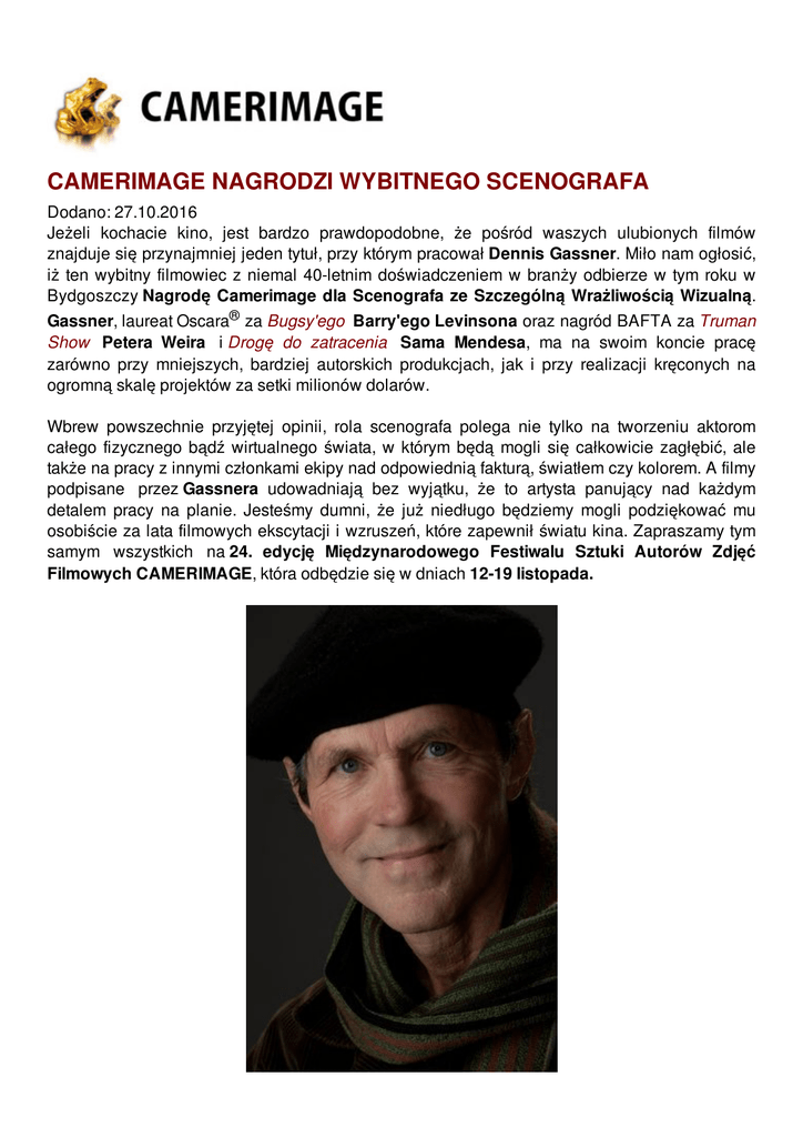CAMERIMAGE NAGRODZI WYBITNEGO SCENOGRAFA