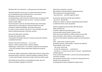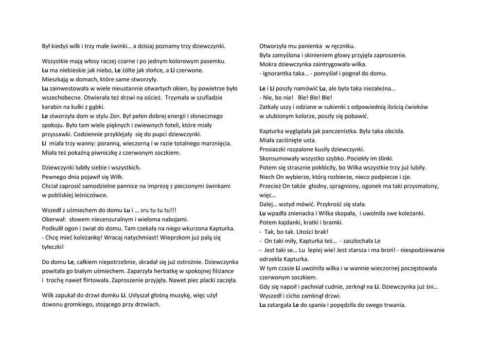 Był kiedyś wilk i trzy małe świnki… a dzisiaj poznamy trzy dziewczynki. Wszystkie mają włosy raczej czarne i po jednym kolorowym pasemku. Lu ma niebieskie jak niebo, Le żółte jak słońce, a Li czerwone. Mieszkają w domach, które same stworzyły. Lu zainwestowała w wiele nieustannie otwartych okien, by powietrze było wszechobecne. Otwierała też drzwi na oścież. Trzymała w szufladzie karabin na kulki z gąbki. Le stworzyła dom w stylu Zen. Był pełen dobrej energii i słonecznego spokoju. Było tam wiele pięknych i zwiewnych foteli, które miały przyssawki. Codziennie przyklejały się do pupci dziewczynki. Li miała trzy wanny: poranną, wieczorną i w razie totalnego marznięcia. Miała też pokaźną piwniczkę z czerwonym soczkiem. Dziewczynki lubiły siebie i wszystkich. Pewnego dnia pojawił się Wilk. Chciał zaprosić samodzielne pannice na imprezę z pieczonymi świnkami w pobliskiej leśniczówce. Wszedł z uśmiechem do domu Lu i … sru tu tu tu!!! Oberwał: słowem niecenzuralnym i wieloma nabojami. Podkulił ogon i zwiał do domu. Tam czekała na niego wkurzona Kapturka. - Chcę mieć koleżankę! Wracaj natychmiast! Wieprzkom już palą się tyłeczki! Do domu Le, całkiem niepotrzebnie, skradał się już ostrożnie. Dziewczynka powitała go białym uśmiechem. Zaparzyła herbatkę w spokojnej filiżance i trochę nawet flirtowała. Zaproszenie przyjęła. Nawet piec placki zaczęła. Wilk zapukał do drzwi domku Li. Usłyszał głośną muzykę, więc użył dzwonu gromkiego, stojącego przy drzwiach. Otworzyła mu panienka w ręczniku. Była zamyślona i skinieniem głowy przyjęła zaproszenie. Mokra dziewczynka zaintrygowała wilka. - Ignorantka taka… - pomyślał i pognał do domu. Le i Li poszły namówić Lu, ale była taka niezależna… - Nie, bo nie! Ble! Ble! Ble! Zatkały uszy i odziane w sukienki z odpowiednią ilością ćwieków w ulubionym kolorze, poszły się pobawić. Kapturka wyglądała jak panczenistka. Była taka obcisła. Miała zaciśnięte usta. Prosiaczki rozpalone kusiły dziewczynki. Skonsumowały wszystko szybko. Pociekły im ślinki. Potem się strasznie pokłóciły, bo Wilka wszystkie trzy już lubiły. Niech On wybierze, którą rozbierze, nieco podpiecze i zje. Przecież On także głodny, spragniony, ogonek ma taki przysmalony, więc… Dalej… wstyd mówić. Przykrość się stała. Lu wpadła znienacka i Wilka skopała, i uwolniła swe koleżanki. Potem kajdanki, kratki i bramki. - Tak, bo tak. Litości brak! - On taki miły, Kapturka też… - zaszlochała Le - Jest taki se… Lu lepiej wie! Jest starsza i ma broń! - niespodziewanie odrzekła Kapturka. W tym czasie Li uwolniła wilka i w wannie wieczornej poczęstowała czerwonym soczkiem. Gdy się napoił i pachniał cudnie, zerknął na Li. Dziewczynka już śni… Wyszedł i cicho zamknął drzwi. Lu zatargała Le do spania i popędziła do swego trwania.