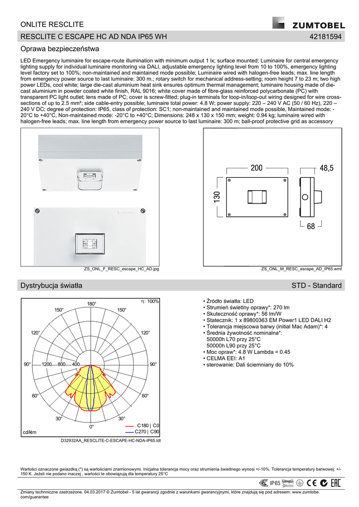 ONLITE RESCLITE RESCLITE C ESCAPE HC AD NDA IP65 WH 42181594 Oprawa bezpieczeństwa Times New Roman LED Emergency luminaire for escape-route illumination with minimum output 1 lx; surface mounted; Luminaire for central emergency lighting supply for individual luminaire monitoring via DALI, adjustable emergency lighting level from 10 to 100%, emergency lighting level factory set to 100%; non-maintained and maintained mode possible; Luminaire wired with halogen-free leads; max. line length from emergency power source to last luminaire: 300 m.; rotary switch for mechanical address-setting; room height 7 to 23 m; two high power LEDs, cool white; large die-cast aluminium heat sink ensures optimum thermal management; luminaire housing made of diecast aluminium in powder coated white finish, RAL 9016; white cover made of fibre-glass reinforced polycarbonate (PC) with transparent PC light outlet; lens made of PC; cover is screw-fitted; plug-in terminals for loop-in/loop-out wiring designed for wire crosssections of up to 2.5 mm²; side cable-entry possible; luminaire total power: 4.8 W; power supply: 220 – 240 V AC (50 / 60 Hz), 220 – 240 V DC; degree of protection: IP65, class of protection: SC1; non-maintained and maintained mode possible, Maintained mode: 20°C to +40°C, Non-maintained mode: -20°C to +40°C; Dimensions: 248 x 130 x 150 mm; weight: 0.94 kg; luminaire wired with halogen-free leads; max. line length from emergency power source to last luminaire: 300 m; ball-proof protective grid as accessory ZS_ONL_F_RESC_escape_HC_AD.jpg Dystrybucja światła STD - Standard h: 100% 180° 150° 150° 120° 90° 120° 1200 800 400 90° 60° • Źródło światła: LED • Strumień świetlny oprawy*: 270 lm • Skuteczność oprawy*: 56 lm/W • Statecznik: 1 x 89800363 EM Power1 LED DALI H2 • Tolerancja miejscowa barwy (initial Mac Adam)*: 4 • Średnia żywotność nominalna*: 50000h L70 przy 25°C 50000h L90 przy 25°C • Moc opraw*: 4.8 W Lambda = 0.45 • CELMA EEI: A1 • sterowanie: Dali ściemniany do 10% 60° 30° 30° 0° cd/klm ZS_ONL_M_RESC_escape_AD_IP65.wmf C180 | C0 C270 | C90 D32932AA_RESCLITE-C-ESCAPE-HC-NDA-IP65.ldt Wartości oznaczone gwiazdką (*) są wartościami znamionowymi. Inicjalna tolerancja mocy oraz strumienia świetlnego wynosi +/-10%. Tolerancja temperatury barwowej: +/150 K. Jeżeli nie podano inaczej , wartości te obowiązują dla temperatury 25°C Zmiany technniczne zastrzeżone. 04.03.2017 © Zumtobel - 5 lat gwarancji zgodnie z warunkami gwarancyjnymi, które znajdują się pod adresem: www.zumtobe. com/guarantee