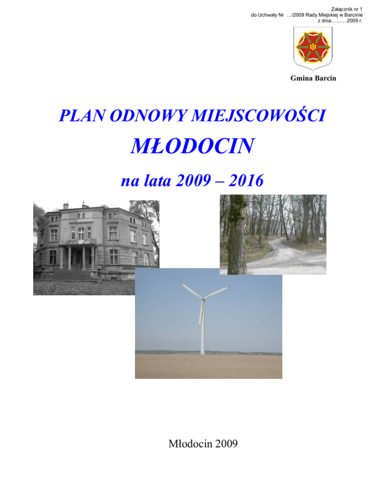 Załącznik nr 1 do Uchwały Nr …/2009 Rady Miejskiej w Barcinie z dnia……....2009 r. z dnia 27 lipca 2007 r. Gmina Barcin PLAN ODNOWY MIEJSCOWOŚCI MŁODOCIN na lata 2009 – 2016 Młodocin 2009 Plan Odnowy Miejscowości Młodocin na lata 2009 – 2016 został opracowany przez Ø Lokalną Grupę Odnowy Młodocina w składzie: Grzegorz Potempa - lider grupy, Gabriela Przybylska - Lasota, Stanisław Potempa, Ireneusz Nowak, Zdzisław Nowak Ø Mieszkańców Młodocina 2 Spis treści 1. Wstęp. 4 2. Charakterystyka miejscowości. 5 2.1. Położenie geograficzne. Przynależność Powierzchnia. Liczba ludności. 2.2. Historia. Przestrzenna struktura miejscowości. administracyjna. 5 6 Inwentaryzacja zasobów miejscowości. 8 3.1. Dziedzictwo kulturowe i przyrodnicze. 8 3.2. Drogi. Obiekty i tereny. 8 3.3. Infrastruktura społeczna. 9 3.4. Infrastruktura techniczna. 9 3.5. Gospodarka i rolnictwo. 10 3.6. Kapitał społeczny i ludzki. 11 3.7. Sąsiedzi. 11 3. 4. Ocena mocnych i słabych stron miejscowości. 12 4.1. Planowane kierunki rozwoju. Wizja wsi. 5. 6. Opis planowanych zadań inwestycyjnych aktywizujących społeczność lokalną. Monitoring i ewaluacja. 7. Podsumowanie. 13 i przedsięwzięć 16 20 20 3 1.Wstęp. Celem opracowania Planu Odnowy Miejscowości Młodocin jest sformułowanie strategii odnowy wsi poprzez: Ø inwentaryzację zasobów służących odnowie miejscowości, Ø analizę słabych i mocnych stron wsi oraz szans i zagrożeń zarówno wewnętrznych, jak i zewnętrznych mogących mieć wpływ na przyszłość mieszkańców, Ø określenie planowanych kierunków rozwoju i wizji wsi, Ø opis planowanych zadań inwestycyjnych i przedsięwzięć aktywizujących społeczność lokalną. Dokument ma służyć pełnemu wykorzystaniu istniejącego potencjału i szans rozwojowych wsi oraz umożliwić dostęp do zewnętrznych środków finansowych, w tym pochodzących z funduszy Unii Europejskiej (w szczególności z Programu Rozwoju Obszarów Wiejskich na lata 2007-2013). Dokument jest obowiązkowym załącznikiem do wniosku o dofinansowanie w ramach Programu Rozwoju Obszarów Wiejskich na lata 2007-2013 w ramach osi 3 działanie „Odnowa i rozwój wsi”. Celem działania „Odnowa i rozwój wsi” jest poprawa jakości życia na obszarach wiejskich przez zaspokojenie potrzeb społecznych i kulturalnych mieszkańców wsi oraz promowanie obszarów wiejskich. Działanie umożliwia rozwój tożsamości społeczności wiejskiej, zachowanie dziedzictwa kulturowego i specyfiki obszarów wiejskich oraz wpływa na wzrost atrakcyjności turystycznej i inwestycyjnej obszarów wiejskich. 4 2. Charakterystyka miejscowości. 2.1. Położenie geograficzne. Przynależność administracyjna. Powierzchnia. Liczba ludności. Wieś Młodocin położona jest na terenie gminy Barcin, w południowo-zachodniej części województwa kujawsko-pomorskiego. Miejsko-wiejska gmina Barcin jest jedną z 144 gmin województwa kujawsko-pomorskiego, w tym jedną z 35 gmin miejsko – wiejskich. Położona jest w południowej części województwa, na obrzeżach powiatu żnińskiego. Mapa: Podział administracyjny województwa kujawsko-pomorskiego Źródło: Urząd Statystyczny w Bydgoszczy, http://www.stat.gov.pl/bydgosz/51_PLK_HTML.htm 5 Od północy gmina Barcin sąsiaduje z gminami: Łabiszyn, Złotniki Kujawskie, od południowego wschodu z gminą Pakość, od południowego zachodu z gminą Dąbrowa, a od zachodu z gminą Żnin. Barcin należy do średnich gmin województwa i powiatu. Zajmuje powierzchnię 121,1 km2, z tego na miasto przypada 3,7 km2. Mapa: Gmina Barcin Źródło: http://www.bip.barcin.pl/?cid=7 Gminę Barcin zamieszkuje 14 944 osoby (stan na dzień 07.11.2008r.), z tego 7835 osób w Barcinie i 7109 osób w miejscowościach wiejskich. Na terenie gminy znajduje się 21 zróżnicowanych pod względem demograficznym, gospodarczym, funkcjonalnym miejscowości tworzących układ administracyjno-przestrzenny składający się z 14 sołectw i 1 miasta. Młodocin – gmina Barcin, powiat żniński, województwo kujawsko-pomorskie (lokalizację miejscowości obrazuje mapka powyżej) Obręb Młodocina zajmuje powierzchnię 790,2139 ha. Wieś jest dziewiątą pod względem liczby ludności miejscowością gminy Barcin. Wieś zamieszkuje 251 osób, w tym 133 mężczyzn i 118 kobiet. Najliczniejszą grupę wiekową zarówno wśród kobiet jak i mężczyzn stanowią osoby w wieku 20-60 lat (62 kobiety, 80 mężczyzn). 6 Dorosłych mieszkańców wsi jest 186, resztę stanowią osoby w wieku poniżej 18 lat. Mieszkańcy Młodocina stanowią 3,53% ludności wiejskiej z terenu gminy oraz 1,68% wszystkich mieszkańców gminy Barcin. 2.2. Historia. Przestrzenna struktura miejscowości. W historii miejscowości dużą rolę odegrała rodzina Malczewskich, w szczególności Tytus Skarbek Malczewski, który nabył majątek w Młodocinie w 1871 roku. Pałacyk w Młodocinie można uznać za element dominujący w przestrzennej strukturze miejscowości. Ukształtowanie terenu, na którym znajduje się ten zabytkowy obiekt ma zmienną konfigurację, całość z lekkim spadkiem od strony pałacu, który usytuowany jest na lekkim wzniesieniu. Park przy pałacu został założony na początku XIX wieku i miał charakter krajobrazowy z dominującymi drzewami liściastymi. Jest to park ze starodrzewem, wśród którego występują lipy, jesiony i akacje. Budynek pałacu o powierzchni użytkowej 460 m2 został wzniesiony w stylu eklektycznym i stanowił obiekt mieszkalny w zespole folwarcznym. Zbudowany w technologii tradycyjnej, 2-kondygnacyjny z poddaszem, podpiwniczony. Budynek założony na rzucie ściętym zbliżonym do narożnikiem, kwadratu z ze wejściem głównym poprzedzonym kolumnowym portykiem i schodami ujętymi w murki. Budynek wymaga remontu kapitalnego. Sąsiedztwo - pozostałości gospodarstwa rolnego, wchodzącego w skład folwarku przy zespole pałacowo-parkowym; pola uprawne. Infrastruktura techniczna