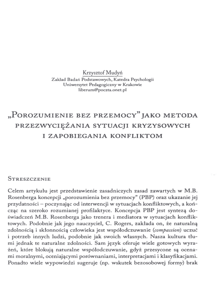 Krzysztof Mudyń Zakład Badań Podstawowych, Katedra Psychologii Uniwersytet Pedagogiczny w Krakowie [email protected] „ P o r o z u m ie n ie b e z p r z e m o c y ” ja k o m e t o d a P R Z E Z W Y C IĘ Ż A N IA S Y T U A C JI K R Y Z Y S O W Y C H I Z A P O B IE G A N IA K O N F L IK T O M S t r e s z c z e n ie Celem artykułu jest przedstawienie zasadniczych zasad zawartych w M.B. Rosenberga koncepcji „porozumienia bez przemocy” (PBP) oraz ukazanie jej przydatności - poczynając od interwencji w sytuacjach konfliktowych, a koń cząc na szeroko rozumianej profilaktyce. Koncepcja PBP jest syntezą do świadczeń M.B. Rosenberga jako trenera i mediatora w sytuacjach konflik towych. Podobnie jak jego nauczyciel, C. Rogers, zakłada on, że naturalną zdolnością i skłonnością człowieka jest współodczuwanie {compassion) uczuć i potrzeb innych ludzi, podobnie jak swoich własnych. Nasza kultura tłu mi jednak te naturalne zdolności. Sam język oferuje wiele gotowych wyra żeń, które blokują naturalne współodczuwanie, gdyż przesycone są ocena mi moralnymi, oceniającymi porównaniami, interpretacjami i klasyfikacjami. Ponadto wiele wypowiedzi sugeruje (np. wskutek bezosobowej formy) brak 216 K rzysztof M udyń osobistej odpowiedzialności nadawcy za treść formułowanych komunikatów. Autor PBP proponuje zatem czterofazowy model empatycznej komunikacji, bez przemocy i manipulacji, który stanowi podstawę prowadzonych przez niego szkoleń. Są to: 1) obserwowanie bez oceniania, 2) rozpoznawanie i wy rażanie uczuć, 3) wiązanie aktualnie przeżywanych uczuć z potrzebami (war tościami, pragnieniami), 4) formułowanie konkretnych próśb (ale nie żądań). Słowa kluczowe: porozum ienie b ez przemocy, obserwowanie bez oceniania, rozpo znawanie i wyrażanie uczuć, empatia, „język żyrafy” 1. A u to r i g en ez a je g o ko n cepcji Koncepcja Marshalla B. Rosenberga (1999/2003)1jest modelem komunika cji przeciwdziałającej pojawianiu się przemocy, a zarazem programem zacho wań komunikacyjnych, umożliwiającym radzenie sobie w sytuacjach konflik towych, gdzie zaangażowane są co najmniej dwie osoby lub dwie zwaśnione grupy. Uniwersalność modelu sprawia, że nie ma znaczenia, czy konflikt roz grywa się w kontekście lokalnym czy międzynarodowym, czy ma charak ter interpersonalny czy raczej międzygrupowy. Koncepcja „porozumienia bez przemocy” (PBP) jest ukoronowaniem wieloletnich doświadczeń autora jako mediatora, interweniującego w trudnych sytuacjach konfliktowych czy wręcz kryzysowych. Sam autor uważa się za ucznia Carla R. Rogersa i - jak się wydaje - robi on jak najlepszy użytek z jego humanistycznej spuścizny. Autor jest psycholo giem klinicznym o ogromnym doświadczeniu praktycznym, począwszy od lat sześćdziesiątych zaangażowanym w konstruktywne rozwiązywanie konflik tów, bez względu na ich przyczyny, zasięg czy lokalizację. Brał czynny udział i prowadził szkolenia dla osób uczestniczących w rozwiązywaniu konfliktów regionalnych (często na podłożu etnicznym) w takich krajach, jak: Izrael, Pa lestyna, Irlandia, Rosja, Serbia, Chorwacja czy Nigeria. Prowadził trenin gi w USA i Kanadzie oraz w większości krajów europejskich, tj. w Szwecji, Szwajcarii, we Włoszech, w Niemczech, Dani, Belgii, Holandii, Wielkiej Brytanii, Francji, Austrii, a także w Polsce. 1 W ostatnich dziesięciu latach ukazało się w języku polskim wiele kolejnych prac, roz wijających i popularyzujących tę koncepcję (m.in. Rosenberg, 2006,2009; Holler, 2010). .Porozumienie bez przemocy ” jako metoda przezwyciężania sytuacji... 217 Jest rzeczą zadziwiająca, iż dobrze rozumiana empatia - pojmowana zgodnie z podejściem Carla Rogersa (1991) - może stanowić niezastąpio ną, solidną podstawę rozwiniętej przez M.B. Rosenberga koncepcji „porozu mienia bez przemocy”. Niełatwo to zaakceptować, gdyż empatia kojarzy się nam zwykle z wrażliwością lub nadwrażliwością, a wrażliwość ze słabością raczej niż z zasobem, który może stać się cenną i wręcz niezastąpioną kom petencją społeczną. Opór przed zaakceptowaniem i uwierzeniem w jej sku teczność przypomina nieco niewiarę laików w to, że np. aikido lub kung-fu mogą być skuteczniejszą formą radzenia sobie z agresją napastnika niż tech niki walki stosowane w boksie zawodowym lub „twardych” szkołach kara te. Podkreślić należy, iż podobnie jak w przypadku aikido, koncepcja NVC nie jest sztuką walki, lecz raczej skutecznym sposobem unikania walki, sztu ką służącą „pokojowej koegzystencji” ludzi o różnych przekonaniach, potrze bach i interesach. Rozdział ósmy swej klasycznej pracy (1999/2003) zatytuło wał Rosenberg Potęga empatii. Sformułowanie to należy rozumieć dosłownie. Rosenberg, podobnie jak jego nauczyciel Carl Rogers2, uważa bowiem, że autentyczny, empatyczny, czyli nieinwazyjny i nieoceniający kontakt z dru gim człowiekiem ma walory leczące. Empatyczna otwartość jest sprawą kluczową. Empatia - czy raczej „empatia wysokiej jakości” - w rozumieniu Rosen berga jest pojęciem dającym się zrozumieć, choć opornym na definiowanie. Jest czymś w rodzaju towarzyszącej obecności, otwartej na uczucia rozmówcy. Otwartej w sposób spontaniczny, niewymuszony. Mówiąc słowami autora jest otwartością „na boską energię, która przepływa przez drugą osobę” (Ro senberg, 2009, s. 59). I dalej - „Kiedy wyjaśniam, czym jest empatia używam najchętniej porównań i obrazów, jak choćby tego z deską surfingową. Chodzi o to, by poddać się naturalnemu nurtowi energii, który porusza we mnie mój rozmówca. Tak jak w czasie surfowania —zawierzam sile, która mnie unosi. Gdy metodę Porozumienia bez Przemocy stosuje się mechanicznie, ona nie działa, gdyż umyka gdzieś osoba rozmówcy” (op. cit., s. 63). 2 Przypomnijmy, że cechy relacji, które leczą, wg C. Rogersa, to: 1) autentyczno