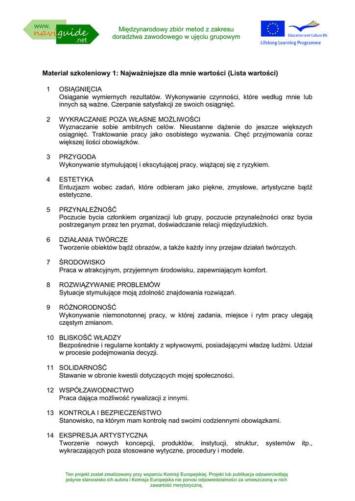 Międzynarodowy zbiór metod z zakresu doradztwa zawodowego w ujęciu grupowym Materiał szkoleniowy 1: Najważniejsze dla mnie wartości (Lista wartości) 1 OSIĄGNIĘCIA Osiąganie wymiernych rezultatów. Wykonywanie czynności, które według mnie lub innych są ważne. Czerpanie satysfakcji ze swoich osiągnięć. 2 WYKRACZANIE POZA WŁASNE MOŻLIWOŚCI Wyznaczanie sobie ambitnych celów. Nieustanne dążenie do jeszcze większych osiągnięć. Traktowanie pracy jako osobistego wyzwania. Chęć przyjmowania coraz większej ilości obowiązków. 3 PRZYGODA Wykonywanie stymulującej i ekscytującej pracy, wiążącej się z ryzykiem. 4 ESTETYKA Entuzjazm wobec zadań, które odbieram jako piękne, zmysłowe, artystyczne bądź estetyczne. 5 PRZYNALEŻNOŚĆ Poczucie bycia członkiem organizacji lub grupy, poczucie przynależności oraz bycia postrzeganym przez ten pryzmat, doświadczanie relacji międzyludzkich. 6 DZIAŁANIA TWÓRCZE Tworzenie obiektów bądź obrazów, a także każdy inny przejaw działań twórczych. 7 ŚRODOWISKO Praca w atrakcyjnym, przyjemnym środowisku, zapewniającym komfort. 8 ROZWIĄZYWANIE PROBLEMÓW Sytuacje stymulujące moją zdolność znajdowania rozwiązań. 9 RÓŻNORODNOŚĆ Wykonywanie niemonotonnej pracy, w której zadania, miejsce i rytm pracy ulegają częstym zmianom. 10 BLISKOŚĆ WŁADZY Bezpośrednie i regularne kontakty z wpływowymi, posiadającymi władzę ludźmi. Udział w procesie podejmowania decyzji. 11 SOLIDARNOŚĆ Stawanie w obronie kwestii dotyczących mojej społeczności. 12 WSPÓŁZAWODNICTWO Praca dająca możliwość rywalizacji z innymi. 13 KONTROLA I BEZPIECZEŃSTWO Stanowisko, na którym mam kontrolę nad swoimi codziennymi obowiązkami. 14 EKSPRESJA ARTYSTYCZNA Tworzenie nowych koncepcji, produktów, instytucji, struktur, wykraczających poza stosowane wytyczne, procedury i modele. systemów Ten projekt został zrealizowany przy wsparciu Komisji Europejskiej. Projekt lub publikacja odzwierciedlają jedynie stanowisko ich autora i Komisja Europejska nie ponosi odpowiedzialności za umieszczoną w nich zawartość merytoryczną. itp., Międzynarodowy zbiór metod z zakresu doradztwa zawodowego w ujęciu grupowym 15 ZASADY ETYCZNE Praca w sektorze zgodnym z moimi zasadami moralnymi, który nie pozostaje w sprzeczności z moimi osobistymi przekonaniami. 16 UZNANIE KOMPETENCJI Potwierdzenie, że dobrze wykonuję swoją pracę, że wywiązuje się ze wszystkich swoich obowiązków, a inni widzą we mnie kompetentnego pracownika. 17 STRUKTURA OKREŚLONA PRZEZ INNYCH Praca w środowisku wyznaczającym wyraźną strukturę i zapewniającym jasne wytyczne, których mogę przestrzegać. 18 AUTOPREZENTACJA Możliwość znalezienia się w centrum uwagi i przyciągania uwagi innych. 19 REPUTACJA / UZNANIE Uznanie i szacunek innych osób. 20 PRESJA CZASU Praca wymagająca osiągania rezultatów w krótkim czasie i przestrzegania napiętych terminów. 21 PREDYSPOZYCJE / ENTUZJAZM Wykonywanie pracy odpowiadającej moim zainteresowaniom i predyspozycjom. 22 KONSEKWENCJE SPOŁECZNE Wykonywanie pracy, która przynosi daleko idące skutki społeczne. 23 DOCHÓD Dochód pozwalający mi na robienie wszystkiego, co zechcę, bez konieczności martwienia się o pieniądze. 24 NIEZALEŻNOŚĆ Praca, w której nikt mi nie rozkazuje i nie muszę tłumaczyć się z każdego kroku. 25 WPŁYWY Pozycja gwarantująca władzę i wpływy (również władzę nad innymi). 26 INTELIGENCJA Bycie postrzeganym przez innych jako osoba o wyjątkowej inteligencji. Bycie postrzeganym w kategoriach eksperta. 27 SPOKÓJ Praca bez stresu i presji. 28 NAUKA Poszerzanie własnej wiedzy, wiedzy specjalistycznej oraz zdobywanie wiedzy w zakresie mojej specjalizacji. Ten projekt został zrealizowany przy wsparciu Komisji Europejskiej. Projekt lub publikacja odzwierciedlają jedynie stanowisko ich autora i Komisja Europejska nie ponosi odpowiedzialności za umieszczoną w nich zawartość merytoryczną. Międzynarodowy zbiór metod z zakresu doradztwa zawodowego w ujęciu grupowym 29 PRZYWÓDZTWO Pełnienie roli osoby, na której mogą polegać inni, gdy szukają własnej drogi; wyznaczanie celów do osiągnięcia. 30 CZAS WOLNY Znalezienie pracy pozostawiającej wystarczającą ilość czasu wolnego na kontynuację innych zajęć. 31 DOBRY DOJAZD Mieszkanie w miejscu zapewniającym spokojne życie osobiste oraz szybki dojazd do miejsca pracy. 32 DECYZYJNOŚĆ Możliwość podejmowania decyzji mających wpływ na jakość i powodzenie osiąganych rezultatów. 33 W SŁUŻBIE INNYM Możliwość oferowania innym różnego rodzaju pomocy: opieki, ratunku, kształcenia itp. 34 PORZĄDEK Praca w dobrze zorganizowanym środowisku. Przestrzeganie szczegółowych planów i ścisłych zasad. 35 WYZWANIA FIZYCZNE Praca, w której największe znaczenie mają siła i wysiłek fizyczny. 36 ZABAWA Działania stanowiące „czystą przyjemność”. Udział w grach, zawodach sportowych i innych przyjemnych wydarzeniach. Zachowanie swego rodzaju „niewinności”. Nietraktowanie siebie zbyt poważnie. 37 WŁADZA / AUTORYTET Zajmowanie stanowiska, na którym mogę planować i kontrolować pracę innych. 38 DOKŁADNOŚĆ Wykonywanie zadań wymagających dużej dawki cierpliwości, niepozostawiających prawie żadnego marginesu błędu. 39 KORZYŚCI Wykonywanie pracy, w której osiągane rezultaty mają bezpośredni wpływ na dochód. 40 KONTAKT Bezpośredni kontakt z innymi ludźmi. 41 BEZPIECZEŃSTWO Świadomość, że będę mieć pracę i przyzwoitą pensję. 42 STABILNOŚĆ Chęć pozostania w tym samym sektorze, w którym dochodzi do niewielu zmian. Ten projekt został zrealizowany przy wsparciu Komisji Europejskiej. Projekt lub publikacja odzwierciedlają jedynie stanowisko ich autora i Komisja Europejska nie ponosi odpowiedzialności za umieszczoną w nich zawartość merytoryczną. Międzynarodowy zbiór metod z zakresu doradztwa zawodowego w ujęciu grupowym 43 STATUS Wykonywanie zawo