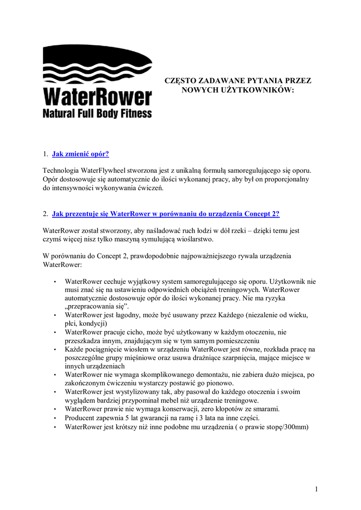 CZĘSTO ZADAWANE PYTANIA PRZEZ NOWYCH UŻYTKOWNIKÓW: 1. Jak zmienić opór? Technologia WaterFlywheel stworzona jest z unikalną formułą samoregulującego się oporu. Opór dostosowuje się automatycznie do ilości wykonanej pracy, aby był on proporcjonalny do intensywności wykonywania ćwiczeń. 2. Jak prezentuje się WaterRower w porównaniu do urządzenia Concept 2? WaterRower został stworzony, aby naśladować ruch łodzi w dół rzeki – dzięki temu jest czymś więcej nisz tylko maszyną symulującą wioślarstwo. W porównaniu do Concept 2, prawdopodobnie najpoważniejszego rywala urządzenia WaterRower: • • • • • • • • • WaterRower cechuje wyjątkowy system samoregulującego się oporu. Użytkownik nie musi znać się na ustawieniu odpowiednich obciążeń treningowych. WaterRower automatycznie dostosowuje opór do ilości wykonanej pracy. Nie ma ryzyka „przepracowania się”. WaterRower jest łagodny, może być usuwany przez Każdego (niezalenie od wieku, płci, kondycji) WaterRower pracuje cicho, może być użytkowany w każdym otoczeniu, nie przeszkadza innym, znajdującym się w tym samym pomieszczeniu Każde pociągnięcie wiosłem w urządzeniu WaterRower jest równe, rozkłada pracę na poszczególne grupy mięśniowe oraz usuwa drażniące szarpnięcia, mające miejsce w innych urządzeniach WaterRower nie wymaga skomplikowanego demontażu, nie zabiera dużo miejsca, po zakończonym ćwiczeniu wystarczy postawić go pionowo. WaterRower jest wystylizowany tak, aby pasował do każdego otoczenia i swoim wyglądem bardziej przypominał mebel niż urządzenie treningowe. WaterRower prawie nie wymaga konserwacji, zero kłopotów ze smarami. Producent zapewnia 5 lat gwarancji na ramę i 3 lata na inne części. WaterRower jest krótszy niż inne podobne mu urządzenia ( o prawie stopę/300mm) 1 3. Czy wioślarstwo nie szkodzi plecom? Wioślarstwo jest naprawdę ćwiczeniem całego ciała. Wioślarstwo przekazuje pracę dynamicznych grup mięśniowych (ramiona i nogi) przez tułów. Aby móc przekazać tą pracę wioślarz pracuje gorsetem mięśniowym tułowia. Wzmacnia w ten sposób tułów i odpowiednio formuje sylwetkę. W ten sposób wioślarstwo rozwija silną sylwetkę. Wzmocnienie mięśni tułowia jest podstawą dobrego samopoczucia i jest niezbędne w rehabilitacji chorób pleców – jednym z najczęściej spotykanych schorzeń w naszym społeczeństwie. Słabsze maszyny imitujące wiosłowanie często na początku wywołują u ćwiczącego niezdrowe wygięcie kręgosłupa. 4. Jak często należy zmieniać wodę, aby utrzymać zbiornik w czystości? Urządzenie WaterRower nie wymaga konserwacji. Jedyne co trzeba wykonywać regularnie, to kontrolować stan wody w zbiorniku. Aby oczyścić wodę, wystarczy wrzucić do niej puritab – tabletkę dostarczoną wraz z urządzeniem. Częstość użycia zależy od ilości światła, na jakie wystawiona jest woda. Ilość chloru zmniejsza się wraz z wystawieniem wody na działanie światła. Dlatego należy co jakiś czas ją zwiększać za pomocą dostarczonych tabletek chlorowych. Im jest jaśniej, tym częściej będzie się to działo. Każde urządzenie WaterRower dostarczane jest z zapasem tabletek chlorowych, które oczywiście mona także zamówić w internecie. Oczywiście wodę można wymienić w prosty sposób, używając w tym celu pompki dostarczonej z każdym urządzeniem. Jednakże jest to tylko wlewanie świeżej wody. O wiele prostsze jest zwiększenie ilości pierwiastków chemicznych, utrzymujących czystość wody, dokładnie tak jak w przypadku basenu lub łózka wodnego. 2 5. Jakie części zużywają się? Jakie części obejmuje gwarancja? Urządzenie WaterRower praktycznie nie wymaga konserwacji. Urządzenie wymaga tylko jednej, regularnej czynności konserwacyjnej – utrzymania poziomu wody w zbiorniku. Wymaga to okresowego dodawania tabletek chlorowych do zbiornika z wodą. Poza tym w urządzeniu WaterRower nie zużywają się żadne części. Jedynym obszarem narażonym na zużycie są paski (taśmy) mocujące stopy (nie są objęte gwarancją) oraz baterie w monitorze S4 ( nie są objęte gwarancją ) WaterRower zapewnia nastające warunki gwarancyjne: 1 rok na ramę i części Po rejestracji WaterRower podnosi gwarancję do: 5 lat na ramę i 3 lat na części -Tylko po dokonaniu kompletnej Rejestracji Gwarancyjnej. Gwarancja obejmuje także czynności wykonywane w serwisie WaterRower. Prowadzimy także pełen serwis online na stronie WaterRowerService.com 6. Jak ciężka/wysoka osoba może korzystać z urządzenia WaterRower? Mimo tego, że WaterRower został zaprojektowany jak urządzenie dla każdego, posiada pewne limity. Drewniana rama nie powinna się złamać lub wygiąć. Kółka pod krzesełkiem zniosą maksymalnie ciężar 1000 kilogramów (2200 lb). Limit wagi: 1000 kg (2200 lbs) Szyny urządzenia są dostosowane dla osób nie wyższych niż 38". Limit wzrostu: 38" Na specjalne zamówienie dostarczamy ekstra długie szyny, pasujące dla osób do 42’’. 3 7. Jak opróżnia się zbiornik z wodą? Urządzenie WaterRower jest dostarczane wraz ze specjalną pompką, ułatwiającą opróżnianie i napełnianie zbiornika. Aby napełnić zbiornik, wystarczy postawić zbiornik na maszynie, zamontować pompkę, kilka razy nacisnąć, a grawitacja zdziała resztę. Aby opróżnić zbiornik, wystarczy ustawić pusty pojemnik na podłodze i zamontować pompkę. Zalecamy napełnienie zbiornika do 18 litrów (podziałka znajduje się na zbiorniku z boku) i zaznaczenie poziomu wody (np markerem) na zbiorniku. 8. Co jest wyświetlane na monitorze? Monitor WaterRower Serii 4 zawiera siedem okien informacyjnych. Intensywność – pokazuje intensywność ćwiczeń w takich jednostkach jak: m/s (metry na sekundę), mph (mile na godzinę), /500m (czas na 500 metrów), /2km (czas na 2 kilometry), waty i kilokalorie na godzinę. Ilość pociągnięć – pokazuje ilość poc