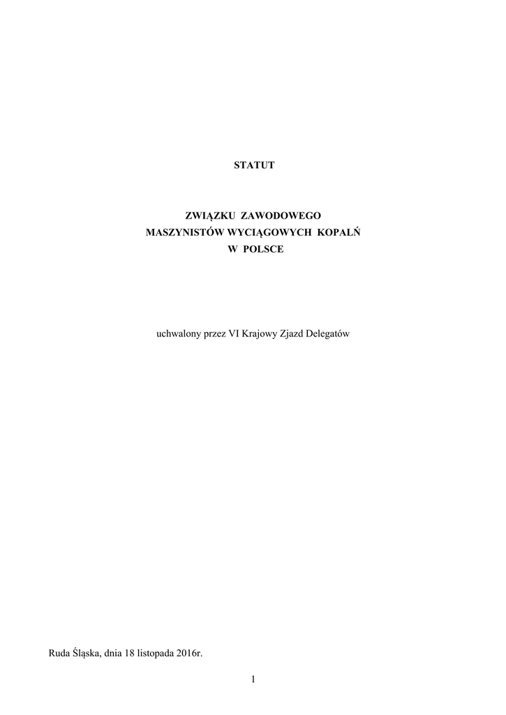 STATUT ZWIĄZKU ZAWODOWEGO MASZYNISTÓW WYCIĄGOWYCH KOPALŃ W POLSCE uchwalony przez VI Krajowy Zjazd Delegatów Ruda Śląska, dnia 18 listopada 2016r. 1 Rozdział I Postanowienia ogólne art.1 Związek Zawodowy Maszynistów Wyciągowych Kopalń w Polsce, zwany dalej Związkiem, jest niezależną oraz samorządną organizacją międzybranżową i wielozakładową zrzeszającą pracowników zatrudnionych w zakładach, do których zastosowanie znajduje prawo geologiczne i górnicze, a w szczególności wykonujących pracę na stanowisku maszynisty wyciągowego i innych stanowiskach związanych z transportem pionowym oraz emerytów i rencistów, którzy przed przejściem na emeryturę byli członkami związku art.2 1. Związek działa na obszarze Rzeczypospolitej Polskiej. 2. Siedzibą Związku jest miasto Katowice. art.3 1. Związek jest niezależny w swojej działalności statutowej od pracodawców, administracji państwowej i samorządu terytorialnego oraz innych organizacji. 2. W swoim działaniu Związek kieruje się zasadami obowiązującego prawa, a w szczególności ustawą o związkach zawodowych i ratyfikowanymi międzynarodowymi konwencjami. art.4 Związek może zawierać porozumienia o współdziałaniu i współpracy z innymi związkami zawodowymi, jeśli statuty i działalność tych związków odpowiadają podstawowym zasadom określonym w niniejszym Statucie. art.5 Podstawą działania Związku jest jego Statut. 2 Rozdział II Cele i zadania Związku art.6 1. Celem działalności Związku jest obrona praw, godności i interesów członków Związku w zakresie warunków pracy i płac oraz warunków socjalno - bytowych i kulturalnych, a w szczególności: 1. ochrona interesów zdrowotnych, materialnych, socjalnych i kulturalnych członków i ich rodzin, 2. zabezpieczenie praw pracowniczych w zakresie wykonywanej pracy zawodowej, wynagrodzenia, warunków socjalno-bytowych oraz bezpieczeństwa i higieny pracy, 3. podejmowanie starań o zharmonizowanie prawidłowego działania zakładu pracy z interesami pracowników, 4. umacnianie rodziny oraz ochrona życia rodzinnego, 5. szerzenie demokratyzmu i umacnianie koleżeńskiej solidarności w stosunkach wzajemnych, 6. zapewnienie pracownikom warunków podnoszenia kwalifikacji zawodowych, 7. wpływ na kształtowanie polityki gospodarczej i społecznej, 8. kształtowanie aktywnej postawy działania dla dobra Ojczyzny, 9. podejmowanie działań na rzecz ochrony naturalnego środowiska człowieka, 10. pogłębianie wiedzy członków Związku, 11. przeciwdziałanie bezrobociu i pomoc bezrobotnym członkom Związku. 2. Związek realizuje swoje cele przez: 1. reprezentowanie swoich członków wobec pracodawców, władz i organów administracji państwowej, samorządu terytorialnego oraz organizacji i instytucji politycznych i społecznych, 2. współdziałanie z organami władzy, administracji państwowej i samorządu terytorialnego w zakresie wynikającym z przepisów prawa, 3. dążenie do systematycznej poprawy sytuacji materialnej i socjalnej pracowników, emerytów i rencistów, troszczenie się o ich sprawy bytowe oraz udzielanie im pomocy prawnej w dochodzeniu należnych uprawnień i świadczeń, 4. zawieranie i wypowiadanie układów zbiorowych pracy oraz innych porozumień pomiędzy Związkiem a pracodawcą, 5. prowadzenie rozmów, negocjacji i sporów oraz udzielanie pomocy prawnej i podejmowanie interwencji w przypadku konfliktu między pracownikiem a pracodawcą, 6. zajmowanie stanowisk w indywidualnych sprawach pracowniczych w zakresie unormowanym przez prawo pracy, 7. opiniowanie założeń i projektów aktów prawnych w granicach i trybie określonym obowiązującym ustawodawstwem, 8. branie udziału w nadzorze nad przestrzeganiem przepisów prawa pracy w zakładach pracy 3 zatrudniających członków Związku, 9. sprawowanie kontroli nad warunkami bezpieczeństwa i higieny pracy; podejmowanie przewidzianych prawem działań w przypadku występowania zagrożeń dla życia i zdrowia pracowników, zapewnianie okresowej kontroli stanowisk pracy i zakazywanie swym członkom pracy na stanowiskach nie odpowiadających ustalonym warunkom, 10. informowanie członków o działaniach Związku oraz prowadzenie działalności szkoleniowej, wydawniczej i prasowej, 11. inicjowanie i organizowanie samopomocy członków Związku, 12. udzielanie pomocy materialnej członkom Związku, 13. pozyskiwanie środków przeznaczonych na realizację zadań statutowych, 14. organizowanie i kierowanie akcjami protestacyjnymi załóg w przypadku istotnego naruszenia interesów pracowniczych, w szczególnie uzasadnionych przypadkach proklamowanie strajku, 15. przeciwdziałanie przejawom patologii społecznej, 16. popieranie inicjatyw w zakresie usprawnienia gospodarki, rozwoju kultury, oświaty, nauki i postępu technicznego, 17. prowadzenie działalności oświatowo - kulturalnej, tworzenie warunków do odpoczynku po pracy, 18. współdziałanie ze służbą zdrowia w celu ochrony zdrowia pracowników i ich rodzin, 19. prowadzenie badań nad warunkami życia ogółu pracowników, w szczególności nad poziomem kosztów utrzymania, 20. tworzenie funduszy celowych, w tym strajkowego i pomoc bezrobotnym, 21. podejmowanie wszelkich innych działań jakie mogą się okazać konieczne w celu obrony interesów Związku i jego członków. Rozdział III Członkostwo art.7 1. Członkiem Związku może być każdy zatrudniony w zakładach, do których zastosowanie znajduje prawo geologiczne i górnicze, a w szczególności wykonujący pracę na stanowisku maszynisty wyciągowego i innych stanowiskach związanych z transportem pionowym. 2. Członkiem Związku może być również emeryt i rencista oraz przebywający na „urlopie górniczym” lub innym świadczeniu przewidzianym stosowną ustawą, który był zatrudniony zgodnie z art. 7 ust.1. 3. Członkostwo Związku zachowuje także osoba, która bezpośrednio przed zostaniem osobą bezrobotną w rozumieniu pr