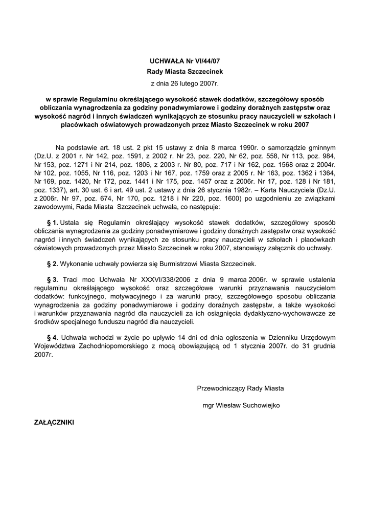 UCHWAŁA Nr VI/44/07 Rady Miasta Szczecinek z dnia 26 lutego 2007r. w sprawie Regulaminu określającego wysokość stawek dodatków, szczegółowy sposób obliczania wynagrodzenia za godziny ponadwymiarowe i godziny doraźnych zastępstw oraz wysokość nagród i innych świadczeń wynikających ze stosunku pracy nauczycieli w szkołach i placówkach oświatowych prowadzonych przez Miasto Szczecinek w roku 2007 Na podstawie art. 18 ust. 2 pkt 15 ustawy z dnia 8 marca 1990r. o samorządzie gminnym (Dz.U. z 2001 r. Nr 142, poz. 1591, z 2002 r. Nr 23, poz. 220, Nr 62, poz. 558, Nr 113, poz. 984, Nr 153, poz. 1271 i Nr 214, poz. 1806, z 2003 r. Nr 80, poz. 717 i Nr 162, poz. 1568 oraz z 2004r. Nr 102, poz. 1055, Nr 116, poz. 1203 i Nr 167, poz. 1759 oraz z 2005 r. Nr 163, poz. 1362 i 1364, Nr 169, poz. 1420, Nr 172, poz. 1441 i Nr 175, poz. 1457 oraz z 2006r. Nr 17, poz. 128 i Nr 181, poz. 1337), art. 30 ust. 6 i art. 49 ust. 2 ustawy z dnia 26 stycznia 1982r. – Karta Nauczyciela (Dz.U. z 2006r. Nr 97, poz. 674, Nr 170, poz. 1218 i Nr 220, poz. 1600) po uzgodnieniu ze związkami zawodowymi, Rada Miasta Szczecinek uchwala, co następuje: § 1. Ustala się Regulamin określający wysokość stawek dodatków, szczegółowy sposób obliczania wynagrodzenia za godziny ponadwymiarowe i godziny doraźnych zastępstw oraz wysokość nagród i innych świadczeń wynikających ze stosunku pracy nauczycieli w szkołach i placówkach oświatowych prowadzonych przez Miasto Szczecinek w roku 2007, stanowiący załącznik do uchwały. § 2. Wykonanie uchwały powierza się Burmistrzowi Miasta Szczecinek. § 3. Traci moc Uchwała Nr XXXVI/338/2006 z dnia 9 marca 2006r. w sprawie ustalenia regulaminu określającego wysokość oraz szczegółowe warunki przyznawania nauczycielom dodatków: funkcyjnego, motywacyjnego i za warunki pracy, szczegółowego sposobu obliczania wynagrodzenia za godziny ponadwymiarowe i godziny doraźnych zastępstw, a także wysokości i warunków przyznawania nagród dla nauczycieli za ich osiągnięcia dydaktyczno-wychowawcze ze środków specjalnego funduszu nagród dla nauczycieli. § 4. Uchwała wchodzi w życie po upływie 14 dni od dnia ogłoszenia w Dzienniku Urzędowym Województwa Zachodniopomorskiego z mocą obowiązującą od 1 stycznia 2007r. do 31 grudnia 2007r. Przewodniczący Rady Miasta mgr Wiesław Suchowiejko ZAŁĄCZNIKI Załącznik do Uchwały Nr VI/44/07 Rady Miasta Szczecinek z dnia 26 lutego 2007r. REGULAMIN określający wysokość stawek dodatków, szczegółowy sposób obliczania wynagrodzenia za godziny ponadwymiarowe i godziny doraźnych zastępstw oraz wysokość nagród i innych świadczeń wynikających ze stosunku pracy nauczycieli w szkołach i placówkach oświatowych prowadzonych przez Miasto Szczecinek w roku 2007 I. Postanowienia ogólne § 1. 1. Do obliczenia średniej wynagrodzeń nauczycieli, uwzględniając przewidywaną strukturę zatrudnienia w roku 2007, przyjmuje się osoby w pełnym i niepełnym wymiarze godzin. 2. Liczba osób przyjęta do obliczeń jest sumą liczby osób zatrudnionych na pełny etat i etatów przeliczeniowych wynikających z zatrudnienia osób w niepełnym wymiarze zajęć. § 2. Minimalne stawki wynagrodzenia zasadniczego oraz tabelę zaszeregowania dla nauczycieli określa rozporządzenie Ministra Edukacji Narodowej z dnia 6 marca 2006 r. w sprawie wysokości minimalnych stawek wynagrodzenia zasadniczego nauczycieli, ogólnych warunków przyznawania dodatków do wynagrodzenia zasadniczego oraz wynagrodzeń za pracę w dniu wolnym od pracy (Dz. U. Z 2006 r. Nr 432, poz. 293). § 3. Regulamin niniejszy określa wysokość stawek, sposób obliczania nauczycielom: a) dodatku motywacyjnego, b) dodatku za wysługę lat, c) dodatku funkcyjnego, d) dodatku za warunki pracy, e) wynagrodzenia za godziny ponadwymiarowe i godziny, f) doraźnych zastępstw, g) nagród ze specjalnego funduszu nagród. oraz zasady wypłacania § 4. Ilekroć w dalszej treści niniejszego regulaminu jest mowa bez bliższego określenia o: a) szkole – należy przez to rozumieć także przedszkole, b) organie prowadzącym szkołę – należy przez to rozumieć Burmistrza Miasta Szczecinek, c) nauczycielu – należy przez to rozumieć pracownika pedagogicznego szkoły, placówki oraz zakładu doskonalenia nauczycieli, d) ZBSiP – należy przez to rozumieć Zakład Budżetowy Szkół i Przedszkoli w Szczecinku, jednoosobowo reprezentowany przez Dyrektora, e) dyrektorze szkoły – należy przez to rozumieć również wicedyrektora szkoły oraz osoby, którym czasowo powierzono pełnienie funkcji dyrektora, bądź wicedyrektora, f) roku szkolnym – należy przez to rozumieć okres od 01 września jednego roku do 31 sierpnia roku następnego, g) rozporządzeniu – należy przez to rozumieć rozporządzenie MEN z dnia 6 marca 2006 roku, o którym mowa w § 2 niniejszego regulaminu. II. Dodatek motywacyjny § 5. Do ogólnych warunków przyznawania nauczycielom oraz nauczycielom sprawującym funkcje kierownicze dodatku motywacyjnego należą: a) osiągnięcia w realizowanym procesie dydaktycznym, b) osiągnięcia wychowawczo-opiekuńcze, c) wprowadzanie innowacji pedagogicznych, skutkujących efektami w procesie kształcenia i wychowania, d) zaangażowanie w realizację czynności i zajęć, o których mowa w art. 42 ust. 1 pkt 2 Karty Nauczyciela, e) szczególne efektywne wypełnianie zadań i obowiązków związanych z powierzonym stanowiskiem, f) realizowanie w szkole zadań edukacyjnych, wynikających z przyjętych przez organ prowadzący priorytetów w realizowanej lokalnej polityce oświatowej. § 6. 1. Szczegółowymi przesłankami przyznania nauczycielowi dodatku motywacyjnego jest uzyskanie szczególnych osiągnięć dydaktycznych, wychowawczych i opiekuńczych, a w szczególności: a) uzyskanie przez uczniów, z uwzględnieniem ich możliwości i pracy nauczyciela, co najmniej dobrych osiągnięć dydaktyczno – wychowawczych potwierdzo
