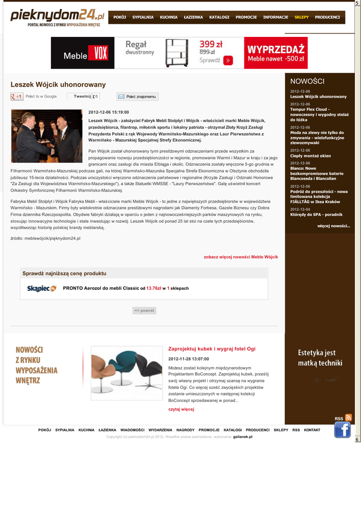 5 SYPIALNIA POKÓJ KUCHNIA KATALOGI ŁAZIENKA PROMOCJE INFORMACJE Tweetnij 0 PRODUCENCI NOWOŚCI Leszek Wójcik uhonorowany Poleć to w Google SKLEPY 2012-12-06 Leszek Wójcik uhonorowany Poleć znajomemu 2012-12-06 15:19:00 Leszek Wójcik - założyciel Fabryk Mebli Stolpłyt i Wójcik - właścicieli marki Meble Wójcik, przedsiębiorca, filantrop, miłośnik sportu i lokalny patriota - otrzymał Złoty Krzyż Zasługi Prezydenta Polski z rąk Wojewody Warmińsko-Mazurskiego oraz Laur Pierwszeństwa z Warmińsko - Mazurskiej Specjalnej Strefy Ekonomicznej. Pan Wójcik został uhonorowany tymi prestiżowymi odznaczeniami przede wszystkim za propagowanie rozwoju przedsiębiorczości w regionie, promowanie Warmii i Mazur w kraju i za jego granicami oraz zasługi dla miasta Elbląga i okolic. Odznaczenia zostały wręczone 5-go grudnia w Filharmonii Warmińsko-Mazurskiej podczas gali, na której Warmińsko-Mazurska Specjalna Strefa Ekonomiczna w Olsztynie obchodziła jubileusz 15-lecia działalności. Podczas uroczystości wręczono odznaczenia państwowe i regionalne (Krzyże Zasługi i Odznaki Honorowe "Za Zasługi dla Województwa Warmińsko-Mazurskiego"), a także Statuetki WMSSE - "Laury Pierwszeństwa". Galę uświetnił koncert Orkiestry Symfonicznej Filharmonii Warmińsko-Mazurskiej. Fabryka Mebli Stolpłyt i Wójcik Fabryka Mebli - właściciele marki Meble Wójcik - to jedne z największych przedsiębiorstw w województwie Warmińsko - Mazurskim. Firmy były wielokrotnie odznaczane prestiżowymi nagrodami jak Diamenty Forbesa, Gazele Biznesu czy Dobra Firma dziennika Rzeczpospolita. Obydwie fabryki działają w oparciu o jeden z najnowocześniejszych parków maszynowych na rynku, stosując innowacyjne technologie i stale inwestując w rozwój. Leszek Wójcik od ponad 25 lat stoi na czele tych przedsiębiorstw, współtworząc historię polskiej branży meblarską. 2012-12-06 Tempur Flex Cloud nowoczesny i wygodny stelaż do łóżka 2012-12-06 Moda na zlewy nie tylko do zmywania - wielofunkcyjne zlewozmywaki 2012-12-06 Ciepły montaż okien 2012-12-06 Blanco: Nowe bezkompromisowe baterie Blancoseda i Blancolian 2012-12-06 Podróż do przeszłości - nowa limitowana kolekcja FJÄLLTÅG w Ikea Kraków 2012-12-04 Którędy do SPA - poradnik więcej nowości... źródło: meblewójcik/pięknydom24.pl zobacz więcej nowości Meble Wójcik Sprawdź najniższą cenę produktu PRONTO Aerozol do mebli Classic od 13.76zł w 1 sklepach << powrót Zaprojektuj kubek i wygraj fotel Ogi 2012-11-28 13:07:00 Możesz zostać kolejnym międzynarodowym Projektantem BoConcept. Zaprojektuj kubek, prześlij swój własny projekt i otrzymaj szansę na wygranie fotela Ogi. Co więcej sześć zwycięskich projektów zostanie umieszczonych w następnej kolekcji BoConcept sprzedawanej w ponad... czytaj więcej RSS POKÓJ :: SYPIALNIA :: KUCHNIA :: ŁAZIENKA :: WIADOMOŚCI :: WYDARZENIA :: NAGRODY :: PROMOCJE :: KATALOGI :: PRODUCENCI :: SKLEPY :: RSS :: KONTAKT Copyright (c) pieknydom24.pl 2012, Wszelkie prawa zastrzeżone, wykonanie: golianek.pl 6
