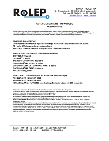 RYNEK – ROLEP TM Ul. Traugutta 40, 05-825 Grodzisk Mazowiecki Tel. +48 22 7342466, fax 22 2442549 [email protected], www.rolep.pl KARTA CHARAKTERYSTYKI WYROBU ROLMONT 401 WAŻNE: Zawarte tu dane zostały opracowane na podstawie własnych badań. Prosimy o dokładne zapoznanie się z niniejszą kartą przed rozpoczęciem użytkowania produktu. Z kartą winien zapoznać się zarówno nabywca, jak i ostateczny użytkownik. RYNEK - ROLEP TM nie ponosi żadnej odpowiedzialności za straty spowodowane przez produkt, zwłaszcza wynikłe z jego nieodpowiedniego użytkowania. PRODUKT: ROLMONT 401 OPIS: taśma dwustronnie lepna do trwałego montażu na bazie wzmocnionej pianki PE i kleju AM do warunków ekstremalnych ZABEZPIECZENIE WARSTWY KLEJĄCEJ: folia silikonowana biała PIANKA PE fiz. sieciowana, zamkniętokomórkowa GĘSTOŚĆ: 90 kg/m3 GRUBOŚĆ: 0,8 mm ZAKRES TEMPERATUR: -40/+95°C ODPORNOŚĆ NA WODE: b. dobra ODPORNOŚĆ NA UV i WARUNKI ATM.: b. dobra ODPORNOŚĆ NA OLEJE: b. dobra KOLOR: czarny/biały WARSTWA KLEJOWA: klej AM do warunków ekstremalnych ADHEZJA: 27,5 [N] AFERA 4001 KOHEZJA: 45,0 [N] AFERA 4012 KLASA SPALANIA: FMVSS302 (prędkość spalania nie więcej niż 100 mm/min) Niżej ważne informacje, złożenie zamówienia jest równoznaczne z zapoznaniem się i akceptacją: 1. Wszystkie wyroby mają charakter techniczny, weryfikacji podlegają wyłącznie parametry podane w karcie charakterystyki wyrobu, parametry estetyczne i inne nie opisane w karcie nie są weryfikowane. 2. Tolerancja grubości dla materiałów porowatych wynosi +/- 0,5 mm. 3. Stosowanie materiałów samoprzylepnych: powierzchnia aplikacji powinna być sucha, czysta, wolna od tłuszczu, olejów i nie wykończona antyadhezyjnie, nie zalecamy aplikacji na powierzchnie inne niż płaskie. 4. MAGAZYNOWANIE: Przechowywać w umiarkowanej temperaturze (15-22'C), w suchym miejscu. Z dala od ciepła, promieni słonecznych lub UV. 5. UŻYTKOWANIE: Dane katalogowe są wynikiem badań przeprowadzonych w warunkach laboratoryjnych, więc przed podjęciem decyzji o użytkowaniu w innych warunkach, wskazane jest uprzednie przeprowadzenie testów we własnym zakresie. Ponieważ sposób zastosowania produktu jest całkowicie zależny od użytkownika, to użytkownik bierze na siebie odpowiedzialność za właściwy wybór i zastosowanie produktu. Producent nie bierze na siebie odpowiedzialności za niewłaściwą aplikację, rozszerzalność oraz nieodpowiedni lub zły stan podłoża, który może być wynikiem czynników atmosferycznych, przygotowania wstępnego, wad konstrukcyjnych lub błędnych założeń w fazie projektu. Bank: PKO BP 50 10205558 1111101113200088 NIP: 684-217-28-39 REGON: 370468506