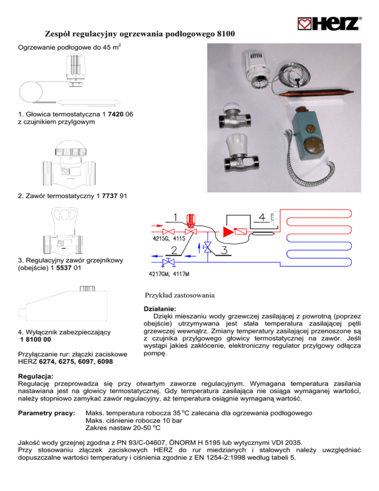 Zespół regulacyjny ogrzewania podłogowego 8100 Ogrzewanie podłogowe do 45 m2 1. Głowica termostatyczna 1 7420 06 z czujnikiem przylgowym 2. Zawór termostatyczny 1 7737 91 3. Regulacyjny zawór grzejnikowy (obejście) 1 5537 01 Przykład zastosowania 4. Wyłącznik zabezpieczający 1 8100 00 Przyłączanie rur: złączki zaciskowe HERZ 6274, 6275, 6097, 6098 Działanie: Dzięki mieszaniu wody grzewczej zasilającej z powrotną (poprzez obejście) utrzymywana jest stała temperatura zasilającej pętli grzewczej wewnątrz. Zmiany temperatury zasilającej przenoszone są z czujnika przylgowego głowicy termostatycznej na zawór. Jeśli wystąpi jakieś zakłócenie, elektroniczny regulator przylgowy odłącza pompę. Regulacja: Regulację przeprowadza się przy otwartym zaworze regulacyjnym. Wymagana temperatura zasilania nastawiana jest na głowicy termostatycznej. Gdy temperatura zasilająca nie osiąga wymaganej wartości, należy stopniowo zamykać zawór regulacyjny, aż temperatura osiągnie wymaganą wartość. Parametry pracy: Maks. temperatura robocza 35 oC zalecana dla ogrzewania podłogowego Maks. ciśnienie robocze 10 bar Zakres nastaw 20-50 oC Jakość wody grzejnej zgodna z PN 93/C-04607, ÖNORM H 5195 lub wytycznymi VDI 2035. Przy stosowaniu złączek zaciskowych HERZ do rur miedzianych i stalowych należy uwzględniać dopuszczalne wartości temperatury i ciśnienia zgodnie z EN 1254-2:1998 według tabeli 5. Zespoły regulacyjne HERZ do ogrzewania podłogowego Odmiana Opis Zespół regulacyjny HERZ do ogrzewania podłogowego powierzchnia do 45 m Zespół składa się z: głowicy termostatycznej z czujnikiem powierzchniowym (1 7420 06), wyłącznika zabezpieczającego (1 8100 00), zaworu termostatycznego HERZ-TS-90 DN 15 (1 7723 61), zaworu regulacyjnego HERZ-GP DN 15 (1 5537 01). Zespół regulacyjny HERZ do ogrzewania podłogowego powierzchnia do 85 m Zespół składa się z: głowicy termostatycznej z czujnikiem powierzchniowym (1 7420 06), wyłącznika zabezpieczającego (1 8100 00), zaworu termostatycznego HERZ-TS-90-E DN 15 (1 7723 01), zaworu powrotnego HERZ-RL-1-E DN 20 (1 3723 02). Zespół regulacyjny HERZ do ogrzewania podłogowego powierzchnia do 120 m Zespół składa się z: głowicy termostatycznej z czujnikiem powierzchniowym (1 7420 06), wyłącznika zabezpieczającego (1 8100 00), zaworu termostatycznego HERZ-TS-E DN 20 (1 7723 02), zaworu powrotnego HERZ-RL-1-E DN 25 (1 3723 03). Zespół regulacyjny HERZ do ogrzewania podłogowego powierzchnia do 160 m Zespół składa się z: głowicy termostatycznej z czujnikiem powierzchniowym (1 7420 06), wyłącznika zabezpieczającego (1 8100 00), zaworu termostatycznego HERZ-TS-E DN 25 (1 7723 03), zaworu odcinającego Strömax 4115 DN 32 (1 4115 04). Numer artykułu 1 8100 01 1 8100 02 1 8100 03 1 8100 04 HERZ-Floor Fix, zespół regulacyjny ogrzewania podłogowego do montażu pod tynkiem HERZ-Floor Fix, zespół regulacyjny ogrzewania podłogowego do montażu pod tynkiem do regulacji temperatury pomieszczenia i ograniczenia temperatury medium. Regulacja temperatury pomieszczenia za pomocą: głowicy termostatycznej ze zdalnym nastawianiem 9330 i 7330 lub siłownika termicznego HERZ 7710. Przyłącze do złączy zaciskowych HERZ. W dostawie wraz ze skrzynką podtynkową i pokrywą. 1 8100 10