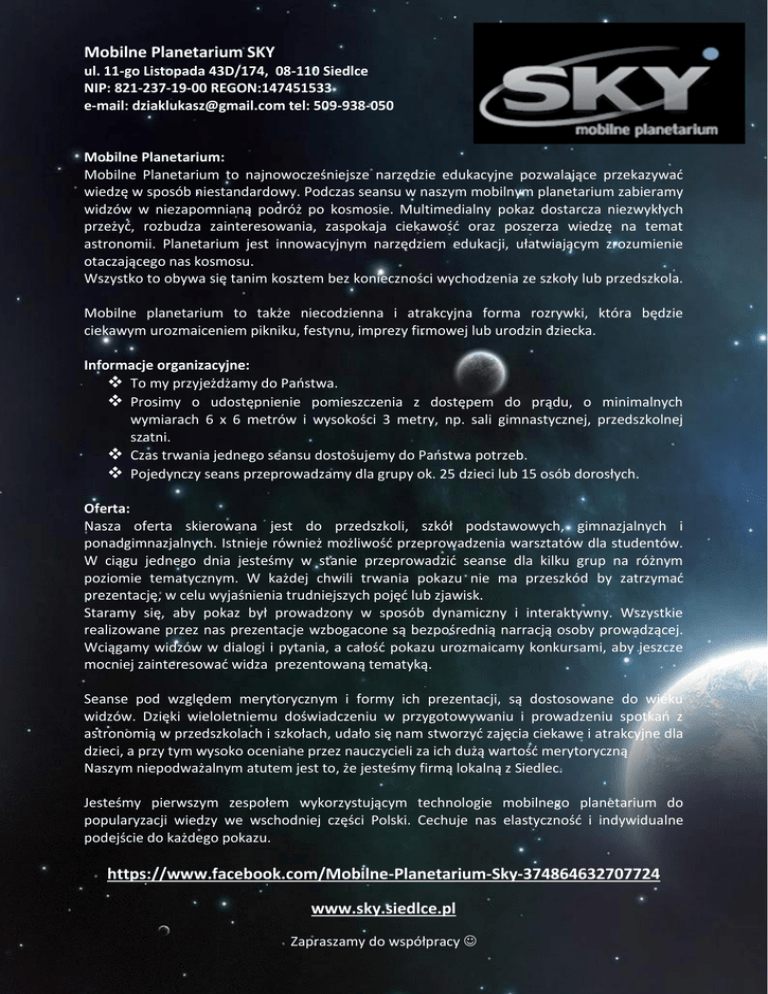 Mobilne Planetarium SKY ul. 11-go Listopada 43D/174, 08-110 Siedlce NIP: 821-237-19-00 REGON:147451533 e-mail: [email protected] tel: 509-938-050 Mobilne Planetarium: Mobilne Planetarium to najnowocześniejsze narzędzie edukacyjne pozwalające przekazywać wiedzę w sposób niestandardowy. Podczas seansu w naszym mobilnym planetarium zabieramy widzów w niezapomnianą podróż po kosmosie. Multimedialny pokaz dostarcza niezwykłych przeżyć, rozbudza zainteresowania, zaspokaja ciekawość oraz poszerza wiedzę na temat astronomii. Planetarium jest innowacyjnym narzędziem edukacji, ułatwiającym zrozumienie otaczającego nas kosmosu. Wszystko to obywa się tanim kosztem bez konieczności wychodzenia ze szkoły lub przedszkola. Mobilne planetarium to także niecodzienna i atrakcyjna forma rozrywki, która będzie ciekawym urozmaiceniem pikniku, festynu, imprezy firmowej lub urodzin dziecka. Informacje organizacyjne: To my przyjeżdżamy do Państwa. Prosimy o udostępnienie pomieszczenia z dostępem do prądu, o minimalnych wymiarach 6 x 6 metrów i wysokości 3 metry, np. sali gimnastycznej, przedszkolnej szatni. Czas trwania jednego seansu dostosujemy do Państwa potrzeb. Pojedynczy seans przeprowadzamy dla grupy ok. 25 dzieci lub 15 osób dorosłych. Oferta: Nasza oferta skierowana jest do przedszkoli, szkół podstawowych, gimnazjalnych i ponadgimnazjalnych. Istnieje również możliwość przeprowadzenia warsztatów dla studentów. W ciągu jednego dnia jesteśmy w stanie przeprowadzić seanse dla kilku grup na różnym poziomie tematycznym. W każdej chwili trwania pokazu nie ma przeszkód by zatrzymać prezentację, w celu wyjaśnienia trudniejszych pojęć lub zjawisk. Staramy się, aby pokaz był prowadzony w sposób dynamiczny i interaktywny. Wszystkie realizowane przez nas prezentacje wzbogacone są bezpośrednią narracją osoby prowadzącej. Wciągamy widzów w dialogi i pytania, a całość pokazu urozmaicamy konkursami, aby jeszcze mocniej zainteresować widza prezentowaną tematyką. Seanse pod względem merytorycznym i formy ich prezentacji, są dostosowane do wieku widzów. Dzięki wieloletniemu doświadczeniu w przygotowywaniu i prowadzeniu spotkań z astronomią w przedszkolach i szkołach, udało się nam stworzyć zajęcia ciekawe i atrakcyjne dla dzieci, a przy tym wysoko oceniane przez nauczycieli za ich dużą wartość merytoryczną Naszym niepodważalnym atutem jest to, że jesteśmy firmą lokalną z Siedlec. Jesteśmy pierwszym zespołem wykorzystującym technologie mobilnego planetarium do popularyzacji wiedzy we wschodniej części Polski. Cechuje nas elastyczność i indywidualne podejście do każdego pokazu. https://www.facebook.com/Mobilne-Planetarium-Sky-374864632707724 www.sky.siedlce.pl Zapraszamy do współpracy