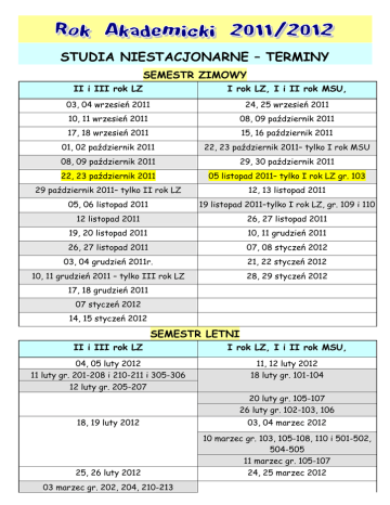 STUDIA NIESTACJONARNE – TERMINY SEMESTR ZIMOWY II i III rok LZ I rok LZ, I i II rok MSU, 03, 04 wrzesień 2011 24, 25 wrzesień 2011 10, 11 wrzesień 2011 08, 09 październik 2011 17, 18 wrzesień 2011 15, 16 październik 2011 01, 02 październik 2011 22, 23 październik 2011– tylko I rok MSU 08, 09 październik 2011 29, 30 październik 2011 22, 23 październik 2011 05 listopad 2011– tylko I rok LZ gr. 103 29 październik 2011– tylko II rok LZ 12, 13 listopad 2011 05, 06 listopad 2011 19 listopad 2011–tylko I rok LZ, gr. 109 i 110 12 listopad 2011 26, 27 listopad 2011 19, 20 listopad 2011 10, 11 grudzień 2011 26, 27 listopad 2011 07, 08 styczeń 2012 03, 04 grudzień 2011r. 21, 22 styczeń 2012 10, 11 grudzień 2011 – tylko III rok LZ 28, 29 styczeń 2012 17, 18 grudzień 2011 07 styczeń 2012 14, 15 styczeń 2012 SEMESTR LETNI II i III rok LZ I rok LZ, I i II rok MSU, 04, 05 luty 2012 11 luty gr. 201-208 i 210-211 i 305-306 12 luty gr. 205-207 11, 12 luty 2012 18 luty gr. 101-104 20 luty gr. 105-107 26 luty gr. 102-103, 106 18, 19 luty 2012 03, 04 marzec 2012 25, 26 luty 2012 10 marzec gr. 103, 105-108, 110 i 501-502, 504-505 11 marzec gr. 105-107 24, 25 marzec 2012 03 marzec gr. 202, 204, 210-213 04 marzec gr. 201-204, 208-209 10, 11 marzec 2012 31 marzec, 01 kwiecień 2012 17, 18 marzec 2012 24 marzec gr. 201-204, 206, 208-213 25 marzec gr. 201-205, 207-213 31 marzec gr. 205-207 i 305-306 21, 22 kwiecień 2012 28 kwiecień gr. 107-110 i 503-504 29 kwiecień gr. 109-110 01 kwiecień gr. 201-213 14, 15 kwiecień 2012 21 kwiecień gr. 202-203, 212-213 i 301-304 05, 06 maj 2012 12 maj gr. 504-505 13 maj gr. 501-505 28, 29 kwiecień 2012 05 maj gr. 201-207, 212-213 06 maj gr. 201-211 i 311-312 19, 20 maj 2012 12, 13 maj 2012 19 maj gr. 201-213 20 maj gr. 201-211 02, 03 czerwiec 2012 26, 27 maj 2012 02 czerwiec gr. 201-202, 205-207 210-213 03 czerwiec gr. 201-204, 208-211 09, 10 czerwiec 2012 09 czerwiec gr. 205-207 10 czerwiec gr. 205-209