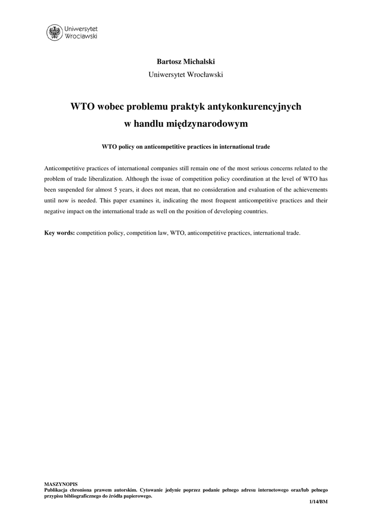 Bartosz Michalski Uniwersytet Wrocławski WTO wobec problemu praktyk antykonkurencyjnych w handlu międzynarodowym WTO policy on anticompetitive practices in international trade Anticompetitive practices of international companies still remain one of the most serious concerns related to the problem of trade liberalization. Although the issue of competition policy coordination at the level of WTO has been suspended for almost 5 years, it does not mean, that no consideration and evaluation of the achievements until now is needed. This paper examines it, indicating the most frequent anticompetitive practices and their negative impact on the international trade as well on the position of developing countries. Key words: competition policy, competition law, WTO, anticompetitive practices, international trade. MASZYNOPIS Publikacja chroniona prawem autorskim. Cytowanie jedynie poprzez podanie pełnego adresu internetowego oraz/lub pełnego przypisu bibliograficznego do źródła papierowego. 1/14/BM Wprowadzenie Globalizacja gospodarki światowej będąca m.in. następstwem dokonanej na forum WTO liberalizacji handlu przyniosła szereg zarówno pozytywnych, jak i negatywnych skutków. Te pierwsze wiąże się zwykle z poprawą perspektyw wzmocnienia tempa wzrostu i rozwoju gospodarczego poprzez aktywne uczestnictwo w międzynarodowej wymianie, czy też zyskania, utrwalenia i wykorzystania posiadanych przewag konkurencyjnych przez przedsiębiorstwa oraz korporacje prowadzące swoją działalność w skali globalnej. Z drugiej strony jednak rosnąca aktywność wielkiego międzynarodowego biznesu wywołuje obawy z perspektywy państw narodowych, a także organizacji międzynarodowych, w zakresie możliwości zachowania wpływu na istotne procesy. Coraz częściej przypomina się o ich nieefektywności w obliczu współczesnych wyzwań. Zdeterminowane jest to faktem, iż proces ewolucji kompetencji tychże instytucji dokonuje się zdecydowanie zbyt wolno (wymaga bowiem skomplikowanego politycznego konsensusu i uzgodnienia wielu interesów) w porównaniu z dynamiką zmian zachodzących na poziomie współczesnych przedsiębiorstw. Istnieje wobec tego uzasadniona obawa, iż ta pogłębiając się asymetria może doprowadzić do nadmiernego wzmocnienia pozycji międzynarodowych koncernów i wykorzystywania jej celem ograniczenia konkurencji. Spowolnienie gospodarki światowej na przełomie lat 2008/2009 wywołane kryzysem finansowym jeszcze silniej utrwala te obawy, bowiem dokonująca się konsolidacja ma w sobie także potencjał negatywnie oddziałujący na intensywność procesu konkurencji rynkowej1. Światowa Organizacja Handlu (WTO) identyfikując w roku 1996 tematy wykraczające poza liberalizację handlu, lecz w związku z nią wymagające podjęcia dyskusji (tzw. kwestie singapurskie), wskazała, iż jednym z takich obszarów jest polityka konkurencji 2 . Wysiłek intelektualny w ramach specjalnie do tego powołanej grupy roboczej (ang. Working Group on 1 W kontekście kryzysu gospodarczego należy wskazać na pewną istotną zmianę, która dokonała się we współczesnych wysoko rozwiniętych gospodarkach. Określenie too big to fail (zbyt duże, by upaść) odnoszące się do korporacji, znalazło niestety swoje potwierdzenie. Rządy wielu krajów będące „zakładnikami” wielkich polityczno-gospodarczych interesów zgodziły się udzielić zagrożonym firmom olbrzymiej pomocy publicznej chroniąc je przed bankructwem, czym podważyły jedną z najistotniejszych zasad gospodarki wolnorynkowej (kapitalistycznej), jaką jest odpowiedzialność za błędne decyzje. Tym samym niektórzy sądzą, że nastała era tzw. postkapitalizmu. Zob. np. J. Makowski, Ustrój doskonale niesprawiedliwy, „Rzeczpospolita” z dn. 30.01.2009. 2 Zob. szerzej B. Michalski, Ewolucja współpracy w dziedzinie polityki konkurencji na forum WTO, [w:] Globalizacja regionalizacji, J. Rymarczyk, B. Drelich-Skulska, W. Michalczyk (red.), Wydawnictwo Akademii Ekonomicznej im. Oskara Langego, Wrocław 2008, s. 550–559 (t. I). MASZYNOPIS Publikacja chroniona prawem autorskim. Cytowanie jedynie poprzez podanie pełnego adresu internetowego oraz/lub pełnego przypisu bibliograficznego do źródła papierowego. 2/14/BM the Interaction between Trade and Competition Policy, WGTCP) został m.in. ukierunkowany na identyfikację praktyk antykonkurencyjnych oraz ustalenie skutecznych działań zapobiegawczych. Generalnie uznano bowiem, że nierozwiązanie tej kwestii mogłoby zaszkodzić utrwaleniu korzyści płynących z samej liberalizacji handlu. Mimo iż z uwagi na impas negocjacyjny prace w zakresie polityki konkurencji w 2004 roku zostały zawieszone3, pozostawiony dorobek nie pozwala przejść wobec problemu obojętnie, tym bardziej, że samo wstrzymanie negocjacji wcale nie oznacza całkowitego zawieszenia dyskusji na temat globalnej polityki konkurencji. Kwestiami tymi zajmuje się jeszcze kilka innych organizacji (OECD, UNCTAD, ICN) i często korzystają one z efektów pracy WTO/WGTCP. Relacje polityka handlowa – polityka konkurencji Politykę handlową oraz politykę konkurencji uznaje się zwykle za dziedziny komplementarne względem siebie. Polega to na tym, iż na gruncie tej pierwszej dąży się współcześnie do obniżania ceł i innych barier w wymianie międzynarodowej, natomiast jednym z celów tej drugiej jest zapewnienie sprawiedliwych i uczciwych reguł konkurencji. Dlatego przejrzystość samego prawa konkurencji uznawana jest za jeden z najważniejszych czynników rozwoju handlu międzynarodowego, natomiast sama polityka konkurencji może (a nawet powinna) służyć jako instrument kształtowania polityki handlowej. Szerokie ujęcie prawa konkurencji obejmuje swoim zakresem działania skierowane zarówno przeciwko antykonkurencyjnym praktykom wykonywanym przez prywatne przedsiębiorstwa, przybierającym postać nielegalnych porozumień, nadmiernej koncentracji rynkowej czy nadużywania pozycji