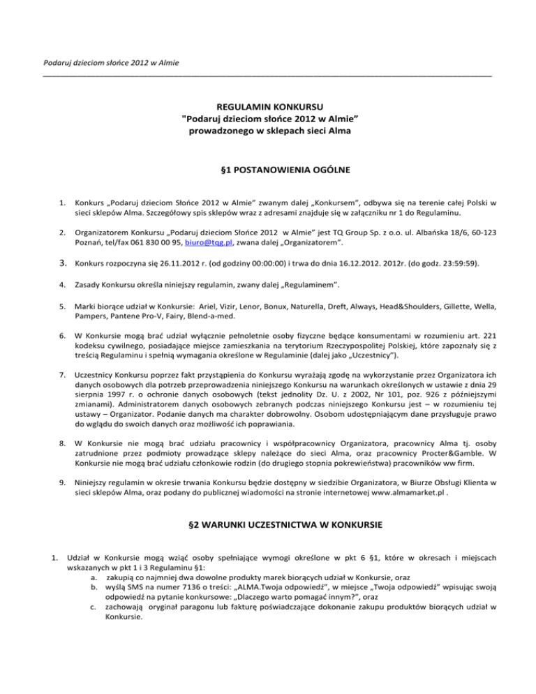 Podaruj dzieciom słońce 2012 w Almie _______________________________________________________________________________________________________ REGULAMIN KONKURSU "Podaruj dzieciom słońce 2012 w Almie” prowadzonego w sklepach sieci Alma §1 POSTANOWIENIA OGÓLNE 1. Konkurs „Podaruj dzieciom Słońce 2012 w Almie” zwanym dalej „Konkursem”, odbywa się na terenie całej Polski w sieci sklepów Alma. Szczegółowy spis sklepów wraz z adresami znajduje się w załączniku nr 1 do Regulaminu. 2. Organizatorem Konkursu „Podaruj dzieciom Słońce 2012 w Almie” jest TQ Group Sp. z o.o. ul. Albańska 18/6, 60-123 Poznań, tel/fax 061 830 00 95, [email protected], zwana dalej „Organizatorem”. 3. Konkurs rozpoczyna się 26.11.2012 r. (od godziny 00:00:00) i trwa do dnia 16.12.2012. 2012r. (do godz. 23:59:59). 4. Zasady Konkursu określa niniejszy regulamin, zwany dalej „Regulaminem”. 5. Marki biorące udział w Konkursie: Ariel, Vizir, Lenor, Bonux, Naturella, Dreft, Always, Head&Shoulders, Gillette, Wella, Pampers, Pantene Pro-V, Fairy, Blend-a-med. 6. W Konkursie mogą brać udział wyłącznie pełnoletnie osoby fizyczne będące konsumentami w rozumieniu art. 221 kodeksu cywilnego, posiadające miejsce zamieszkania na terytorium Rzeczypospolitej Polskiej, które zapoznały się z treścią Regulaminu i spełnią wymagania określone w Regulaminie (dalej jako „Uczestnicy”). 7. Uczestnicy Konkursu poprzez fakt przystąpienia do Konkursu wyrażają zgodę na wykorzystanie przez Organizatora ich danych osobowych dla potrzeb przeprowadzenia niniejszego Konkursu na warunkach określonych w ustawie z dnia 29 sierpnia 1997 r. o ochronie danych osobowych (tekst jednolity Dz. U. z 2002, Nr 101, poz. 926 z późniejszymi zmianami). Administratorem danych osobowych zebranych podczas niniejszego Konkursu jest – w rozumieniu tej ustawy – Organizator. Podanie danych ma charakter dobrowolny. Osobom udostępniającym dane przysługuje prawo do wglądu do swoich danych oraz możliwość ich poprawiania. 8. W Konkursie nie mogą brać udziału pracownicy i współpracownicy Organizatora, pracownicy Alma tj. osoby zatrudnione przez podmioty prowadzące sklepy należące do sieci Alma, oraz pracownicy Procter&Gamble. W Konkursie nie mogą brać udziału członkowie rodzin (do drugiego stopnia pokrewieństwa) pracowników ww firm. 9. Niniejszy regulamin w okresie trwania Konkursu będzie dostępny w siedzibie Organizatora, w Biurze Obsługi Klienta w sieci sklepów Alma, oraz podany do publicznej wiadomości na stronie internetowej www.almamarket.pl . §2 WARUNKI UCZESTNICTWA W KONKURSIE 1. Udział w Konkursie mogą wziąć osoby spełniające wymogi określone w pkt 6 §1, które w okresach i miejscach wskazanych w pkt 1 i 3 Regulaminu §1: a. zakupią co najmniej dwa dowolne produkty marek biorących udział w Konkursie, oraz b. wyślą SMS na numer 7136 o treści: „ALMA.Twoja odpowiedź”, w miejsce „Twoja odpowiedź” wpisując swoją odpowiedź na pytanie konkursowe: „Dlaczego warto pomagać innym?”, oraz c. zachowają oryginał paragonu lub fakturę poświadczające dokonanie zakupu produktów biorących udział w Konkursie. Podaruj dzieciom słońce 2012 w Almie _______________________________________________________________________________________________________ 2. Koszt przesłania SMS-a (do 160 znaków) wynosi 1,23 zł brutto. Opłata w wysokości 1,23 zł brutto zostanie pobrana niezależnie od tego, czy zgłoszenie udziału w Konkursie będzie spełniać warunki określone w pkt. 1b niniejszego paragrafu. 3. Odebranie zgłoszenia hasła konkursowego zostanie potwierdzone SMS-em zwrotnym na numer telefonu, z którego zostało wysłane zgłoszenie. 4. Uczestnik Konkursu może wziąć tyle razy udział w Konkursie, ile razy spełni warunki niniejszego regulaminu. Każdemu uczestnikowi przysługuje jednorazowe prawo do wygrania nagrody, pod warunkiem spełnienia kryteriów otrzymania Nagrody, niezależnie od ilości zgłoszeń w Konkursie. 5. Organizator nie ponosi odpowiedzialności za prawidłowość działania operatorów prowadzących lub obsługujących sieć telefonii komórkowej w tym w szczególności za dostępność lub przepustowość takich sieci, czytelność lub poprawność uzyskiwanych za ich pomocą wiadomości SMS, a także inne kwestie techniczne mogące mieć wpływ na prawidłowe dostarczanie wiadomości. 6. Wysyłając wiadomość SMS uczestnicy akcji wyrażają zgodę na wykorzystywanie ich danych osobowych jedynie w zakresie niezbędnym do realizacji niniejszego konkursu. §3 NAGRODY I ZASADY ICH PRZYZNAWANIA 1. 2. Nagrodami w Konkursie są: 80 rodzinnych gier planszowych „Osadnicy z Catanu” o wartości rynkowej ok. 119,90 zł brutto każda. Łączna wartość nagród wynosi 9.592,00 zł brutto. Kryterium otrzymania nagrody jest: a. spełnienie warunków pkt. 1 §2 Regulaminu, oraz b. wybranie przez komisję wyznaczoną przez Organizatora treści SMS jako ciekawej, oryginalnej i nietuzinkowej. Zostanie wyłonionych 80 Laureatów Konkursu. Laureatem zostanie osoba, która zdaniem Komisji, udzieliła najciekawszej i najbardziej oryginalnej odpowiedzi, c. pisemne pokwitowanie odbioru nagrody na Protokole Odbioru Nagrody oraz jego czytelne i pełne wypełnienie. 3. Decyzja Komisji Konkursowej powołanej przez Organizatora w zakresie wyboru zadań konkursowych jest ostateczna i wiążąca. Komisja zastrzega sobie prawo do wyboru mniejszej/lub żadnej ilości zgłoszeń, w sytuacji, gdy zadania konkursowe zdaniem Komisji, nie będą na wystarczającym poziomie by zakwalifikować je do przyznania nagrody. 4. Weryfikacja prawa do nagrody będzie prowadzona w następujący sposób: a) W ciągu 10 dni od daty posiedzenia Komisji, zwycięzcy otrzymają w imieniu Organizatora telefon lub SMS na numer, z którego dokonali zgłoszenia udziału w Konkursie. b) Uczestnik w rozmowie telefonicznej lub SMS-sie zostanie powiadomiony o wyniku Konkursu i popro