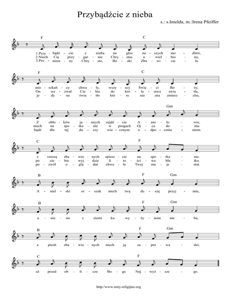 Przybądźcie z nieba s.: s.Imelda, m.:Irena Pfeiffer C F 1.Przy 2.Niech 3.Pro bądź Cię mien cie przy ny z gar Chry nieba nie ste, na Chry Bo głos stus ski na u Zba C F mie On je Z niech bądź szkań we dy obło na dla cy zwał ne ków spo tej chwa Cie świa ja tka du ły, bie tło snych nie szy wszy do któ rzeszą cie zwól zba bie o wio wyj glą nych dzie dać spiesz li chwa B A niel ski or szak niech B u nie sie z ziemi ku B a pieśń zba wio nych niech C aż przed ob li cze scy kró re zejdź cie w progach wie cznym C z po po szych wiel wi Bo Świę le nie A Oj o mo bio cie ci stwa zna Bo świa zmierz dlitw, ny, lu ży, tła, chu, Gm nio ca dpo ło do cznie wie, mu niem. F cie to ły na ści Twej spo wa ma tka Ma je F nie. tka. stat. Gm twą du szę przyj Gm F wy ży nom za nie ba, Gm F ją mie, pro wa dzi, wyż sze go. F ga Naj http:/www.nuty.religijne.org
