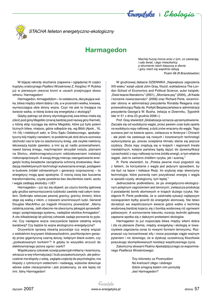STACHA felieton energetyczno-ekologiczny Harmagedon Niechaj huczą morza wraz z tym, co zawierają, i cały świat, i jego mieszkańcy, a strumienie niech klaszczą w dłonie i góry niech się wspólnie radują Psalm 98 (R.Brandstaetter) W bijącej rekordy słuchania (zapewne i oglądania) III części tryptyku oratoryjnego Psałterz Wrześniowy Z. Książka i P. Rubika już w pierwszym utworze brzmi w uszach przejmujące słowo refrenu: Harmagedon! Harmagedon, Armaged(d)on – to ostateczna, decydująca walka, bitwa między siłami dobra i zła, a w przenośni wielka, krwawa, wyniszczająca obie strony wojna. Czyż nie jest to trwająca na świecie walka, w której ściera się energetyka z ekologią? Gdyby patrząc od strony etymologicznej owa bitwa miała się ziścić pod górą Megiddo (znaną bardziej pod nazwą góry Karmel), u której stóp rozciąga się dolina Megiddo, które już było polem licznych bitew, miejsce, gdzie odbędzie się, wg Biblii (Apok., 16, 14–16) i niektórych sekt, w Dniu Sądu Ostatecznego, apokaliptyczny bój między narodami, to podobnie jak dziś dziura ozonowa obchodzi nas to tyle co zeszłoroczny śnieg. Jak zwykle niektórzy lekceważą każde zjawisko, a inni są aż nadto przewrażliwieni, nawet barwą śniegu, machnięciem skrzydeł motyla, plamami na Słońcu, elektromagnetycznymi oddziaływaniami instalacji niskonapięciowych. A swoją drogą mierząc zaangażowanie energetyki liczbą świadectw zarządzania ochroną środowiska, likwidacją nieefektywnych technologii wytwarzania energii, postępem w budowie źródeł odnawialnych i generacji rozproszonej – to energetycy mogą spać spokojnie. O nocną ciszę bez buczenia transformatorów, czyste powietrze bez dwutlenków siarki, azotu i węgla zadbają ekolodzy i UE!! Harmagedon – już raz się objawił, po użyciu bomby jądrowej gdy groźba samozniszczenia ludzkości zawisła nad całym światem. Dotknięto wówczas pewnej granicy, granicy śmierci, która staje się walką z nikim, z rzeszami anonimowych ludzi. Generał Douglas MacArthur po tragedii Hiroszimy powiedział: „Mamy ostatnią szansę. Jeśli obecnie nie stworzymy jakiegoś sprawiedliwego i potężniejszego systemu, nadejdzie wkrótce Armagedon”. A oto kilkadziesiąt lat później człowiek zadaje ponownie to pytanie: Czy następna wojna rzeczywiście będzie ostatnią wojną światową? Czy będzie to wojna ekologiczno-energetyczna? Oczywiście sprawą otwartą pozostaje czy wojnę wiązać z wieloletnim kryzysem bliskowschodnim, pochłonięciem gwiazdy przez gigantyczną czarną dziurę, kolejnym black-outem, czy „podwatowanym korkiem”? A gdyby to wszystko wrzucić do elektrownianego jeziora ognia i siarki? Współczesny człowiek rozwija potencjał militarny i kosmiczny, wkracza w erę informatyzacji i liczb pozaskończonych, ale jednocześnie ma kłopoty z sobą, zagląda częściej do psychologów, ma kłopoty z rytmicznym oddechem i nadwagą, wyborów dokonuje wbrew sobie nieracjonalnie i jest przekonany, że wie lepiej niż inni. Istny Harmagedon! styczeń 2007 W grudniowej debacie DZIENNIKA „Największe zagrożenia XXI wieku” wzięli udział John Gray, filozof, wykładowca The London School of Economics and Political Science, autor książek: „Dwie twarze liberalizmu” (2001), „Słomiane psy” (2004), „Al Kaida i korzenie nowoczesności” (2006) oraz Richard Perle, wiceminister obrony w administracji prezydenta Ronalda Reagana oraz przewodniczący Rady ds. Polityki Bezpieczeństwa w administracji prezydenta George’a W. Busha. (relacja w Dzienniku, Tygodnik Idei nr 51 z dnia 23 grudnia 2006 r.) Prof. Gray stwierdził „Globalizacja oznacza uprzemysłowienie. Zaczęła się od wydobycia węgla, przez pewien czas była oparta na wydobyciu ropy naftowej, a dziś znów wracamy do węgla. Tego surowca jest na świecie sporo, zwłaszcza w Ameryce i Chinach - ale jeżeli nie zastosuje się nowych i kosztownych technologii wykorzystania go, proces ocieplania klimatu stanie się jeszcze szybszy. Złoża ropy znajdują się w krajach i regionach trwale niestabilnych, kolejne państwa będą dążyć do dywersyfikacji i przechodzić z ropy naftowej na inne źródła energii, w tym właśnie węgiel. Jest to zarówno źródłem ryzyka, jak i szansą.” R. Perle stwierdził, że „Polska pewnie musi pogodzić się z faktem, że korzystanie z węgla jest jedynym sposobem, by nie być na łasce i niełasce Rosji. Im szybciej więc stworzymy technologie, które pozwolą nam pozyskiwać energię z węgla w sposób czysty, ekologiczny, tym lepiej.” Jednocześnie podkreślano, że po energetyczno-ekologicznym potężnym zagrożeniem jest terroryzm, zwłaszcza produkcja (i posiadanie) bomb atomowych w krajach dużego ryzyka. Następnie R. Perle podkreśla, że w zaistniałej sytuacji najlepszym rozwiązaniem byłby powrót do energetyki atomowej. Nie łatwo doradzać we współczesnym świecie gdzie walka o technikę wodorową bardziej kojarzy się z bombą wodorową niż ogniwami paliwowymi. A wzmocnienie kierunku rozwoju techniki jądrowej zapewne spotka się z dalszymi protestami ekologów. Harmagedon to już rozpoczęta bitwa między siłami dobra i zła na planecie Ziemia, między energetyką i ekologią w towarzystwie zagrożenia coraz to nowymi formami terroryzmu. Rozpraszać czy koncentrować siły i moce pozostaje ciągle ważnym pytaniem i nic dziwnego, że w dyskusji uczestniczą filozofowie poszukując skomplikowanych korelacji współczesnego życia. Zakończmy słowami Psalmu Apokaliptycznego ze wspomnianego Psałterza Wrześniowego: www.e-energetyka.pl Trzy kilometry za Przemyślem Na krańcach złego i dobrego Gdzie smagną batem nim pomyślą Jest Harmagedon? strona 57