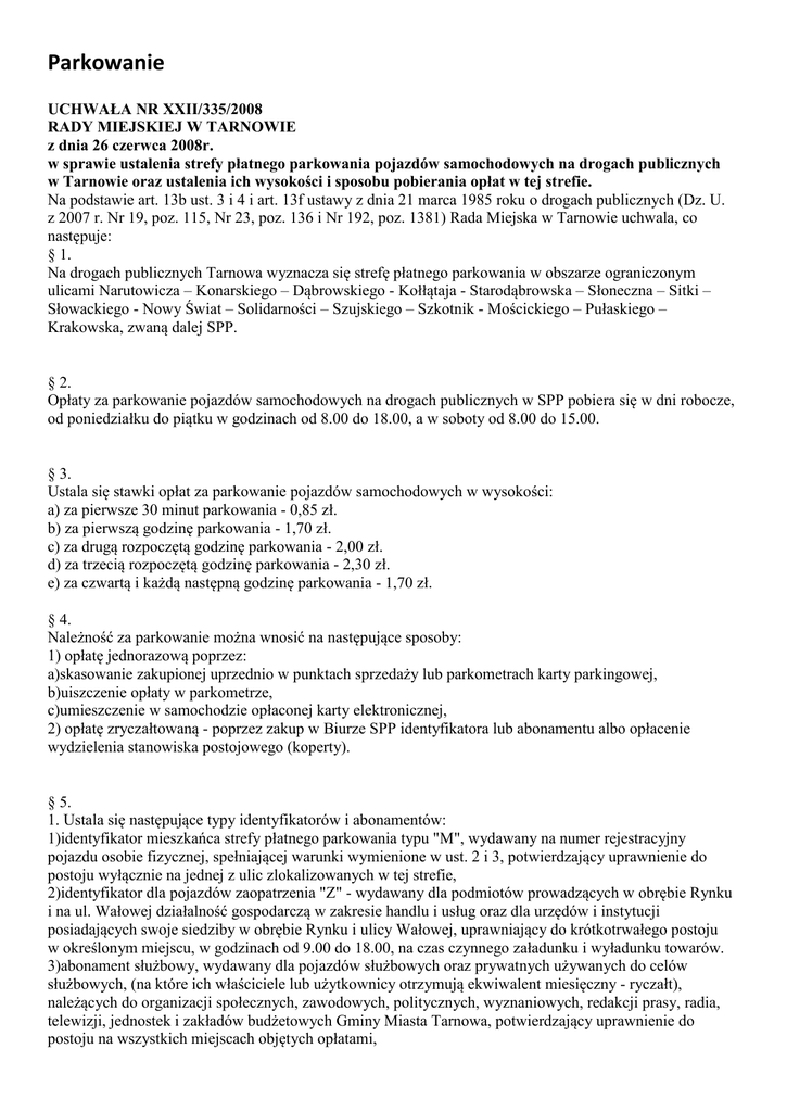 Parkowanie UCHWAŁA NR XXII/335/2008 RADY MIEJSKIEJ W TARNOWIE z dnia 26 czerwca 2008r. w sprawie ustalenia strefy płatnego parkowania pojazdów samochodowych na drogach publicznych w Tarnowie oraz ustalenia ich wysokości i sposobu pobierania opłat w tej strefie. Na podstawie art. 13b ust. 3 i 4 i art. 13f ustawy z dnia 21 marca 1985 roku o drogach publicznych (Dz. U. z 2007 r. Nr 19, poz. 115, Nr 23, poz. 136 i Nr 192, poz. 1381) Rada Miejska w Tarnowie uchwala, co następuje: § 1. Na drogach publicznych Tarnowa wyznacza się strefę płatnego parkowania w obszarze ograniczonym ulicami Narutowicza – Konarskiego – Dąbrowskiego - Kołłątaja - Starodąbrowska – Słoneczna – Sitki – Słowackiego - Nowy Świat – Solidarności – Szujskiego – Szkotnik - Mościckiego – Pułaskiego – Krakowska, zwaną dalej SPP. § 2. Opłaty za parkowanie pojazdów samochodowych na drogach publicznych w SPP pobiera się w dni robocze, od poniedziałku do piątku w godzinach od 8.00 do 18.00, a w soboty od 8.00 do 15.00. § 3. Ustala się stawki opłat za parkowanie pojazdów samochodowych w wysokości: a) za pierwsze 30 minut parkowania - 0,85 zł. b) za pierwszą godzinę parkowania - 1,70 zł. c) za drugą rozpoczętą godzinę parkowania - 2,00 zł. d) za trzecią rozpoczętą godzinę parkowania - 2,30 zł. e) za czwartą i każdą następną godzinę parkowania - 1,70 zł. § 4. Należność za parkowanie można wnosić na następujące sposoby: 1) opłatę jednorazową poprzez: a)skasowanie zakupionej uprzednio w punktach sprzedaży lub parkometrach karty parkingowej, b)uiszczenie opłaty w parkometrze, c)umieszczenie w samochodzie opłaconej karty elektronicznej, 2) opłatę zryczałtowaną - poprzez zakup w Biurze SPP identyfikatora lub abonamentu albo opłacenie wydzielenia stanowiska postojowego (koperty). § 5. 1. Ustala się następujące typy identyfikatorów i abonamentów: 1)identyfikator mieszkańca strefy płatnego parkowania typu "M", wydawany na numer rejestracyjny pojazdu osobie fizycznej, spełniającej warunki wymienione w ust. 2 i 3, potwierdzający uprawnienie do postoju wyłącznie na jednej z ulic zlokalizowanych w tej strefie, 2)identyfikator dla pojazdów zaopatrzenia "Z" - wydawany dla podmiotów prowadzących w obrębie Rynku i na ul. Wałowej działalność gospodarczą w zakresie handlu i usług oraz dla urzędów i instytucji posiadających swoje siedziby w obrębie Rynku i ulicy Wałowej, uprawniający do krótkotrwałego postoju w określonym miejscu, w godzinach od 9.00 do 18.00, na czas czynnego załadunku i wyładunku towarów. 3)abonament służbowy, wydawany dla pojazdów służbowych oraz prywatnych używanych do celów służbowych, (na które ich właściciele lub użytkownicy otrzymują ekwiwalent miesięczny - ryczałt), należących do organizacji społecznych, zawodowych, politycznych, wyznaniowych, redakcji prasy, radia, telewizji, jednostek i zakładów budżetowych Gminy Miasta Tarnowa, potwierdzający uprawnienie do postoju na wszystkich miejscach objętych opłatami, 4)abonament dla pracownika, wydawany dla pracowników biur, urzędów, instytucji, przedsiębiorstw i podmiotów gospodarczych zlokalizowanych w obrębie SPP - właścicieli pojazdów samochodowych, potwierdzający uprawnienie do postoju na jednym z miejsc wyznaczonych do postoju, 2. Za właścicieli pojazdów określonych w ust. 1 pkt 1 i 2 uważa się osoby fizyczne zameldowane na pobyt stały albo czasowy - w przypadku stałego zameldowania poza granicami administracyjnymi miasta Tarnowa, zamieszkałe w budynkach bezpośrednio przyległych do miejsc objętych opłatami. W wyjątkowych przypadkach, dokumentem poświadczającym zamieszkanie może być umowa najmu lokalu mieszkalnego i oświadczenie stron umowy. 3. Prawo nabycia identyfikatora lub abonamentu zwalniającego z wnoszenia opłat jednorazowych, przysługuje osobom, o których mowa w ust. 1 pkt 1 i 2, posiadającym pojazdy z tytułu: 1)własności, 2)prawa strony korzystającej z pojazdu na podstawie umowy leasingu, 3)prawa wynikającego z zawartej przez te osoby umowy kredytu na zakup samochodu. § 6. 1. Ustala się następujące karty parkingowe: 1)półgodzinne, o nominale 0,85 zł. upoważniające do parkowania przez 30 minut, 2)godzinne, o nominale 1,70 zł. upoważniające do parkowania przez pierwszą godzinę, 3)dwugodzinne, o nominale 3,70 zł. upoważniające do parkowania przez dwie pierwsze godziny, 4)trzygodzinne, o nominale 6 zł. upoważniające do parkowania przez trzy pierwsze godziny, 5)dzienne o nominale 12 zł. upoważniające do parkowania przez jeden dzień na wszystkich parkingach w SPP. 2.Czwartą i każdą następną godzinę parkowania w SPP można rozpocząć pozostawiając w samochodzie skasowaną kartę parkingową trzygodzinną lub oraz karty jednogodzinne w ilości odpowiadającej czasowi planowanego postoju. 3.Do opłacenia pierwszej, czwartej i następnych godzin parkowania mogą służyć bilety półgodzinne odpowiednio złożone. § 7. Opłaty za poszczególne abonamenty i identyfikatory wynoszą: 1) za roczny abonament służbowy typu „S” 500,00 zł 2) za roczny identyfikator typu „M” 12,00 zł 3) za abonament miesięczny 200,00 zł 4) za abonament półroczny 1.000,00 zł 5) za abonament roczny 2.000,00 zł 6) za miesięczny abonament pracownika 50,00 zł 7) za półroczny abonament pracownika 250,00 zł 8) za roczny abonament pracownika 500,00 zł 9) za miesięczny identyfikator dla pojazdów zaopatrzenia „Z” 200,00 zł 10) za półroczny identyfikator dla pojazdów zaopatrzenia „Z” 1.000,00 zł 11) za roczny identyfikator dla pojazdów zaopatrzenia „Z” 2.000,00 zł § 8. Opłata za parkowanie na wydzielonym stanowisku postojowym zastrzeżonym na prawach wyłączności (koperta) w SPP wynosi: 1)ważnym przez 8 godzin dziennie: a. za jeden miesiąc 500,00 zł b. za pół roku 2.500,00 zł c. za rok 5.000,00 zł 2)ważnym przez całą dobę: a. za jeden 