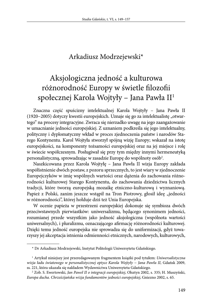 Studia Gdańskie, t. VI, s. 149–157 Arkadiusz Modrzejewski* Aksjologiczna jedność a kulturowa różnorodność Europy w świetle filozofii społecznej Karola Wojtyły – Jana Pawła II Znaczna część spuścizny intelektualnej Karola Wojtyły – Jana Pawła II (1920−2005) dotyczy kwestii europejskich. Uznaje się go za intelektualistę „otwartego” na procesy integracyjne. Zwraca się nierzadko uwagę na jego zaangażowanie w umacnianie jedności europejskiej. Z uznaniem podkreśla się jego intelektualny, polityczny i dyplomatyczny wkład w proces zjednoczenia państw i narodów Starego Kontynentu. Karol Wojtyła stworzył spójną wizję Europy; wskazał na istotę europejskości, na komponenty tożsamości europejskiej oraz na jej miejsce i rolę w świecie współczesnym. Posługiwał się przy tym między innymi hermeneutyką personalistyczną, sprowadzając w zasadzie Europę do wspólnoty osób. Naszkicowana przez Karola Wojtyłę – Jana Pawła II wizja Europy zakłada współistnienie dwóch postaw, z pozoru sprzecznych, to jest wiary w zjednoczenie Europejczyków w imię wspólnych wartości oraz dążenia do zachowania różnorodności kulturowej Starego Kontynentu, do zachowania dziedzictwa licznych tradycji, które tworzą europejską mozaikę etniczno-kulturową i wyznaniową. Papież z Polski, zanim jeszcze wstąpił na Tron Piotrowy, głosił ideę „jedności w różnorodności”, której hołduje dziś też Unia Europejska. W ocenie papieża w przestrzeni europejskiej dokonuje się symbioza dwóch przeciwstawnych pierwiastków: uniwersalizmu, będącego synonimem jedności, rozumianej przede wszystkim jako jedność aksjologiczna (wspólnota wartości uniwersalnych), i pluralizmu, oznaczającego afirmację różnorodności kulturowej. Dzięki temu jedność europejska nie sprowadza się do uniformizacji, gdyż towarzyszy jej akceptacja istnienia odmienności etnicznych, narodowych, kulturowych, * Dr Arkadiusz Modrzejewski, Instytut Politologii Uniwersytetu Gdańskiego. Artykuł niniejszy jest przeredagowanym fragmentem książki pod tytułem: Uniwersalistyczna wizja ładu światowego w personalistycznej optyce Karola Wojtyły − Jana Pawła II, Gdańsk 2009, ss. 221, która ukazała się nakładem Wydawnictwa Uniwersytetu Gdańskiego. Zob. S. Ewertowski, Jan Paweł II o integracji europejskiej, Olsztyn 2002, s. 335; H. Muszyński, Europa ducha. Chrześcijańska wizja fundamentów jedności europejskiej, Gniezno 2002, s. 65. 149 Arkadiusz Modrzejewski wyznaniowych i polityczno-ustrojowych. Funkcjonują one w obszarze wspólnotowości aksjologicznej. „Europa – pisał papież w swojej ostatniej książce – żyła jednością wartości fundamentalnych w wielości kultur narodowych”. W metaforyczny sposób porównał jej dzieje do wielkiej rzeki, „do której wpadają liczne dopływy, a różnorodność tradycji i kultur, które ją kształtują, jest jej wielkim bogactwem”. Na gruncie spekulacji europejskich Jan Paweł II bezpośrednio nawiązywał do spuścizny religijnej Starego Kontynentu. Europę postrzegał jako organicznie związaną z chrześcijaństwem, jako dzieło ewangelizacji ludów i narodów zamieszkujących przestrzeń od Atlantyku po Ural. Dlatego kierując swoje papieskie nauczanie do Europejczyków, mówił wprost o wartościach chrześcijańskich jako o aksjologicznym fundamencie tożsamości europejskiej. Uniwersalizm europejski znaczył dla niego więc tyle, co uniwersalizm europejskiego chrześcijaństwa. Karol Wojtyła postrzegał chrześcijaństwo jako spoiwo łączące różne tradycje kulturowe Europy. Jest ono, by nawiązać do przywołanej powyżej metafory, owym głównym nurtem europejskiej rzeki, do której wpływają liczne dopływy. „Zrąb tożsamości europejskiej – twierdził – jest zbudowany na chrześcijaństwie”. Chrześcijaństwu przypadła zatem ważna rola integrowania wielości. Istnienie wspólnych dla Europejczyków wartości, których źródłem jest tradycja biblijna, szczególnie zaś ewangeliczna, stanowi fundament jedności europejskiej. W 1986 roku, wygłaszając w Mont Chetif apel do mieszkańców Starego Kontynentu, Jan Paweł II stwierdził wprost: „Korzenie jedności Europy tkwią we wspólnym dziedzictwie wartości, którymi żyją poszczególne kultury narodowe. Istotą tego dziedzictwa są prawdy wiary chrześcijańskiej. Spojrzenie na dzieje tworzenia się narodów europejskich pozwala dostrzec, jak decydującą rolę odegrała w życiu każdego narodu postępująca inkulturacja Ewangelii”. Wspólna chrześcijańska wiara oraz wyprowadzane z niej wartości są więc w opinii Karola Wojtyły tym, co łączy wszystkich Europejczyków. Katalog wartości podstawowych obejmuje przede wszystkim: godność osoby ludzkiej, przywiązanie do idei sprawiedliwości i wolności, pracowitość i przedsiębiorczość, miłość rodzinną, szacunek dla życia w każdej postaci, tolerancję, solidarność i pokój. Jan Paweł II, Pamięć i tożsamość, Kraków 2005, s. 97. Jan Paweł II, Homilia wygłoszona podczas mszy świętej z okazji tysiąclecia męczeństwa św. Wojciecha na placu św. Wojciecha w Gnieźnie, 3 czerwca 1997 roku, [w:] idem, Pielgrzymki do Ojczyzny. Przemówienia, homilie, Kraków 2006, s. 911. Ibidem. Zob. J. Życiński, Koncepcja zjednoczonej Europy w nauczaniu Jana Pawła II, [w:] Europa. Fundamenty jedności, pod red. A. Dylus, Warszawa 1998, s. 192. Jan Paweł II, Apel do mieszkańców Europy. Mont Chetif, 6 września 1986, [w:] Przemówienia i homilie Ojca Świętego Jana Pawła II, Kraków 2008, s. 160. Zob. Jan Paweł II, Akt europejski, Santiago de Compostela, 9 listopada 1982, [w:] Przemówienia i homilie…, op. cit., s. 133. 150 Aksjologiczna jedność a kulturowa różnorodność Europy w świetle filozofii społecznej Karola Wojtyły... Z myśli filozoficzno-społecznej papieża-Polaka wyłania się zatem idea jedności europejskiej, która jest rozumiana pr