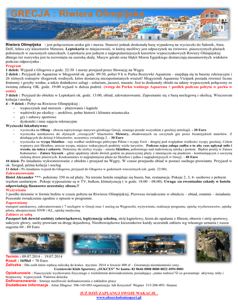 GRECJA : Riwiera Olimpijska Ateny, Meteory, Olimp – wakacje w kraju słońca, bogów i oliwek . Riwiera Olimpijska - jest połączeniem uroku gór i morza. Stanowi jednak doskonałą bazę wypadową na wycieczki do Salonik, Aten, Delf, Athos czy klasztorów Meteora. Leptokaria to miejscowość, w której możliwy jest odpoczynek na żwirowo- piaszczystych plażach położonych w zacisznych zatoczkach. Leptokaria jest jednym z najpopularniejszych kurortów wypoczynkowych Riwiery Olimpijskiej dlatego też rozrywka jest tu rozwinięta na szeroką skalę. Masyw górski oraz błękit Morza Egejskiego dostarczają niesamowitych widoków podczas odpoczynku . Program 1 dzień: Wyjazd z Głogowa o godz. 22:30 i nocny przejazd przez Słowację na Węgry 2 dzień : Przyjazd do Aquarena w Mogyoród ok. godz. 09:30, pobyt 9 h w Parku Rozrywki Aquarena - znajdują się tu baseny rekreacyjne i 26 różnych rodzajów ślizgawek wodnych, które dostarczą niezapomnianych wrażeń! Mogyoródi Aquarena Vízipark posiada również liczne fontanny i grzyby wodne, a także dodatkowe usługi - solarium, jacuzzi, masaże. Jest to doskonały obiekt na udany wypoczynek połączony ze świetną zabawą. OK. godz. 19:00 wyjazd w dalsza podróż. (wstęp do Parku wodnego Aquarena + posiłek podczas pobytu w parku w cenie) 3 dzień : Przyjazd do obiektu w Leptokarii ok. godz. 13:00, obiad, zakwaterowanie. Zapoznanie się z bazą noclegową i okolicą. Wieczorem kolacja i nocleg 4 – 9 dzień : Pobyt na Riwierze Olimpijskiej : wypoczynek nad morzem – plażowanie i kąpiele wędrówki po okolicy – urokliwe, pełne historii i klimatu miasteczka gry i zabawy sportowe dyskoteki i inne zajęcia rekreacyjne Wycieczki fakultatywne: wycieczka na Olimp - zbocza najwyższego masywu górskiego Grecji, znanego przede wszystkim z greckiej mitologii. - 20 Euro wycieczka autokarowa do słynnych „wiszących” klasztorów Meteory, zbudowanych na szczytach gór przez bizantyjskich mnichów. Z działających do dzisiaj 6 klasztorów, uczestnicy zwiedzają 2. - 30 Euro wycieczka na wyspę Skiathos - rejs wzdłuż urokliwego półwyspu Pilion i wyspy Ewii - drugiej pod względem wielkości wyspy greckiej. Celem wyprawy jest Skiathos, urocza wyspa, miejsce wakacyjnych podróży wielu turystów. Podczas rejsu załoga zadba o to aby czas upłynął miło i wesoło, na tańcu i zabawie. Dotrzemy do stolicy wyspy - miasta Skiathos, położonego nad malowniczą zatoką i portem. Będzie postój w Zatoce Kukunaries - Zatoce Szyszek - gdzie spędzimy około dwóch godzin na piaszczystej plaży z mieniącym się piaskiem - kontrastującym z soczystą zielenią drzew piniowych. Koukounaries to najpiękniejsza plaża na Skiathos i jedna z najpiękniejszych w Grecji. - 40 Euro 10 dzień: Po śniadaniu wykwaterowanie z obiektu i przejazd na Węgry. W czasie przejazdu obiad w postaci suchego prowiantu. Przyjazd w ok. Szeged, późna kolacja i nocleg 11 dzień : Po śniadaniu wyjazd do Głogowa, przyjazd do Głogowa w godzinach wieczornych (ok. godz. 22:00). Zakwaterowanie Hotel Alexander ***- położony 350 m od plaży. Na terenie hotelu znajduje się basen, bar, restauracja. Pokoje 2, 3, 4- osobowe z pełnym węzłem sanitarnym . Pokoje wyposażone są w TV, balkon, klimatyzację ( w godz. 18:00 – 08:00). Uwaga :za ewentualne szkody w hotelu odpowiadają finansowo uczestnicy obozu.!! Wyżywienie 3 posiłki dziennie w formie bufetu w czasie pobytu na Riwierze Olimpijskiej. Pierwsze świadczenie w obiekcie – obiad, ostatnie – śniadanie. Pozostałe świadczenia zgodnie z opisem w programie. Zapewniamy transport autokarowy, zakwaterowanie ( 7 noclegów w Grecji oraz 1 nocleg na Węgrzech), wyżywienie, realizacje programu, opiekę wychowawców, opiekę pilota, ubezpieczenie NNW i KL, opiekę medyczną. Zabierz ze sobą Paszport lub dowód osobisty (obowiązkowo), legitymację szkolną, strój kąpielowy, krem do opalania z filtrem, obuwie i strój sportowy, nakrycie głowy, suchy prowiant na drogę dojazdową. Nieobowiązkowe kieszonkowe każdy uczestnik zabiera wg własnego uznania ( nasza sugestia 60 - 80 Euro Termin : 09.07.2014 - 19.07.2014 Koszt : 1650zł + 70 Euro Zaliczka : Dla osób które wpłacą zaliczkę do końca stycznia 2014 w kwocie 400 zł – Gwarancja niezmienności ceny . Uczniowski Klub Sportowy „SUKCES” Nr konta: 82 8646 0008 0000 0022 4594 0001 Opiekunowie : Nauczyciele wychowania fizycznego z wieloletnim doświadczeniem, posiadający „status rodzica” co gwarantuje aktywny, miły i bezpieczny wypoczynek Państwa dziecka. Dofinansowanie : Istnieje możliwość dofinansowania z zakładów pracy Dodatkowe informacje : Artur Długosz 506-145-085-organizacja lub Krzysztof Wegner 515-206-093- finanse JUŻ DZIŚ ZAPLANUJ SWOJE WAKACJE . www.obozykoloniesport.pl
