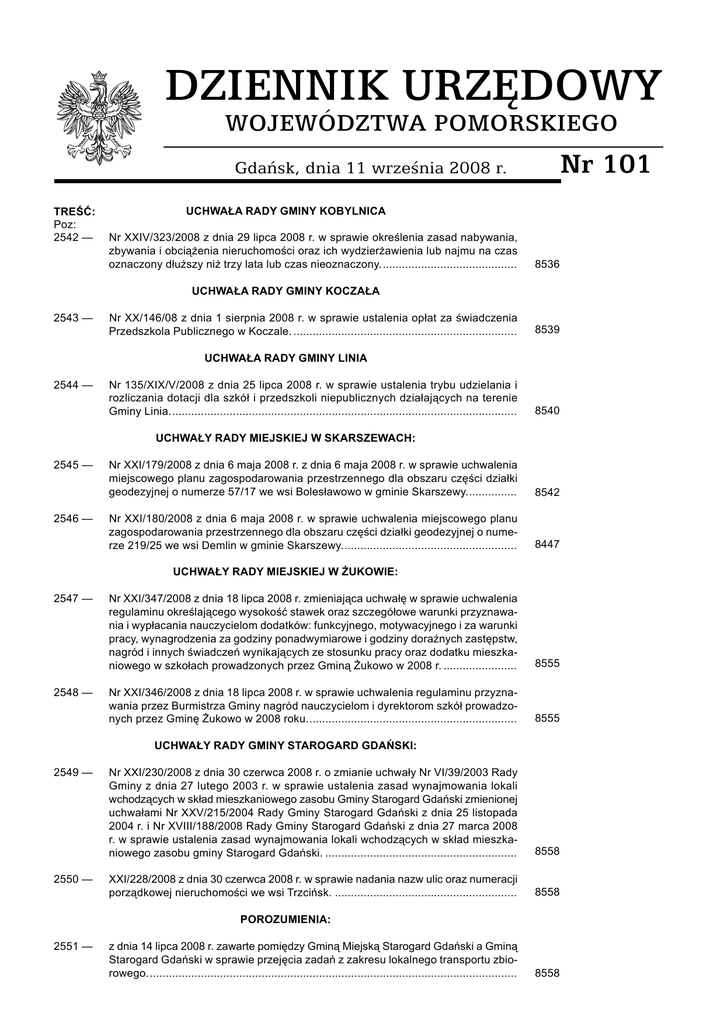 DZIENNIK URZĘDOWY WOJEWÓDZTWA POMORSKIEGO Nr 101 Gdańsk, dnia 11 września 2008 r. TREŚĆ: Poz: 2542 — UCHWAŁA RADY GMINY KOBYLNICA Nr XXIV/323/2008 z dnia 29 lipca 2008 r. w sprawie określenia zasad nabywania, zbywania i obciążenia nieruchomości oraz ich wydzierżawienia lub najmu na czas oznaczony dłuższy niż trzy lata lub czas nieoznaczony........................................... 8536 UCHWAŁA RADY GMINY KOCZAŁA 2543 — Nr XX/146/08 z dnia 1 sierpnia 2008 r. w sprawie ustalenia opłat za świadczenia Przedszkola Publicznego w Koczale. ...................................................................... 8539 UCHWAŁA RADY GMINY LINIA 2544 — Nr 135/XIX/V/2008 z dnia 25 lipca 2008 r. w sprawie ustalenia trybu udzielania i rozliczania dotacji dla szkół i przedszkoli niepublicznych działających na terenie Gminy Linia............................................................................................................. 8540 UCHWAŁY RADY MIEJSKIEJ W SKARSZEWACH: 2545 — 2546 — Nr XXI/179/2008 z dnia 6 maja 2008 r. z dnia 6 maja 2008 r. w sprawie uchwalenia miejscowego planu zagospodarowania przestrzennego dla obszaru części działki geodezyjnej o numerze 57/17 we wsi Bolesławowo w gminie Skarszewy................ 8542 Nr XXI/180/2008 z dnia 6 maja 2008 r. w sprawie uchwalenia miejscowego planu zagospodarowania przestrzennego dla obszaru części działki geodezyjnej o numerze 219/25 we wsi Demlin w gminie Skarszewy....................................................... 8447 UCHWAŁY RADY MIEJSKIEJ W ŻUKOWIE: 2547 — 2548 — Nr XXI/347/2008 z dnia 18 lipca 2008 r. zmieniająca uchwałę w sprawie uchwalenia regulaminu określającego wysokość stawek oraz szczegółowe warunki przyznawania i wypłacania nauczycielom dodatków: funkcyjnego, motywacyjnego i za warunki pracy, wynagrodzenia za godziny ponadwymiarowe i godziny doraźnych zastępstw, nagród i innych świadczeń wynikających ze stosunku pracy oraz dodatku mieszkaniowego w szkołach prowadzonych przez Gminą Żukowo w 2008 r. ....................... 8555 Nr XXI/346/2008 z dnia 18 lipca 2008 r. w sprawie uchwalenia regulaminu przyznawania przez Burmistrza Gminy nagród nauczycielom i dyrektorom szkół prowadzonych przez Gminę Żukowo w 2008 roku.................................................................. 8555 UCHWAŁY RADY GMINY STAROGARD GDAŃSKI: 2549 — 2550 — Nr XXI/230/2008 z dnia 30 czerwca 2008 r. o zmianie uchwały Nr VI/39/2003 Rady Gminy z dnia 27 lutego 2003 r. w sprawie ustalenia zasad wynajmowania lokali wchodzących w skład mieszkaniowego zasobu Gminy Starogard Gdański zmienionej uchwałami Nr XXV/215/2004 Rady Gminy Starogard Gdański z dnia 25 listopada 2004 r. i Nr XVIII/188/2008 Rady Gminy Starogard Gdański z dnia 27 marca 2008 r. w sprawie ustalenia zasad wynajmowania lokali wchodzących w skład mieszkaniowego zasobu gminy Starogard Gdański. ............................................................ 8558 XXI/228/2008 z dnia 30 czerwca 2008 r. w sprawie nadania nazw ulic oraz numeracji porządkowej nieruchomości we wsi Trzcińsk. ......................................................... 8558 POROZUMIENIA: 2551 — z dnia 14 lipca 2008 r. zawarte pomiędzy Gminą Miejską Starogard Gdański a Gminą Starogard Gdański w sprawie przejęcia zadań z zakresu lokalnego transportu zbiorowego.................................................................................................................... 8558 Dziennik Urzędowy Województwa Pomorskiego Nr 101 2552 — 2553 — Poz. 2542 — 8536 — Zawarte w dniu 11 lipca 2008 r. pomiędzy Miastem Gdańsk a Miastem Pruszcz Gdański w sprawie zwrotu przez Miasto Pruszcz Gdański kosztów przewozy dzieci zamieszkałych w Mieście Pruszcz Gdańska do Zespołu Szkół Ogólnokształcących Nr 6 w Gdyni. ........................................................................................................ 8559 Porozumienie Pomiędzy Miastem Gdańsk a Gminą Kolbudy zawarte w dniu 7 lipca 2008 r. w sprawie zwrotu przez Gminę Kolbudy poniesionych przez Miasto Gdańsk kosztów przewozu dzieci zamieszkałych w Gminie Kolbudy do Zespołu Szkół Ogólnokształcących Nr 6 w Gdyni ............................................................... 8560 PROTOKÓŁ USTALENIA WYNIKU REFERENDUM GMINNEGO: 2554 — Zarządzonego na dzień 27 lipca 2008 r. w sprawie likwidacji straży miejskiej w Czersku. ............................................................................................................... 8561 ZARZĄDZENIE WOJEWODY POMORSKIEGO 2555 — Nr 170/08 z dnia 8 września 2008 r. w sprawie wyborów uzupełniających do Rady Gminy Malbork w okręgu wyborczym Nr 7 ............................................................ 8562 2542 UCHWAŁA Nr XXIV/323/2008 Rady Gminy Kobylnica z dnia 29 lipca 2008 r. w sprawie określenia zasad nabywania, zbywania i obciążania nieruchomości oraz ich wydzierżawiania lub najmu na czas oznaczony dłuższy niż trzy lata lub czas nieoznaczony. Na podstawie art. 18 ust. 2 pkt 9 lit. „a”, art. 18 ust. 2 pkt 15 ustawy z dnia 8 marca 1990 r. o samorządzie gminnym (Dz. U. z 2001 r. Nr 142, poz. 1591; z 2002 r. ze zm. oraz art. 11, art. 13 ust. 1, art. 14 ust. 5, art. 34 ust. 6, art. 37 ust. 3 i ust. 4, art. 68 ust. 1 i ust. 3, art. 70 ust. 4, art. 73 ust. 3 i 4, art. 76 ust. 1, art. 84 ust. 3 i 4 ustawy z dnia 21 sierpnia 1997 r. o gospodarce nieruchomościami (Dz. U. z 2004 r. Nr 261, poz. 2603 ze zm.Rada Gminy Kobylnica uchwala, co następuje: Rozdział I Zasady ogólne §1 1. Uchwała określa zasady nabywania, zbywania i obciążania nieruchomości oraz ich wydzierżawiania lub najmu na czas oznaczony dłuższy niż trzy lata lub czas nieoznaczony. 2. Ilekroć w uchwale jest mowa o: 1) Gminie – rozumie się przez to Gminę Kobylnica, 2) Wójcie- rozumie się przez to Wójta Gminy Kobylnica, 3) Radzie Gminy- rozumie się przez to Radę Gminy Kobylnica, 4) ustawie- rozu