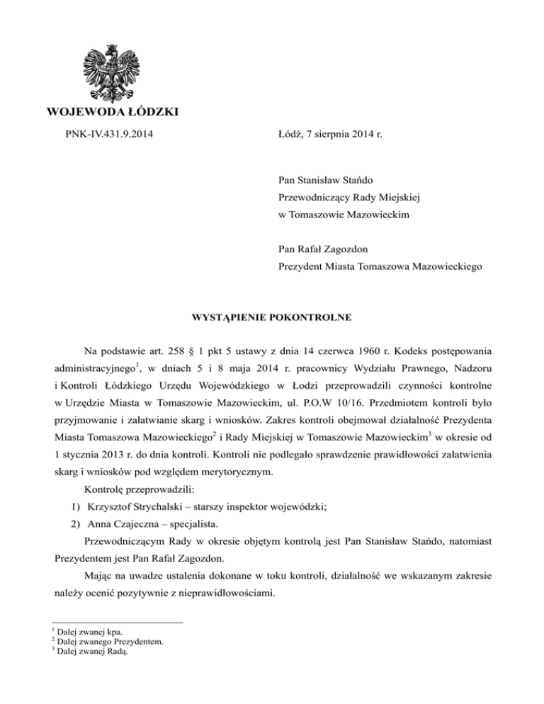WOJEWODA ŁÓDZKI PNK-IV.431.9.2014 Łódź, 7 sierpnia 2014 r. Pan Stanisław Stańdo Przewodniczący Rady Miejskiej w Tomaszowie Mazowieckim Pan Rafał Zagozdon Prezydent Miasta Tomaszowa Mazowieckiego WYSTĄPIENIE POKONTROLNE Na podstawie art. 258 § 1 pkt 5 ustawy z dnia 14 czerwca 1960 r. Kodeks postępowania administracyjnego1, w dniach 5 i 8 maja 2014 r. pracownicy Wydziału Prawnego, Nadzoru i Kontroli Łódzkiego Urzędu Wojewódzkiego w Łodzi przeprowadzili czynności kontrolne w Urzędzie Miasta w Tomaszowie Mazowieckim, ul. P.O.W 10/16. Przedmiotem kontroli było przyjmowanie i załatwianie skarg i wniosków. Zakres kontroli obejmował działalność Prezydenta Miasta Tomaszowa Mazowieckiego2 i Rady Miejskiej w Tomaszowie Mazowieckim3 w okresie od 1 stycznia 2013 r. do dnia kontroli. Kontroli nie podlegało sprawdzenie prawidłowości załatwienia skarg i wniosków pod względem merytorycznym. Kontrolę przeprowadzili: 1) Krzysztof Strychalski – starszy inspektor wojewódzki; 2) Anna Czajeczna – specjalista. Przewodniczącym Rady w okresie objętym kontrolą jest Pan Stanisław Stańdo, natomiast Prezydentem jest Pan Rafał Zagozdon. Mając na uwadze ustalenia dokonane w toku kontroli, działalność we wskazanym zakresie należy ocenić pozytywnie z nieprawidłowościami. 1 Dalej zwanej kpa. Dalej zwanego Prezydentem. 3 Dalej zwanej Radą. 2 Organizacja w zakresie skarg i wniosków 1. Organy Miasta Tomaszowa Mazowieckiego są organizacyjnie przygotowane do przyjmowania i rozpatrywania skarg i wniosków, nie wszystkie jednak kwestie objęte kontrolą zostały w sposób prawidłowy i kompletny unormowane w Regulaminie Organizacyjnym Urzędu Miasta w Tomaszowie Mazowieckim4. Rozdział IV Regulaminu Organizacyjnego dotyczy organizacji przyjmowania, rozpatrywania i załatwiania skarg i wniosków obywateli. Zgodnie z Regulaminem Organizacyjnym Prezydent i Zastępcy Prezydenta przyjmują klientów w sprawach skarg i wniosków w każdy drugi i czwarty czwartek miesiąca w godzinach od 8:00 do 12:00. Powyższy zapis nie wypełnia wymogów wynikających z art. 253 § 2 i 3 kpa, który stanowi, iż kierownicy organów wymienionych w § 1 lub wyznaczeni przez nich zastępcy obowiązani są przyjmować obywateli w sprawach skarg i wniosków co najmniej raz w tygodniu. Dni i godziny przyjęć powinny być dostosowane do potrzeb ludności, przy czym przynajmniej raz w tygodniu przyjęcia powinny się odbywać w ustalonym dniu po godzinach pracy. W toku przeprowadzonych w Urzędzie Miasta w Tomaszowie Mazowieckim oględzin stwierdzono wywieszenie w widocznym miejscu informacji o dniach i godzinach przyjęć. Wśród ww. informacji znajdowała się również taka, której treść nie ma odzwierciedlenia w Regulaminie Organizacyjnym: „Prezydent Miasta Tomaszowa Mazowieckiego lub jego Zastępcy oraz Sekretarz Miasta przyjmują mieszkańców w sprawach skarg i wniosków w każdą środę w godz. 15.30 – 16.00”. Zgodnie z Regulaminem Organizacyjnym kontrolę i koordynację działania komórek organizacyjnych Urzędu w zakresie załatwiania indywidualnych spraw klientów, w tym skarg, wniosków i listów oraz interwencji, sprawuje Kancelaria Prezydenta Miasta. W toku dokonanych oględzin stwierdzono wywieszenie następującej informacji: „Jednostką organizacyjną przyjmującą skargi i wnioski jest Wydział Administracji, Obsługi i Majątku Urzędu Miasta w Tomaszowie Mazowieckim.”. Biorąc pod uwagę treść § 3 ust. 1 i 2 rozporządzenia Rady Ministrów z dnia 8 stycznia 2002 r. w sprawie organizacji przyjmowania i rozpatrywania skarg i wniosków stwierdzić należy naruszenia polegające na: − nieprecyzyjnym określeniu w Regulaminie Organizacyjnym komórki organizacyjnej przyjmującej i koordynującej rozpatrywanie skarg i wniosków, − nieumieszczeniu w siedzibie jednostki informacji, iż Wydział Administracji, Obsługi i Majątku koordynuje rozpatrywanie skarg i wniosków. Jak wyjaśnił Sekretarz Miasta Pan Krzysztof Janik zapis w Regulaminie Organizacyjnym 4 Zarządzenie Nr 315/2011 Prezydenta Miasta Tomaszowa Mazowieckiego z dnia 9 grudnia 2011 r. w sprawie Regulaminu Organizacyjnego Urzędu Miasta w Tomaszowie Mazowieckim (ze zm.), zwane dalej Regulaminem Organizacyjnym. 2 dotyczący Kancelarii Prezydenta Miasta został przeniesiony z poprzednio obowiązującego regulaminu i nieuaktualniony – Kancelaria stanowi obecnie część Wydziału Administracji, Obsługi i Majątku. Nadto ustalono, iż w zakresie, w jakim Regulamin Organizacyjny odnosi się do przyjmowania skarg i wniosków przez inne komórki organizacyjne lub pracowników, dotyczy to wyłącznie przyjmowania skarg i wniosków w potocznym rozumieniu, ponieważ poza kierownictwem jednostki, przyjęć skarg i wniosków, o których mowa w dziale VIII kpa dokonują tylko pracownicy Wydziału Administracji, Obsługi i Majątku. Regulamin Organizacyjny winien jednak w sposób precyzyjny, zgodny z prawem i stanem faktycznym regulować kontrolowane zagadnienia. (Akta kontroli str. 18-43, 53-55). 2. Stanowisko Naczelnika Wydziału Administracji, Obsługi i Majątku zajmuje Pan Piotr Zwardoń. W zakresie obowiązków jednego z pracowników ww. Wydziału ujęto m.in. prowadzenie centralnych rejestrów skarg i wniosków, zbieranie materiałów niezbędnych do wyjaśnienia skarg od merytorycznych wydziałów oraz przeprowadzanie okresowej kontroli wewnętrznej dotyczącej prawidłowego rozpatrywania skarg i wniosków. Kontrola taka obejmowała rok 2013. Obsługę Rady Miejskiej sprawuje Biuro Rady Miejskiej, którego kierownikiem jest Pani Bogusława Smejda. W zakresie obowiązków jednego z pracowników ww. Biura wpisano między innymi wykonywanie spraw związanych z pomocą w obsłudze Komisji Rewizyjnej Rady Miejskiej w szczególności sporządzanie projektów uchwał. Skargi rozpatrywane przez Prezydenta 3. Zgodnie z Regulaminem organizacyjnym wszystkie wpływające skargi i wnioski przekazywane są do Wydziału A