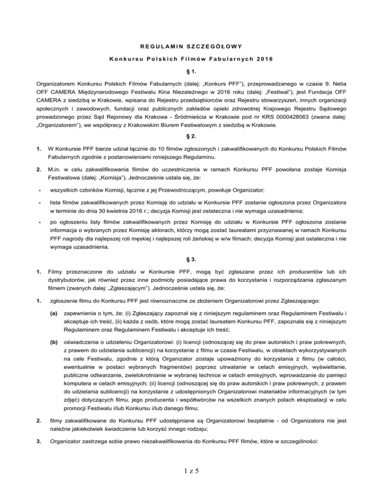 REGULAMIN SZCZEGÓŁOWY K o n k u rs u Po l s k i c h F i l m ó w F a b u l a r n yc h 2 0 1 6 § 1. Organizatorem Konkursu Polskich Filmów Fabularnych (dalej: „Konkurs PFF”), przeprowadzanego w czasie 9. Netia OFF CAMERA Międzynarodowego Festiwalu Kina Niezależnego w 2016 roku (dalej: „Festiwal”), jest Fundacja OFF CAMERA z siedzibą w Krakowie, wpisana do Rejestru przedsiębiorców oraz Rejestru stowarzyszeń, innych organizacji społecznych i zawodowych, fundacji oraz publicznych zakładów opieki zdrowotnej Krajowego Rejestru Sądowego prowadzonego przez Sąd Rejonowy dla Krakowa - Śródmieścia w Krakowie pod nr KRS 0000428063 (zwana dalej: „Organizatorem”), we współpracy z Krakowskim Biurem Festiwalowym z siedzibą w Krakowie. § 2. 1. W Konkursie PFF bierze udział łącznie do 10 filmów zgłoszonych i zakwalifikowanych do Konkursu Polskich Filmów Fabularnych zgodnie z postanowieniami niniejszego Regulaminu. 2. M.in. w celu zakwalifikowania filmów do uczestniczenia w ramach Konkursu PFF powołana zostaje Komisja Festiwalowa (dalej: „Komisja”). Jednocześnie ustala się, że: - wszystkich członków Komisji, łącznie z jej Przewodniczącym, powołuje Organizator; - lista filmów zakwalifikowanych przez Komisję do udziału w Konkursie PFF zostanie ogłoszona przez Organizatora w terminie do dnia 30 kwietnia 2016 r.; decyzja Komisji jest ostateczna i nie wymaga uzasadnienia; - po ogłoszeniu listy filmów zakwalifikowanych przez Komisję do udziału w Konkursie PFF ogłoszona zostanie informacja o wybranych przez Komisję aktorach, którzy mogą zostać laureatami przyznawanej w ramach Konkursu PFF nagrody dla najlepszej roli męskiej i najlepszej roli żeńskiej w w/w filmach; decyzja Komisji jest ostateczna i nie wymaga uzasadnienia. § 3. 1. Filmy przeznaczone do udziału w Konkursie PFF, mogą być zgłaszane przez ich producentów lub ich dystrybutorów, jak również przez inne podmioty posiadające prawa do korzystania i rozporządzania zgłaszanym filmem (zwanych dalej: „Zgłaszającym”). Jednocześnie ustala się, że: 1. zgłoszenie filmu do Konkursu PFF jest równoznaczne ze złożeniem Organizatorowi przez Zgłaszającego: (a) zapewnienia o tym, że: (i) Zgłaszający zapoznał się z niniejszym regulaminem oraz Regulaminem Festiwalu i akceptuje ich treść, (ii) każda z osób, które mogą zostać laureatem Konkursu PFF, zapoznała się z niniejszym Regulaminem oraz Regulaminem Festiwalu i akceptuje ich treść; (b) oświadczenia o udzieleniu Organizatorowi: (i) licencji (odnoszącej się do praw autorskich i praw pokrewnych, z prawem do udzielania sublicencji) na korzystanie z filmu w czasie Festiwalu, w obiektach wykorzystywanych na cele Festiwalu, zgodnie z którą Organizator zostaje upoważniony do korzystania z filmu (w całości, ewentualnie w postaci wybranych fragmentów) poprzez utrwalanie w celach emisyjnych, wyświetlanie, publiczne odtwarzanie, zwielokrotnianie w wybranej technice w celach emisyjnych, wprowadzanie do pamięci komputera w celach emisyjnych; (ii) licencji (odnoszącej się do praw autorskich i praw pokrewnych, z prawem do udzielania sublicencji) na korzystanie z udostępnionych Organizatorowi materiałów informacyjnych (w tym zdjęć) dotyczących filmu, jego producenta i współtwórców na wszelkich znanych polach eksploatacji w celu promocji Festiwalu i/lub Konkursu i/lub danego filmu; 2. filmy zakwalifikowane do Konkursu PFF udostępniane są Organizatorowi bezpłatnie - od Organizatora nie jest należne jakiekolwiek świadczenie lub korzyść innego rodzaju; 3. Organizator zastrzega sobie prawo niezakwalifikowania do Konkursu PFF filmów, które w szczególności: 1z5 4. (a) zawierają treści nawołujące do nienawiści rasowej, religijnej lub mogące obrażać uczucia religijne, (b) zawierają treści mogące stwarzać zagrożenie dla życia i zdrowia małoletnich, (c) powstały w wyniku działań mogących narażać na utratę życia lub zdrowia ludzi lub zwierząt, (d) w inny sposób mogą naruszać obowiązujące w Polsce przepisy prawa lub dobre obyczaje; filmy zakwalifikowane do udziału w Konkursie PFF mogą być dostarczone do Organizatora przez Zgłaszającego wyłącznie na jednym z poniższych nośników w formacie PAL: 5. (a) taśmie 35mm, ze ścieżką dźwiękową zapisaną optycznie lub magnetycznie; (b) BetaSP; (c) DigiBeta; (d) DV Cam; (e) HD Cam; (f) DCP; (g) Blu-ray; preferowanymi nośnikami dla filmów będą taśma 35 mm lub HD CAM; w wypadku dostarczenia filmu na innym nośniku niż taśma 35 mm, Organizator ma prawo, bez ponoszenia jakichkolwiek opłat z tego tytułu, dokonać skopiowania przesłanych kopii filmów na dysk komputera w celu przeprowadzenia projekcji Festiwalowych; 6. 2. film zawierający dialogi w języku innym niż angielski powinien mieć listy dialogowe w języku angielskim. Film zgłoszony i zakwalifikowany do projekcji w Konkursie PFF nie może być z niego wycofany przez Zgłaszającego ani inną osobę bez pisemnej (pod rygorem nieważności) zgody Organizatora. 3. Organizator pobiera opłaty zgłoszeniowe – na zasadach określonych w § 4 pkt 2.2 lit. (c) Regulaminu. Opłaty Zgłoszeniowe nie podlegają zwrotowi – w tym w szczególności w wypadku nie zakwalifikowania filmu do projekcji w ramach Festiwalu, albo wycofania filmu z Festiwalu. § 4. 1. Do Konkursu PFF może zostać zgłoszony polski film fabularny lub stanowiący odrębną całość artystyczną, którego czas projekcji wynosi nie mniej niż 60 minut. 2. 1. Zgłoszenie filmu do Konkursu PFF: jest możliwe wyłącznie za pośrednictwem aplikacji internetowej dostępnej w serwisie https://www.filmfreeway.com/ ; 2. jest skuteczne wyłącznie w wypadku, gdy: (a) zostanie dokonane nie później niż do dnia 15 lutego 2016 r.; Organizator zastrzega przy tym, że filmy zgłoszone po dniu 15 lutego 2016 r. mogą (lecz nie muszą) zostać uwzględnione przy tworzeniu listy filmów zakwalifikowanych d
