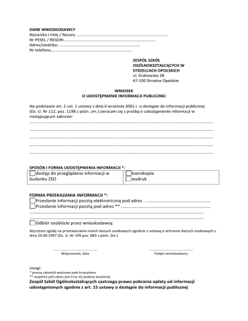 DANE WNIOSKODAWCY Nazwisko i Imię / Nazwa: ............................................................................... Nr PESEL / REGON ............................................................................... Adres/siedziba: ...................................................................... Nr telefonu...................................................................... ZESPÓŁ SZKÓŁ OGÓLNOKSZTAŁCĄCYCH W STRZELCACH OPOLSKICH ul. Krakowska 38 47-100 Strzelce Opolskie WNIOSEK O UDOSTĘPNIENIE INFORMACJI PUBLICZNEJ Na podstawie art. 2 ust. 1 ustawy z dnia 6 września 2001 r. o dostępie do informacji publicznej (Dz. U. Nr 112, poz. 1198 z późn. zm.) zwracam się z prośbą o udostępnienie informacji w następującym zakresie: ............................................................................................................................................................... ............................................................................................................................................................... ............................................................................................................................................................... ............................................................................................................................................................... ............................................................................................................................................................... SPOSÓB I FORMA UDOSTĘPNIENIA INFORMACJI *: dostęp do przeglądania informacji w budynku ZSO kserokopia wydruk FORMA PRZEKAZANIA INFORMACJI *: Przesłanie informacji pocztą elektroniczną pod adres . ................................................... Przesłanie informacji pocztą pod adres ** ....................................................................... .......................................................................................................................................... .......................................................................................................................................... Odbiór osobiście przez wnioskodawcę Wyrażam zgodę na przetwarzanie moich danych osobowych zgodnie z ustawą o ochronie danych osobowych z dnia 29.08.1997 (Dz. U. Nr 199 poz. 883 z późn. Zm.) …………………………………………… Miejscowość, data …………………………………………… Podpis wnioskodawcy Uwagi: * proszę zakreślić właściwe pole krzyżykiem ** wypełnić jeśli adres jest inny niż podany wcześniej Zespół Szkół Ogólnokształcących zastrzega prawo pobrania opłaty od informacji udostępnionych zgodnie z art. 15 ustawy o dostępie do informacji publicznej