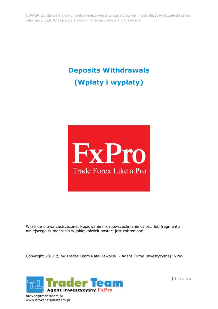 UWAGA: polska wersja dokumentu nie jest wersj wi prawnie i mo e s informacyjnych. Wi wersj dokumentu jest wersja angloj zyczna. wy cznie do celów Deposits Withdrawals (Wp aty i wyp aty) Wszelkie prawa zastrze one. Kopiowanie i rozpowszechnianie ca niniejszego t umaczenia w jakiejkolwiek postaci jest zabronione. ci lub fragmentu Copyright 2012 © by Trader Team Rafa Jaworski - Agent Firmy Inwestycyjnej FxPro 1|S t r o n a [email protected] www.broker.traderteam.pl UWAGA: polska wersja dokumentu nie jest wersj wi prawnie i mo e s informacyjnych. Wi wersj dokumentu jest wersja angloj zyczna. wy cznie do celów Moneybookers (skrill) Wp ata: Op aty ze strony FxPro: nie Op aty ze strony systemu Moneybookers: pokrywana przez FxPro Czas: zwykle do 1 h, max 1 dzie roboczy Wyp ata: Op aty ze strony FxPro: nie Op aty ze strony systemu Moneybookers: pokrywana przez FxPro Czas: 1 dzie roboczy Karta Kredytowa Wp ata: Op aty ze strony FxPro: 1,6% transakcji Op aty ze strony banków: tak Czas: do 1h Wyp ata: Op aty ze strony FxPro: nie Op aty ze strony banków: tak Czas: do max 2 dni roboczych Przelew bankowy SEPA Wp ata: Op aty ze strony FxPro: nie Op aty ze strony banków: tak Czas: 3-5 dni roboczych Wyp ata: Op aty ze strony FxPro: nie Op aty ze strony banków: tak ( Hellenic oko o 15 USD) 2|S t r o n a [email protected] www.broker.traderteam.pl UWAGA: polska wersja dokumentu nie jest wersj wi prawnie i mo e s informacyjnych. Wi wersj dokumentu jest wersja angloj zyczna. wy cznie do celów Czas: 3-5 dni roboczych ( +1 dzie na wys anie przelewu z FxPro) Je li waluta konta FxPro i waluta docelowego konta bankowego to EUR a bank klienta obs uguje przelewy SEPA to rodki zostan wyp acone bez udzia u banków po rednicz cych. PayPal Wp ata: Op aty ze strony FxPro: nie Op aty ze strony systemu Paypal : tak (zwykle oko o 2,7%, ale zale y od kraju, typu konta PP i czy konieczne jest przewalutowanie) Czas: zwykle do 1 h, max 1 dzie roboczy Wyp ata: Op aty ze strony FxPro: nie Op aty ze strony systemu Paypal: tak (zwykle oko o 2,7%, ale zale y od kraju, typu konta PP i czy konieczne jest przewalutowanie) Czas: 1 dzie roboczy Uwaga: adres zarejestrowany w PP musi zgadza si z adresem zarejestrowanym w FxPro. W innym przypadku b dziemy prosili o potwierdzenie adresu email co mo e prowadzi do opó nie . Ograniczenie dla pojedynczej transkacji wynosi €2500 na transakcj Neteller Wp ata: Op aty ze strony FxPro: nie Op aty ze strony systemu Neteller: tak Czas: zwykle do 1 h, max 1 dzie roboczy Wyp ata: Op aty ze strony FxPro: nie Op aty ze strony systemu Neteller: tak Czas: 1 dzie roboczy 3|S t r o n a [email protected] www.broker.traderteam.pl