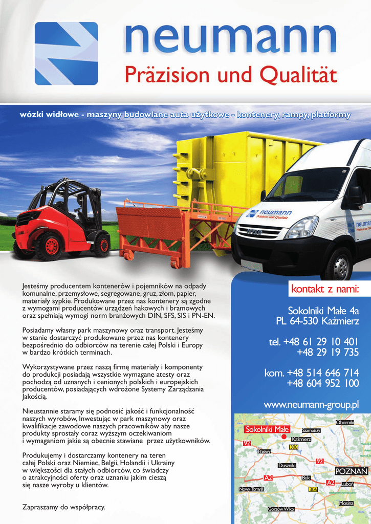 wózki wid³owe - maszyny budowlane auta u¿ytkowe - kontenery, rampy, platformy Jesteœmy producentem kontenerów i pojemników na odpady komunalne, przemys³owe, segregowane, gruz, z³om, papier, materia³y sypkie. Produkowane przez nas kontenery s¹ zgodne z wymogami producentów urz¹dzeñ hakowych i bramowych oraz spe³niaj¹ wymogi norm bran¿owych DIN, SFS, SIS i PN-EN. kontakt z nami: Sokolniki Ma³e 4a PL 64-530 KaŸmierz Posiadamy w³asny park maszynowy oraz transport. Jesteœmy w stanie dostarczyæ produkowane przez nas kontenery bezpoœrednio do odbiorców na terenie ca³ej Polski i Europy w bardzo krótkich terminach. tel. +48 61 29 10 401 +48 29 19 735 Wykorzystywane przez nasz¹ firmê materia³y i komponenty do produkcji posiadaj¹ wszystkie wymagane atesty oraz pochodz¹ od uznanych i cenionych polskich i europejskich producentów, posiadaj¹cych wdro¿one Systemy Zarz¹dzania Jakoœci¹. Nieustannie staramy siê podnosiæ jakoœæ i funkcjonalnoœæ naszych wyrobów, Inwestuj¹c w park maszynowy oraz kwalifikacje zawodowe naszych pracowników aby nasze produkty sprosta³y coraz wy¿szym oczekiwaniom i wymaganiom jakie s¹ obecnie stawiane przez u¿ytkowników. Produkujemy i dostarczamy kontenery na teren ca³ej Polski oraz Niemiec, Belgii, Holandii i Ukrainy w wiêkszoœci dla sta³ych odbiorców, co œwiadczy o atrakcyjnoœci oferty oraz uznaniu jakim ciesz¹ siê nasze wyroby u klientów. Zapraszamy do wspó³pracy. kom. +48 514 646 714 +48 604 952 100 www.neumann-group.pl Oborniki Sokolniki Ma³e Szamotu³y KaŸmierz 92 Pniewy 306 92 Duszniki A2 Nowy Tomyœl Buk POZNAÑ A2 Luboñ 306 Mosina Gorzów Wlkp. Producent kontenerów, pojemników koszy, wiat, konstrukcji stalowych SPRZEDA¯ - SERWIS - WYNAJEM wózków wid³owych i maszyn budowlanych czêœci, ogumienie, dokumentacja UDT i DTR Kontener SPC pojemnoœæ: od 40,0m3 Kontener ZAM pojemnoœæ: do 40,0m3 Ko³yska ZIP pojemnoœæ: od 0,5m3 P³ug LUK d³ugoœæ: od 1000mm Platforma OTW Koleba KOL d³ugoœæ: od 2000mm pojemnoœæ: od 0,5m3 Kontener OTW pojemnoœæ: od 1,3m3 Kontener BRA pojemnoœæ: od 1,9 m3 Rampa 10M d³ugoœæ: od 1000 - 20000mm Kontener MUL pojemnoœæ: od 1,3m3 www.neumann-group.pl