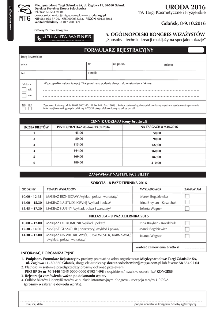 www.urodatargi.pl Międzynarodowe Targi Gdańskie SA, ul. Żaglowa 11, 80-560 Gdańsk Dyrektor Projektu: Dorota Solochewicz tel./ faks 58 554 92 04 [email protected], www.urodatargi.pl NIP 584 025 37 05, KRS0000038362, REGON 001363012 kapitał zakładowy 32 017 700 PLN Główny Partner Kongresu URODA 2016 19. Targi Kosmetyczne i Fryzjerskie Gdańsk, 8-9.10.2016 5. OGÓLNOPOLSKI KONGRES WIZAŻYSTÓW „Sposoby i techniki kreacji makijaży na specjalne okazje” FORMULARZ REJESTRACYJNY Imię i nazwisko ulica nr tel. e-mail: od poczt. miasto W przypadku wybrania opcji TAK prosimy o podanie danych do wystawienia faktury Faktura tak nie tak nie Zgodnie z Ustawą z dnia 18.07.2002 (Dz. U. Nr 144. Poz.1204) o świadczeniu usług drogą elektroniczną wyrażam zgodę na otrzymywanie informacji marketingowych od firmy MTG SA drogą elektroniczną na adres e-mail. CENNIK UDZIAŁU (ceny brutto zł) LICZBA BILETÓW PRZEDSPRZEDAŻ do dnia 13.09.2016 NA TARGACH 8-9.10.2016 1 45,00 50,00 2 80,00 90,00 3 115,00 127,00 4 144,00 160,00 5 169,00 187,00 6 189,00 210,00 ZAMAWIAMY NASTĘPUJĄCE BILETY SOBOTA - 8 PAŹDZIERNIKA 2016 GODZINY TEMATY WYKŁADÓW WYKŁADOWCA 10.00 - 12.45 MAKIJAŻ BIZNESOWY /wykład, pokaz i warsztaty/ Marek Bogdziewicz 14.00 – 15.30 MAKIJAŻ NA STUDNIÓWKĘ /wykład i pokaz/ Irina Braylian - Kovalchuk 15.45 – 17.30 MAKIJAŻ ŚLUBNY /wykład, pokaz i warsztaty/ Jolanta Wagner ZAMAWIAM NIEDZIELA - 9 PAŹDZIERNIKA 2016 10.00 – 12.00 MAKIJAŻ DO KOMUNII /wykład i pokaz/ Irina Braylian - Kovalchuk 12.30 - 14.00 MAKIJAŻ GLAMOUR ( błyszczący) /wykład i pokaz/ Marek Bogdziewicz 14.30 – 17.00 MAKIJAŻ NA WIELKIE WYJŚCIE /SYLWESTER, KARNAWAŁ/, /wykład, pokaz i warsztaty/ Jolanta Wagner wartość zamówienia brutto zł ............................ INFORMACJE ORGANIZACYJNE 1. Podpisany Formularz Rejestracyjny prosimy przesłać na adres organizatora: Międzynarodowe Targi Gdańskie SA, ul. Żaglowa 11, 80-560 Gdańsk, drogą elektroniczną: [email protected] lub faxem: 58 554 92 04 2. Płatności w systemie przedsprzedaży prosimy dokonać przelewem PKO BP SA nr 70 1440 1345 0000 0000 0193 1498 z dopiskiem /nazwisko uczestnika/ KONGRES 3. Rejestracja zamówienia ważna po dokonaniu wpłaty 4. Odbiór biletów i identyfikatorów w punkcie informacyjnym Kongresu - recepcja targów URODA (prosimy o zabranie dowodu wpłaty). miejsce, data podpis uczestnika kongersu / osoby zgłaszającej