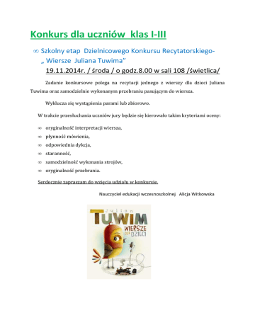 Konkurs dla uczniów klas I-III • Szkolny etap Dzielnicowego Konkursu Recytatorskiego„ Wiersze Juliana Tuwima” 19.11.2014r. / środa / o godz.8.00 w sali 108 /świetlica/ Zadanie konkursowe polega na recytacji jednego z wierszy dla dzieci Juliana Tuwima oraz samodzielnie wykonanym przebraniu pasującym do wiersza. Wyklucza się wystąpienia parami lub zbiorowo. W trakcie przesłuchania uczniów jury będzie się kierowało takim kryteriami oceny: • oryginalność interpretacji wiersza, • płynność mówienia, • odpowiednia dykcja, • staranność, • samodzielność wykonania strojów, • oryginalność przebrania. Serdecznie zapraszam do wzięcia udziału w konkursie. Nauczyciel edukacji wczesnoszkolnej Alicja Witkowska Konkurs dla uczniów klas I-III • Szkolny etap Dzielnicowego Konkursu Plastycznego – „ Julian Tuwim i Jego wiersze dla dzieci” Uczniowie wykonują indywidualnie i samodzielnie portret Juliana Tuwima lub ilustrację do wybranego wiersza poety, w dowolnej technice płaskiej np.: pastele, farby plakatowe, akwarele, rysunek kredkami, ołówkiem, wydzieranka, wycinanka, collage, haft, witraż, techniki mieszane. Prace należy wykonać w formacie A4 lub A3. Prace przestrzenne oraz w innym formacie nie będą podlegały ocenie. Wykonane prace należy podpisać na odwrocie swoim imieniem i nazwiskiem oraz podać nazwę klasy i tytuł wiersza. Kryteria oceny prac plastycznych: - zgodność z tematem, - ciekawa interpretacja, - inwencja twórcza, - walory artystyczne, - estetyka pracy. Prace należy wykonać do 24. 11.2014r./poniedziałek/ i dostarczyć do p. Lidii Andrzejewskiej/ sala 112/ lub p. Alicji Witkowskiej / sala 103/. Serdecznie zapraszamy do wzięcia udziału w konkursie. Nauczyciele edukacji wczesnoszkolnej i plastyki