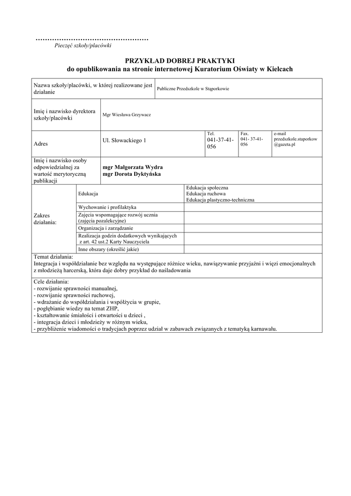 ………………………………………… Pieczęć szkoły/placówki PRZYKŁAD DOBREJ PRAKTYKI do opublikowania na stronie internetowej Kuratorium Oświaty w Kielcach Nazwa szkoły/placówki, w której realizowane jest Publiczne Przedszkole w Stąporkowie działanie Imię i nazwisko dyrektora szkoły/placówki Mgr Wiesława Grzywacz Tel. Ul. Słowackiego 1 Adres Imię i nazwisko osoby odpowiedzialnej za wartość merytoryczną publikacji Fax. 041- 37-41056 e-mail przedszkole.staporkow @gazeta.pl mgr Małgorzata Wydra mgr Dorota Dyktyńska Edukacja Zakres działania: 041-37-41056 Edukacja społeczna Edukacja ruchowa Edukacja plastyczno-techniczna Wychowanie i profilaktyka Zajęcia wspomagające rozwój ucznia (zajęcia pozalekcyjne) Organizacja i zarządzanie Realizacja godzin dodatkowych wynikających z art. 42 ust.2 Karty Nauczyciela Inne obszary (określić jakie) Temat działania: Integracja i współdziałanie bez względu na występujące różnice wieku, nawiązywanie przyjaźni i więzi emocjonalnych z młodzieżą harcerską, która daje dobry przykład do naśladowania Cele działania: - rozwijanie sprawności manualnej, - rozwijanie sprawności ruchowej, - wdrażanie do współdziałania i współżycia w grupie, - pogłębianie wiedzy na temat ZHP, - kształtowanie śmiałości i otwartości u dzieci , - integracja dzieci i młodzieży w różnym wieku, - przybliżenie wiadomości o tradycjach poprzez udział w zabawach związanych z tematyką karnawału. Opis działania: We wrześniu w ramach podjęcia współpracy grupy przedszkolnej Stokrotki z 6 Konecką Drużyną Harcerską ze Stąporkowa w roku szkolnym 2011/2012 odbyło się pierwsze spotkanie pod hasłem „Rajd Zręcznościowy”. Na początku spotkania (ponieważ był to pierwszy kontakt dzieci przedszkolnych z harcerzami) wszyscy uważnie słuchali o życiu harcerskim a drużynowa Justyna Serek prezentowała swój strój harcerski i odznaki. Druhowie i druhny przygotowali dla dzieci podzielonych na cztery grupy rajd zręcznościowy. Każda grupa musiała przejść przez cztery stanowiska: rzut kulką z gazety do obręczy, toczenie kołem hula-hop, przeniesienie jajka na łyżce i „gąsienica”, która była zadaniem najciekawszym, ponieważ trzeba było przejść pod tunelem zrobionym przez kolegów, stojących w rozkroku. Podczas wykonywania zadań dzieci zdobywały punkty. Przy każdej zmianie stanowisk przedszkolaki bawiły się w zabawy i pląsy harcerskie. W grudniu harcerze i harcerki odwiedziły dzieci przedszkolne drugi raz niosąc i przekazując na ręce wychowawczyni Stokrotek Betlejemskie Światełko Pokoju. Betlejemskie Światło Pokoju jest symbolem pokoju, wzajemnego zrozumienia poszczególnych ludzi i narodów, jest znakiem nadziei życia pozbawionego konfliktów i waśni. Harcerze, roznosząc Betlejemski Ogień po całym kraju i przekazując go poza granice Polski, pełnią służbę, ulepszają świat. Działając w swoim mieście, regionie, najbliższej okolicy, pokazują, co oznacza niesienie pokoju oraz idei braterstwa. W styczniu odbyło się kolejne spotkanie, tym razem, pod hasłem „Karnawał z harcerzami”. Zaraz po śniadaniu dużą grupą do sali przedszkolnej przybyli harcerze. Po wspólnym przywitaniu się wszyscy przystąpili do projektowania masek karnawałowych. Harcerze pomagali dzieciom przedszkolnym tworzyć maski . Było przy tym dużo zabawy. Po wykonanej pracy posprzątano a maski karnawałowe dzieci i harcerze nałożyli na głowy. Wszyscy zaczęli uczestniczyć w zabawach zorganizowanych przez harcerzy. Odbyły się tańce i pląsy przy muzyce i piosenkach przedszkolnych. Przedszkolaki nauczyły się kilku zabaw harcerskich. Przeprowadzone były różne konkursy i quizy, dzięki którym dzieci stawały się coraz śmielsze. Cieszyły się z postępów wykonywanych zadań i dumnie prezentowały swoje możliwości taneczne. Nad całością czuwała nauczycielka z przedszkola i drużynowa. Spotkanie zakończyło się zabawą harcerską Iskierką. Opis uzyskanych efektów: - poznawanie możliwości manualnych dzieci, - poznawanie możliwości swojego ciała przez dzieci, - stwarzanie warunków sprzyjających wspólnej zabawie dzieci i młodzież, - aktywne spędzanie czasu i współorganizowanie zabaw w przedszkolu, - kształtowanie integracji pomiędzy małymi dziećmi i młodzieżą, - poznawanie wiadomości dotyczących jednego z najstarszych związków zrzeszających dzieci i młodzież. Wnioski z realizacji: - umiejętność współdziałania w grupie różnowiekowej, - integracja dzieci i młodzieży, - dostarczenie radości ze wspólnego uczestnictwa w spotkaniu, - kontynuacja spotkań tego typu w kolejnych latach pracy, - włączanie harcerzy do organizacji i aktywnego uczestnictwa w życiu przedszkolnym. Instytucje wspomagające realizację podjętych działań: Współpraca z 6 Konecką Drużyna Harcerską im. Szarych Szeregów Uzasadnienie zgłoszenia: Organizując tego typu spotkania miałam na celu przybliżenie sposobów integrowania się i czynnego uczestnictwa małych dzieci i młodzieży we wspólnej zabawie. Zorganizowane zabawy i zajęcia przez młodzież prowadziły do śmiałości i otwartości małych dzieci. W czasie spotkania przedszkolaki chętnie brały udział w różnych konkursach, śmiały się i cieszyły ze swoich wykonanych prac i zadań. Nawiązały się więzi emocjonalne mimo dzielącej dużej różnicy wieku. Trudności w realizacji: Nie zaistniały Wykaz załączników: zdjęcia Wyrażam zgodę na opublikowanie na stronie internetowej Kuratorium Oświaty w Kielcach przedstawionego przykładu dobrej praktyki. …………………………………………. Miejscowość, data …………………………………………… Podpis dyrektora szkoły/placówki Przykłady dobrej praktyki można przesyłać pocztą elektroniczną na adres [email protected] Wymagania: 1. Opracowanie proszę przygotować w formie plików tekstowych: