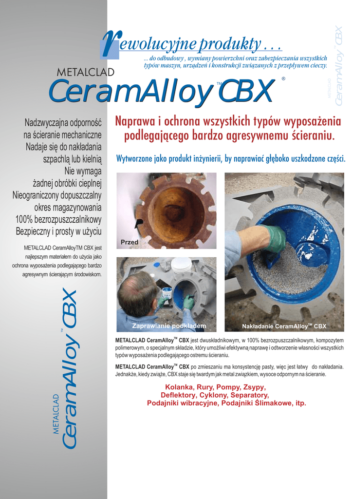 CeramAlloy CBX ® TM METALCLAD TM CeramAlloy CBX METALCLAD CeramAlloyTM CBX jest najlepszym materiałem do użycia jako ochrona wyposażenia podlegającego bardzo agresywnym ścierającym środowiskom. METALCLAD ... do odbudowy , wymiany powierzchni oraz zabezpieczania wszystkich typów maszyn, urz¹dzeñ i konstrukcji zwi¹zanych z przep³ywem cieczy. METALCLAD Nadzwyczajna odporność na ścieranie mechaniczne Nadaje się do nakładania szpachlą lub kielnią Nie wymaga żadnej obróbki cieplnej Nieograniczony dopuszczalny okres magazynowania 100% bezrozpuszczalnikowy Bezpieczny i prosty w użyciu TM ewolucyjne produkty . . . CeramAlloy CBX r Naprawa i ochrona wszystkich typów wyposa¿enia podlegaj¹cego bardzo agresywnemu œcieraniu. Wytworzone jako produkt in¿ynierii, by naprawiaæ g³êboko uszkodzone czêœci. Przed Zaprawianie podkładem Nakładanie CeramAlloyTM CBX METALCLAD CeramAlloyTM CBX jest dwuskładnikowym, w 100% bezrozpuszczalnikowym, kompozytem polimerowym, o specjalnym składzie, który umożliwi efektywną naprawę i odtworzenie własności wszystkich typów wyposażenia podlegającego ostremu ścieraniu. METALCLAD CeramAlloyTM CBX po zmieszaniu ma konsystencję pasty, więc jest łatwy do nakładania. Jednakże, kiedy zwiąże, CBX staje się twardym jak metal związkiem, wysoce odpornym na ścieranie. Kolanka, Rury, Pompy, Zsypy, Deflektory, Cyklony, Separatory, Podajniki wibracyjne, Podajniki Ślimakowe, itp. Stosowanie CeramAlloy® CBX Dane Techniczne ® 1790 cm3 2,76 g/cm3 0,35 m2 Objętość 5 kg. Gęstość Powierzchnia z 5 kg przy grubości warstwy 5mm Czas składowania Części stałe objętościowo Proporcja mieszania Baza Objętościowo 5 Wagowo 7 Nieograniczony 100% Aktywator 2 2 Wypełniacz 14 20 Czasy utwardzania Temperatura otoczenia 15oC 25oC 30oC Czas pracy 30 min 20 min 15 min Pełne mechaniczne 48 godz. 24 godz. 16 godz. W³aœciwoœci fizyczne Zanurzenie chemiczne 3 dni 2 dni 1 dni Typical Values Test Method 2 Wytrzymałość na ściskanie 16000 psi Wytrzymałość na zginanie 6000 psi Twardość (Shore D) 86 Wytrzymałość na rozciąganie 2500 psi 1125 kg/cm 422 kg/cm2 2 176 kg/cm ASTM D-695 ASTM D-790 ASTM D-2240 ASTM D-2370 Naprężenie zrywające w miejscu połączenia (CL+AC zaprawa podkładowa do podłoża) Stal Aluminum Miedź Stal nierdzewna 4000 psi 2500 psi 3000 psi 4100 psi 280 kg/cm2 175 kg/cm2 210 kg/cm2 287 kg/cm2 ASTM D-1002 ASTM D-1002 ASTM D-1002 ASTM D-1002 Odpornoœæ chemiczna Kwas octowy (0-10%) . . . . . Wodorotlenek amonu (0-10%) Paliwo lotnicze . . . . . . . . Alkohol butylowy . . . . . . . Chlorek wapnia . . . . . . . . Ropa naftowa . . . . . . . . . Olej napędowy . . . . . . . . Alkohol etylowy . . . . . . . . Benzyna . . . . . . . . . . . Heptan . . . . . . . . . . . Kwas solny (0-10%) . . . . . Kwas solny (10-20%) . . . . . Nafta . . . . . . . . . . . . . r . . . . . . . . . . . . . . . . . . . . . . . . . . G EX EX EX EX EX EX G EX EX EX G EX Alkohol metylowy . . . . Olej mineralny . . . . . Kwas azotowy (0-10%) . Kwas azotowy (10-20%) Kwas fosforowy (0-10%) Chlorek potasu . . . . . Alkohol propylowy . . . . Chlorek sodowy . . . . . Wodorotlenek sodowy . Kwas siarkowy (0-10%). Kwas siarkowy (10-20%) Toluen . . . . . . . . Ksylen . . . . . . . . . . . . . . . . . . . . . . . . . . . . . . . . . . . . . . . . . . . . . . . . . . . . . . . . . . . . . . . . . . . . . . . . . G EX EX G G EX EX EX EX EX G G EX EX - Odpowiednie do większości zastosowań włącznie z zanurzeniem. G - Odpowiednie do okresowego kontaktu, jak ochlapanie itp. ewolucyjne produkty . . . ... do odbudowy , wymiany powierzchni oraz zabezpieczania wszystkich typów maszyn, urz¹dzeñ i konstrukcji zwi¹zanych z przep³ywem cieczy. Kontakt do eksperta Przygotowanie powierzchni - CeramAlloy CBX powinien zostać naniesiony tylko na czyste, suche, mocne i szorstkie powierzchnie. 1. Usunąć wszelki luźny materiał i zanieczyszczenie z powierzchni. 2. Zależnie od powierzchni, oczyścić rozpuszczalnikiem lub usunąć zanieczyszczenia przez piaskowanie / śrutowanie, czyszczenie parą, zmywanie pod ciśnieniem albo inny odpowiedni sposób. 3. Po usunięciu wszelkich powierzchniowych i podpowierzchniowych zanieczyszczeń, spłukać obszar o ile to konieczne i pozwolić mu całkowicie wyschnąć. Położenie podkładu - Jako zaprawa podkładowa, do każdych 5 kg zestawu ® CeramAlloy® CBX jest dostarczona jednostka zawierająca 250 g CeramAlloy CL + AC. Wlać zawartość pojemnika z Aktywatorem do pojemnika z Bazą i dokładnie zmieszać. Obszar, który ma być zabezpieczany, należy posmarować podkładem w postaci zmieszanego CeramAlloy® CL + AC używając pędzla o sztywnym włosiu. Jako wartość informacyjną podajemy, że powinno się otrzymać warstwę o grubości równej w przybliżeniu 0,25 - 0,30 mm. Kładzenie podkładu powinno zostać zakończone w okresie do 45 minut od momentu zmieszania. W idealnej sytuacji zewnętrzna powłoka z CeramAlloy® CBX powinna zostać wykonana kiedy podkładowa warstwa CL + AC jest tylko trochę lepka i na pewno w okresie do 8 godzin czasu zastosowania. [Uwaga: CeramAlloy® CL + AC jest dostępny oddzielnie jako zaprawa podkładowa dla 20 kg jednostek CeramAlloy® CBX.] Mieszanie i nakładanie - Dla wygody użytkownika składniki METALCLAD CeramAlloy® CBX: Baza, Aktywator i Wypełniacz są dostarczane w dokładnie zmierzonych ilościach, by uprościć mieszanie i otrzymanie pełnych jednostek. Jeśli potrzebna jest tylko niewielka porcja materiału, należy odmierzyć 5 części Bazy i 2 części Aktywatora z 14 częściami wypełniacza, licząc objętościowo. Aby ułatwić mieszanie pełnych jednostek, zdecydowanie zaleca się zastosować mechaniczne urządzenie mieszające. Połączyć Bazę i Aktywator w dużym, plastikowym wiaderku i przy włączonym urządzeniu mieszającym, powoli dodawać wypełniacz. Nakładać zmieszany CeramAlloy® CBX na przygotowaną i zaprawioną powierzchnię, używając kieln