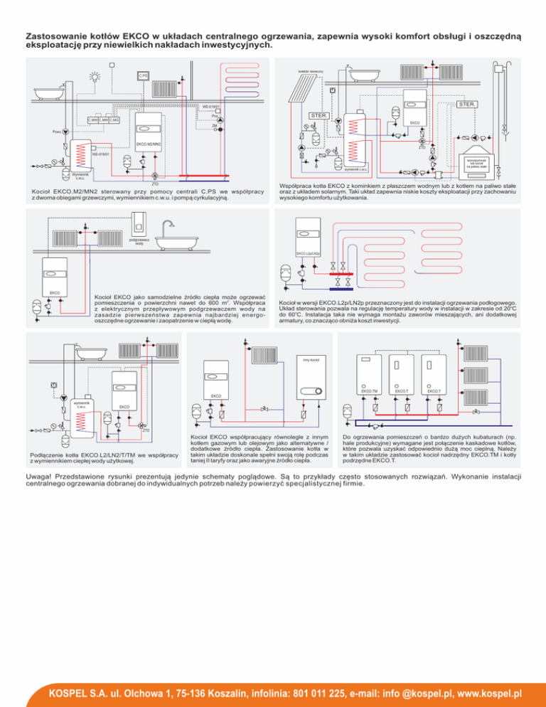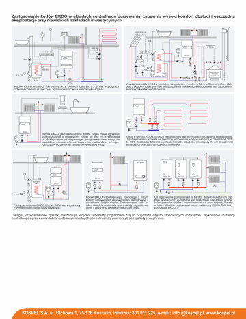 Zastosowanie kotłów EKCO w układach centralnego ogrzewania, zapewnia wysoki komfort obsługi i oszczędną eksploatację przy niewielkich nakładach inwestycyjnych. kolektor słoneczny C.PS STER. WE-019/01 Pco. STER. C.MW C.MW C.MG EKCO ZM Pcwu. EKCO.M2/MN2 ZTD WE-019/01 termokominek lub kocioł na paliwo stałe wymiennik c.w.u. Wymiennik c.w.u. ZTD Kocioł EKCO.M2/MN2 sterowany przy pomocy centrali C.PS we współpracy z dwoma obiegami grzewczymi, wymiennikiem c.w.u. i pompą cyrkulacyjną. Współpraca kotła EKCO z kominkiem z płaszczem wodnym lub z kotłem na paliwo stałe oraz z układem solarnym. Taki układ zapewnia niskie koszty eksploatacji przy zachowaniu wysokiego komfortu użytkowania. podgrzewacz wody EKCO.L2p/LN2p EKCO Kocioł EKCO jako samodzielne źródło ciepła może ogrzewać 2 pomieszczenia o powierzchni nawet do 600 m . Współpraca z elektrycznym przepływowym podgrzewaczem wody na zasadzie pierwszeństwa zapewnia najbardziej energooszczędne ogrzewanie i zaopatrzenie w ciepłą wodę. Kocioł w wersji EKCO.L2p/LN2p przeznaczony jest do instalacji ogrzewania podłogowego. o Układ sterowania pozwala na regulację temperatury wody w instalacji w zakresie od 20 C o do 60 C. Instalacja taka nie wymaga montażu zaworów mieszających, ani dodatkowej armatury, co znacząco obniża koszt inwestycji. inny kocioł EKCO.TM EKCO.T EKCO.T EKCO wymiennik c.w.u. EKCO ZTD Podłączenie kotła EKCO.L2/LN2/T/TM we współpracy z wymiennikiem ciepłej wody użytkowej. Kocioł EKCO współpracujący równolegle z innym kotłem gazowym lub olejowym jako alternatywne / dodatkowe źródło ciepła. Zastosowanie kotła w takim układzie doskonale spełni swoją rolę podczas taniej II taryfy oraz jako awaryjne źródło ciepła. Do ogrzewania pomieszczeń o bardzo dużych kubaturach (np. hale produkcyjne) wymagane jest połączenie kaskadowe kotłów, które pozwala uzyskać odpowiednio dużą moc cieplną. Należy w takim układzie zastosować kocioł nadrzędny EKCO.TM i kotły podrzędne EKCO.T. Uwaga! Przedstawione rysunki prezentują jedynie schematy poglądowe. Są to przykłady często stosowanych rozwiązań. Wykonanie instalacji centralnego ogrzewania dobranej do indywidualnych potrzeb należy powierzyć specjalistycznej firmie. KOSPEL S.A. ul. Olchowa 1, 75-136 Koszalin, infolinia: 801 011 225, e-mail: info @kospel.pl, www.kospel.pl