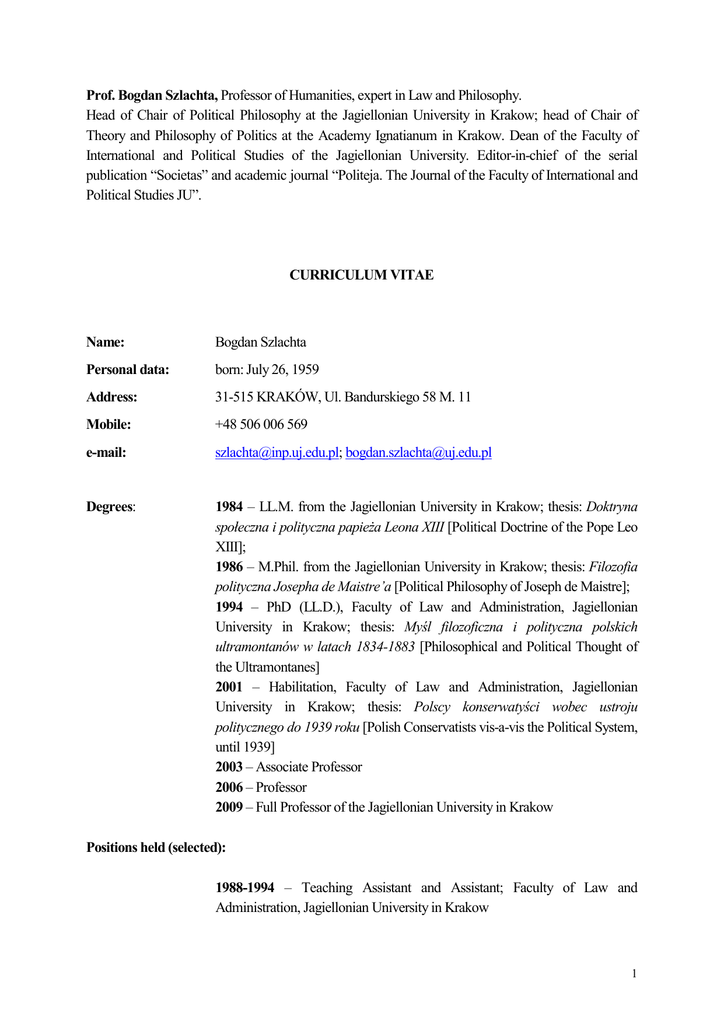 Prof. Bogdan Szlachta, Professor of Humanities, expert in Law and Philosophy. Head of Chair of Political Philosophy at the Jagiellonian University in Krakow; head of Chair of Theory and Philosophy of Politics at the Academy Ignatianum in Krakow. Dean of the Faculty of International and Political Studies of the Jagiellonian University. Editor-in-chief of the serial publication “Societas” and academic journal “Politeja. The Journal of the Faculty of International and Political Studies JU”. CURRICULUM VITAE Name: Bogdan Szlachta Personal data: born: July 26, 1959 Address: 31-515 KRAKÓW, Ul. Bandurskiego 58 M. 11 Mobile: +48 506 006 569 e-mail: [email protected]; [email protected] Degrees: 1984 – LL.M. from the Jagiellonian University in Krakow; thesis: Doktryna społeczna i polityczna papieża Leona XIII [Political Doctrine of the Pope Leo XIII]; 1986 – M.Phil. from the Jagiellonian University in Krakow; thesis: Filozofia polityczna Josepha de Maistre’a [Political Philosophy of Joseph de Maistre]; 1994 – PhD (LL.D.), Faculty of Law and Administration, Jagiellonian University in Krakow; thesis: Myśl filozoficzna i polityczna polskich ultramontanów w latach 1834-1883 [Philosophical and Political Thought of the Ultramontanes] 2001 – Habilitation, Faculty of Law and Administration, Jagiellonian University in Krakow; thesis: Polscy konserwatyści wobec ustroju politycznego do 1939 roku [Polish Conservatists vis-a-vis the Political System, until 1939] 2003 – Associate Professor 2006 – Professor 2009 – Full Professor of the Jagiellonian University in Krakow Positions held (selected): 1988-1994 – Teaching Assistant and Assistant; Faculty of Law and Administration, Jagiellonian University in Krakow 1 1995-2001 – Assistant Professor; Faculty of Law and Administration, Jagiellonian University in Krakow 2001-2003 – Assistant Professor; Faculty of International and Political Studies, Institute of Political Sciences and International Relations, Jagiellonian University in Krakow 2001-2003 – Director of the Institute of Human Rights in Oświęcim, and the Editor of the Bulletin of the Institute of Human Rights in Oświęcim 2003-2006 – Associate Professor; Department of the History of Political Thought, Jagiellonian University in Krakow 2003-till date – Editor-in-chief of “Politeja. The Journal of the Faculty of International and Political Studies of the Jagiellonian University”; 2002-2005 – Deputy Head of the Institute of Political Sciences and International Relations, Jagiellonian University in Krakow 2005-2008 – Deputy Dean of the Faculty of International and Political Studies, Jagiellonian University in Krakow 2006-till date – Head of Chair of Philosophy of Politics, Jagiellonian University in Krakow 2008-till date – Dean of the Faculty of International and Political Studies, Jagiellonian University in Krakow 2014-till date – Member of Academia Europaea, London Academic experience (selected): 1990-1991 – several series of lectures dedicated to contemporary philosophy of politics (Vilnius University, Lithuania) 1992-till date – cooperation with the Centre for Political Thought in Krakow (series of lectures; seminars dedicated to the philosophy of St. Thomas Aquinas, the encyclical Centesimus annus, and Aristotle) 1994 – research fellowship in the UK (University of Aberystwyth) 1994-2004 – the editor of fifteen volumes of source texts from various fields (philosophy, history of political and legal doctrines, history of the Polish political thought, philosophy of politics) 1995 – nineteen lectures dedicated to relations between the Church and the State in the history of political thought (for Radio Vaticana) 1996: Ład - Kościół - Naród. Filozofia i myśl polityczna polskich ultramontanów w latach 1834-1883 [Order – Church – Nation. Philosophy and Political Thought of the Polish Ultramontanes], a monograph 1997 – research fellowship in the UK (Oxford University, St. Hugh’s College) 2 1998: Konserwatyzm. Z dziejów tradycji myślenia o polityce [Conservatism. From the History of Thought about Politics], a monograph 2000: Z dziejów polskiego konserwatyzmu [From the History of Polish Conservatism], a monograph 2000: Polscy konserwatyści wobec ustroju politycznego do 1939 roku [Polish Conservatists vis-a-vis the Political System until 1939]; a monograph 2000-till date – President of the Editorial Committee of the series: “Library of the Classics of Polish Political Thought” 2001: Monarchia prawa. Szkice z historii angielskiej myśli politycznej do końca epoki Plantagenetów [A Monarchy of Law. Sketches from the History of the English Political Thought, until the End of the Plantagenets’ Epoch], a monograph 2001 – research fellowship in the UK (Oxford University, St. Hugh’s College) 2004 – research fellowship in London (The Lanckoroński Foundation) 2004 – Scientific Editor of the Social Dictionary (p. 1714), Kraków 2004 2005: Konstytucjonalizm czy absolutyzm? Szkice z francuskiej myśli politycznej XVI wieku [Constitutionalism or Absolutism? Sketches from the 16th Century French Political Thought], a monograph 2006 – two research visits to the UK 2006-till date: Editor-in-chief of academic journal “Politeja. Journal of the Faculty of International and Political Studies” 2007: Encyklopedia polityczna, t. I: Myśl polityczna: główne pojęcia, doktryny i formy ustroju [Encyclopaedia of Politics, vol. 1: Political Thought: the main notions, doctrines and forms of political systems]; a book prepared in cooperation with Prof. Jacek Bartyzel i Dr. Adam Wielomski 2008: Monarchia prawa? Angielska myśl polityczna doby Tudorów [A Monarchy of Law? English Political Thought in the Times of Tudors], a monograph 2008-till date: Editor-in-chief of the serial publication “Societas” (over seventeen books) 2008-2014: four collections of articles 2001-2014: academic supervision over fourteen defended doctoral thesis and 
